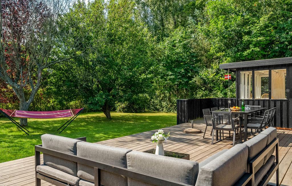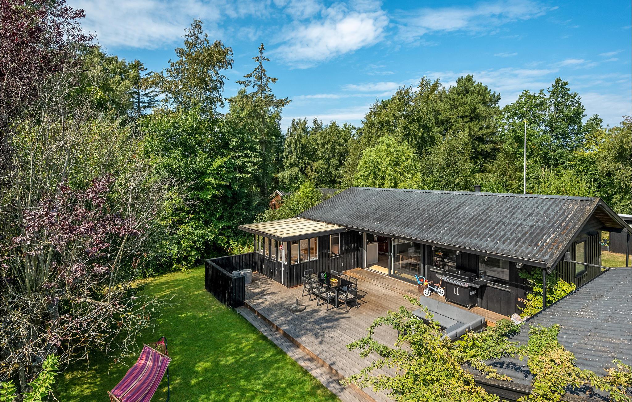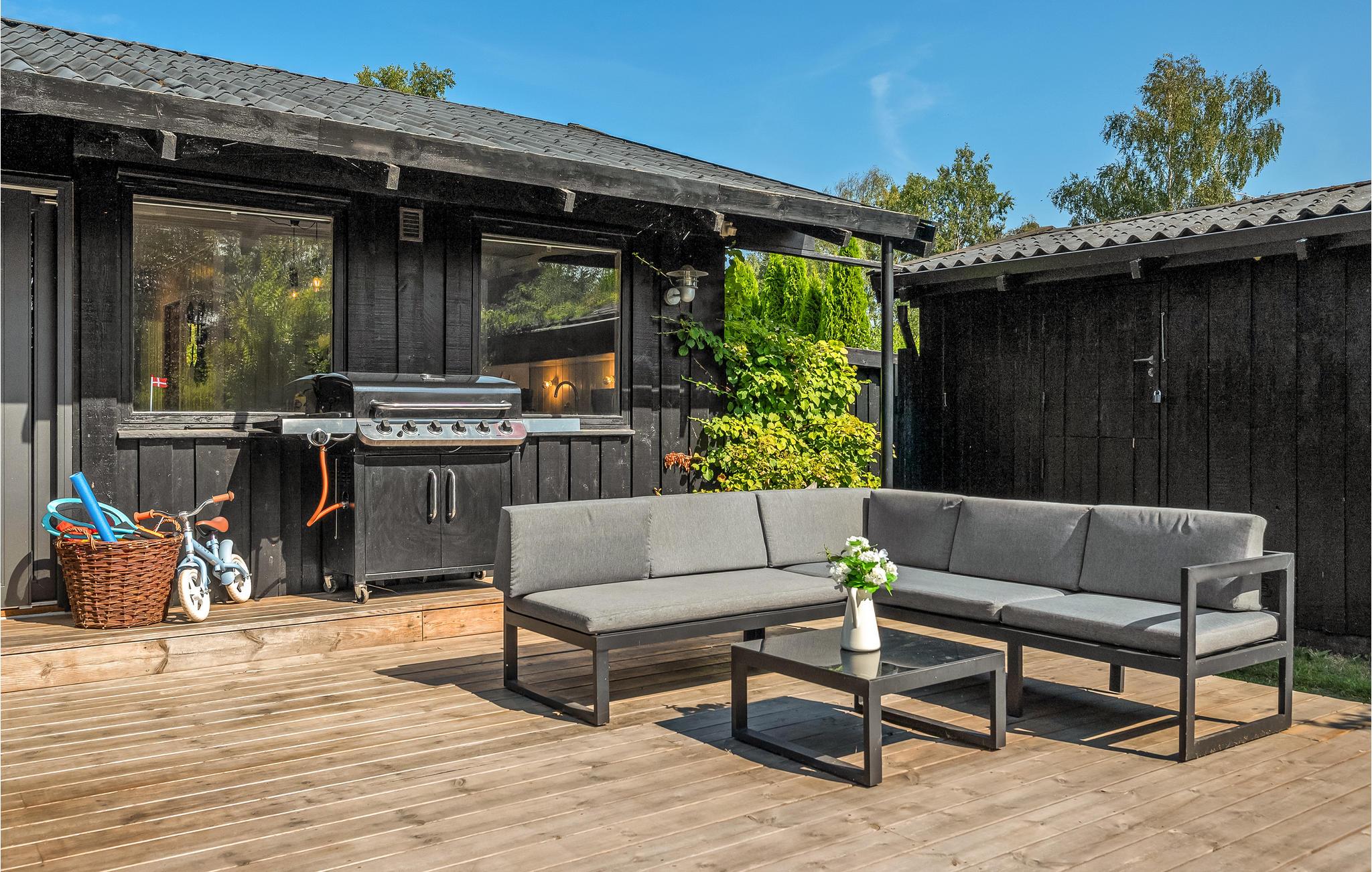 Fra stuen kan I træde ud på den store træterrasse med lounge og havemøbler, hvor I kan slappe af i det fri. I haven kan de små finde legetøj og masser af plads til at slå sig løs i haven. Sæt jer godt til rette i hængekøjen med en god bog, mens I beundrer de forbipasserende skyer fra tid til anden.