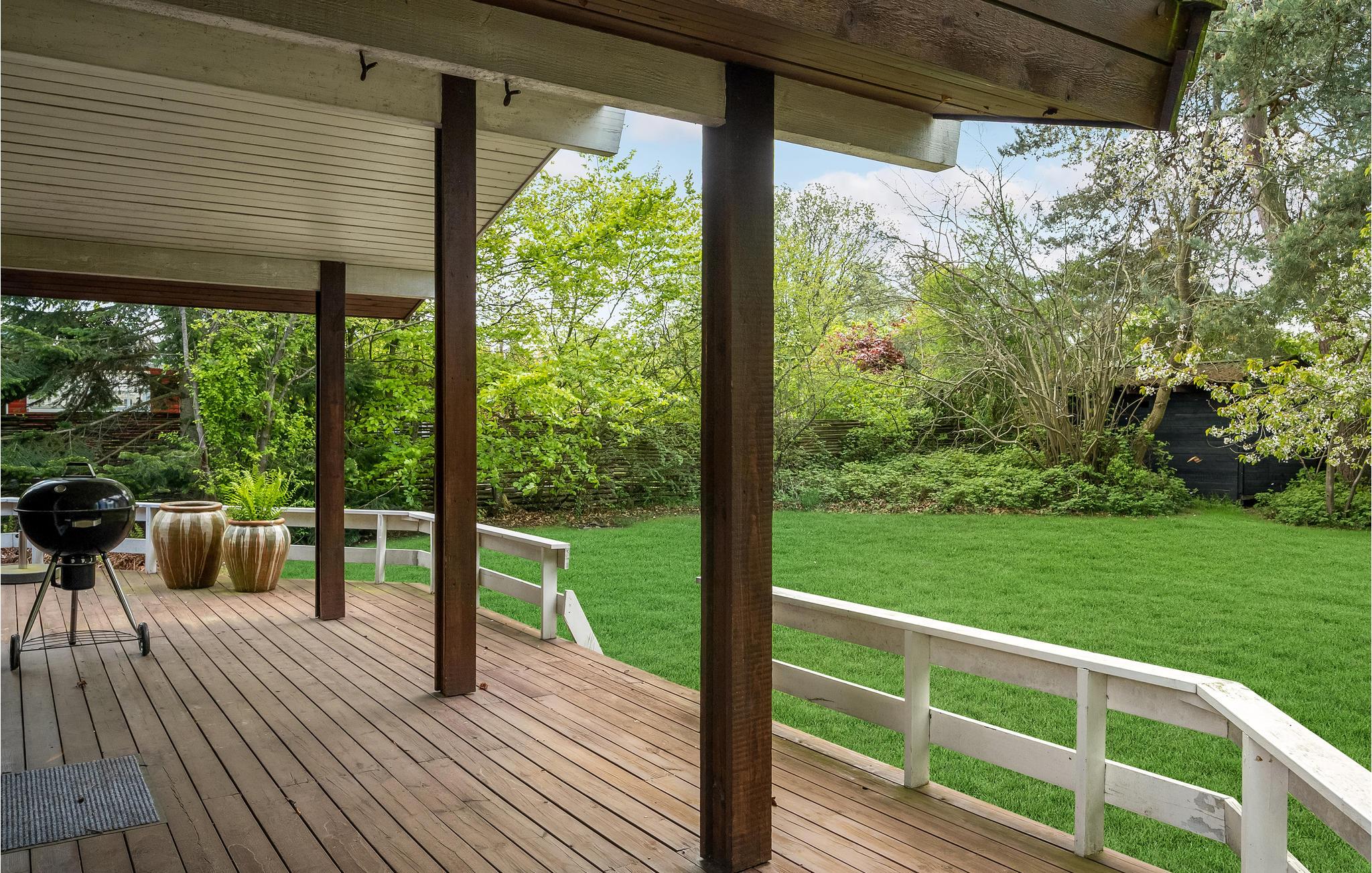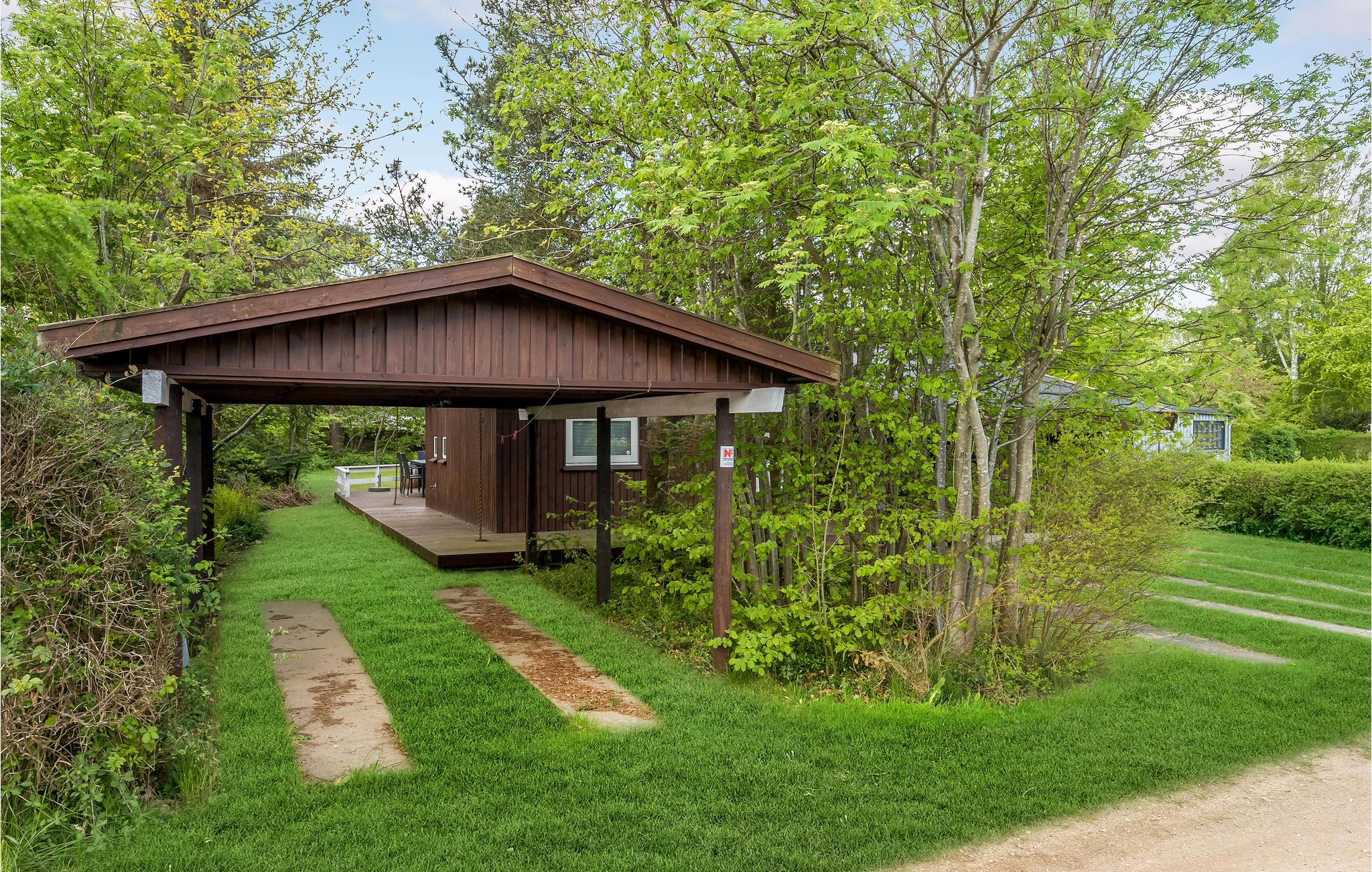 Vælg mellem en åben (20 m²) og en overdækket (12 m²) terrasse og nyd udsigten til den rummelige naturgrund. Der er en carport og to ekstra parkeringspladser til jeres biler.