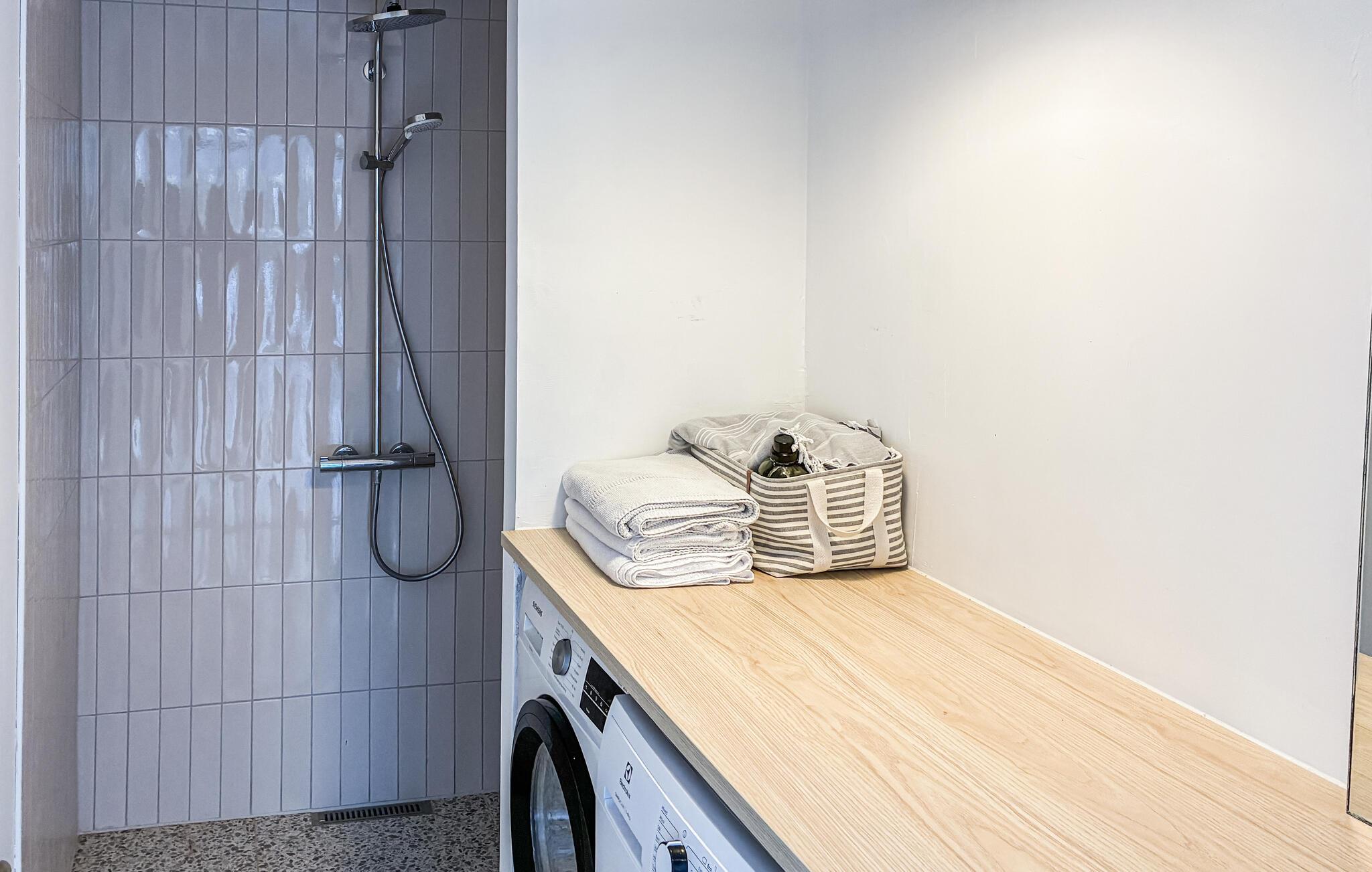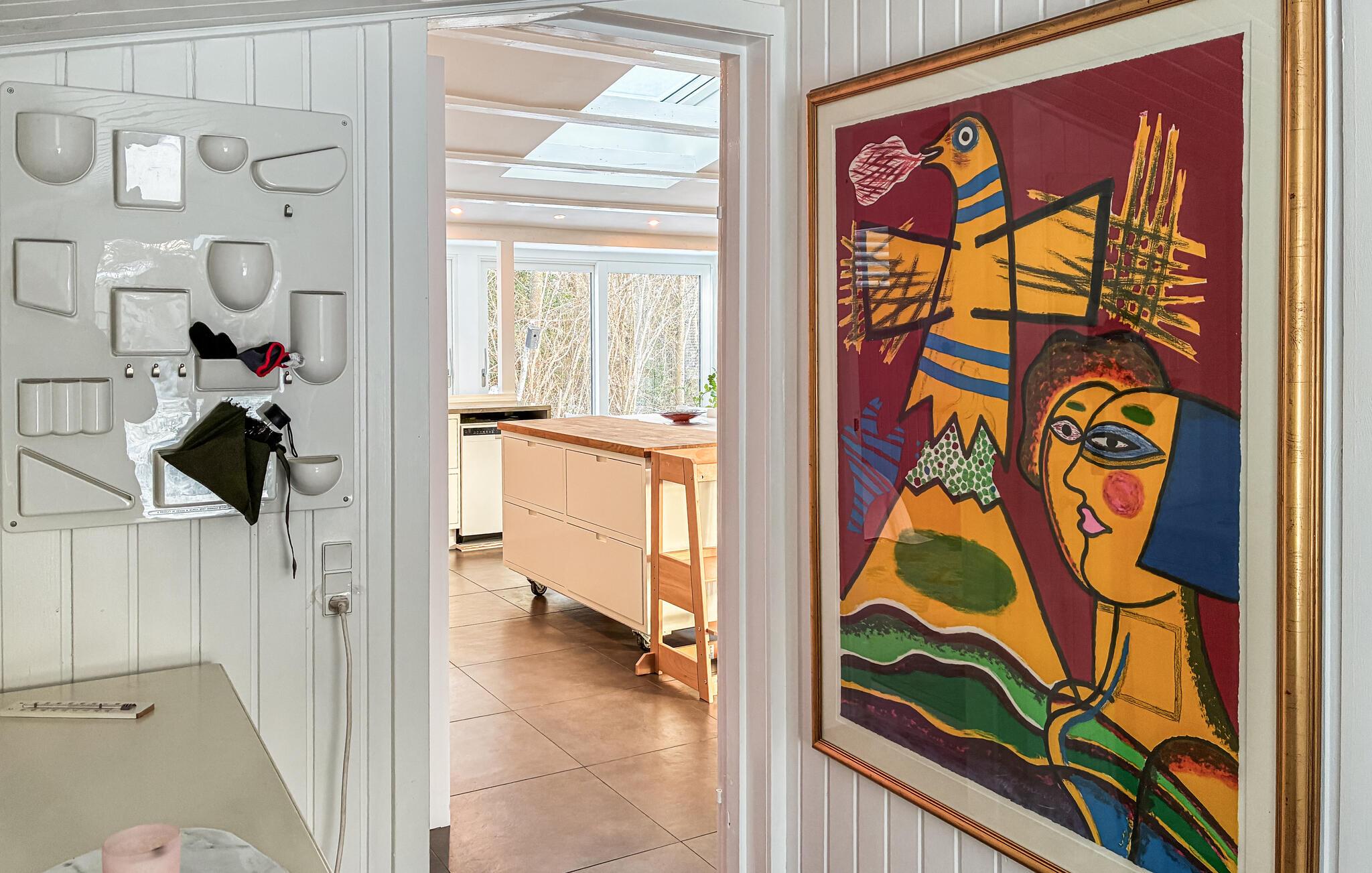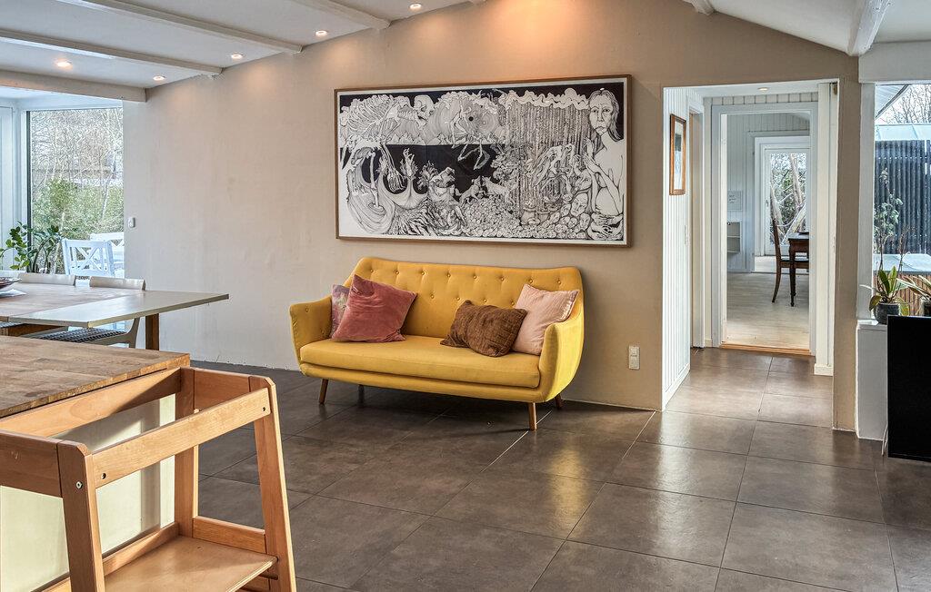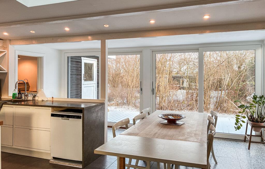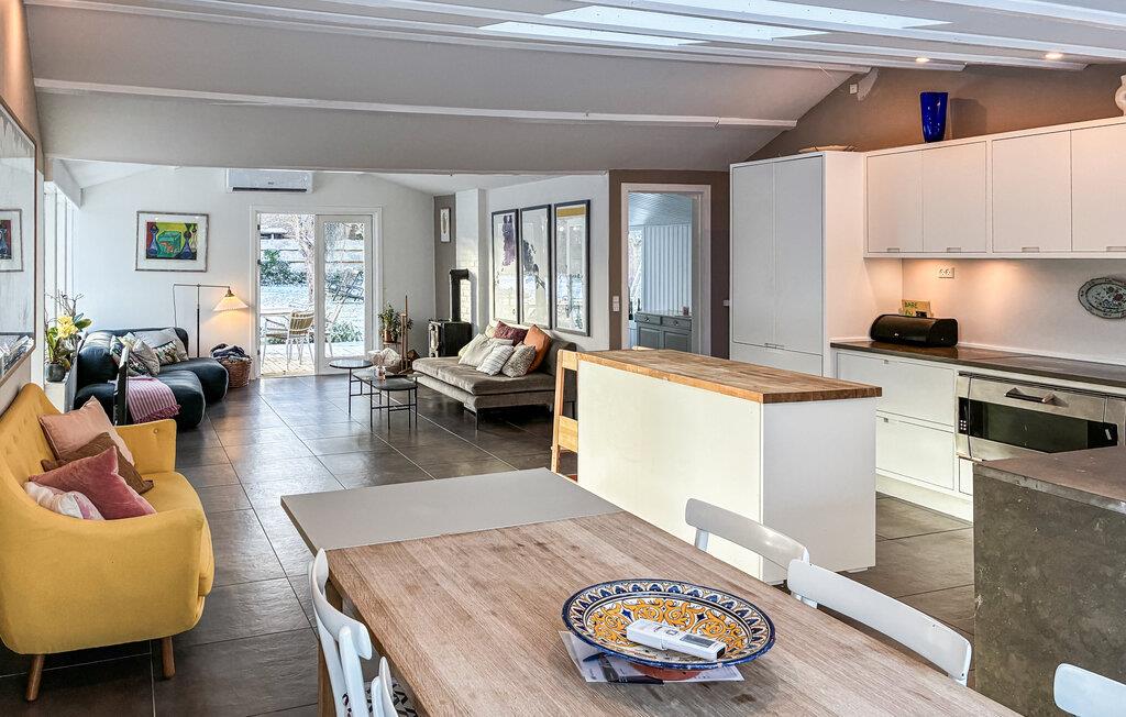 Dette hus byder jer velkommen med en lys og indbydende atmosfære, hvor komfortable sofaer, varme trænuancer og en brændeovn skaber en hyggelig atmosfære. Slå jer ned med en velduftende kop kaffe, tilbered lækre måltider sammen og nyd dem ved spisebordet med udsigt over de grønne områder.