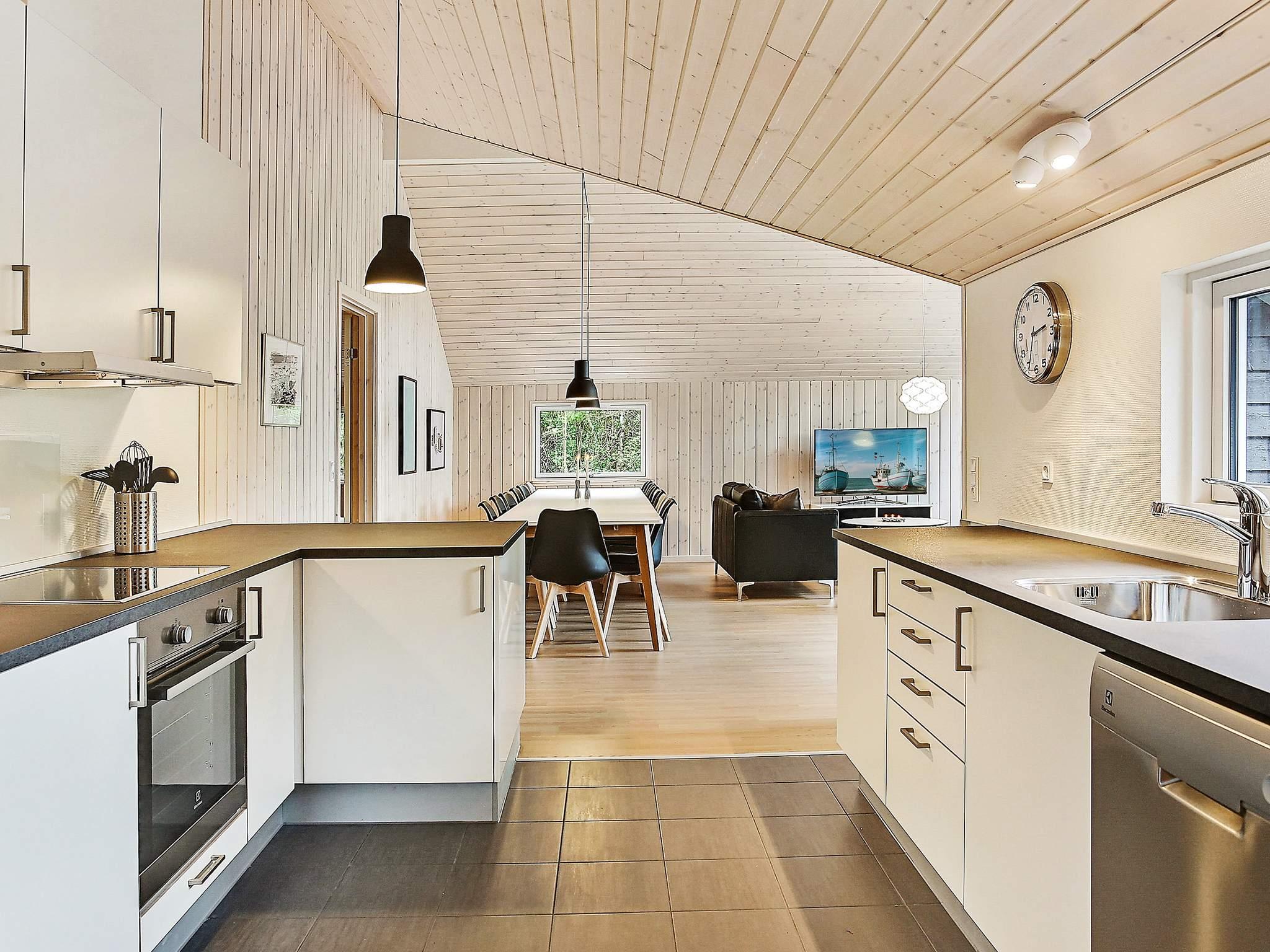 I det gennemtænkte køkken er der stort køleskab, fryseskab og opvaskemaskine. Her er også plads til alle husets gæster ved det lange spisebord.