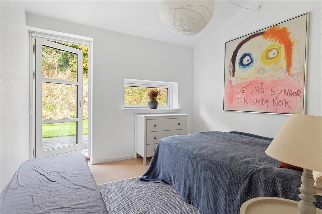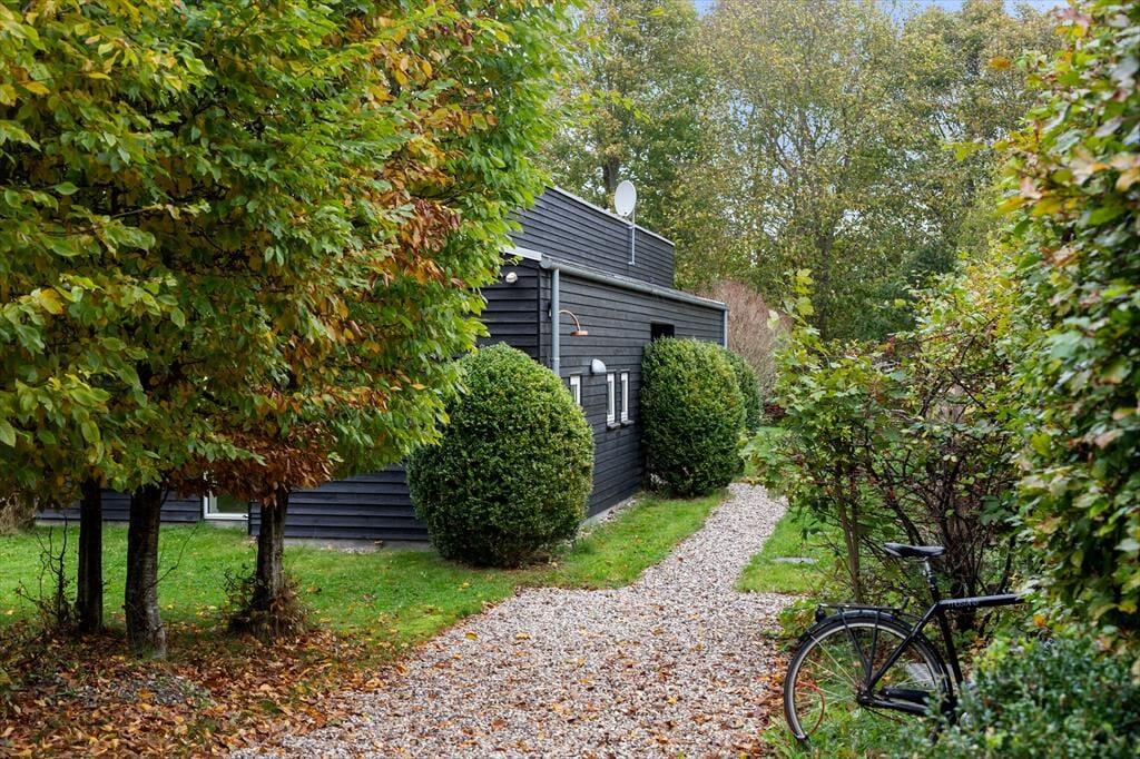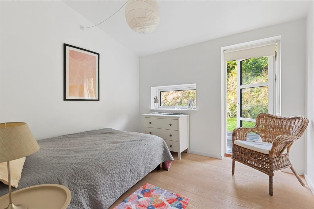 Udenfor fortsætter den rolige stemning i den grønne have, hvor der er plads til både leg, afslapning og gode måltider under åben himmel. Terrassen ligger i direkte forbindelse med opholdsrummet, så dørene kan stå åbne, og huset flyder naturligt ud i naturen. Her kan du starte dagen med morgenkaffe i solen, nyde en frokost i skyggen eller samle familien til grill, når aftenen falder på. Haven er afskærmet og privat, så du kan slappe helt af, mens du mærker duften af sommer og lyden af fugle fra de omkringliggende træer.