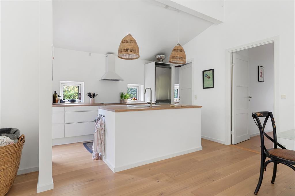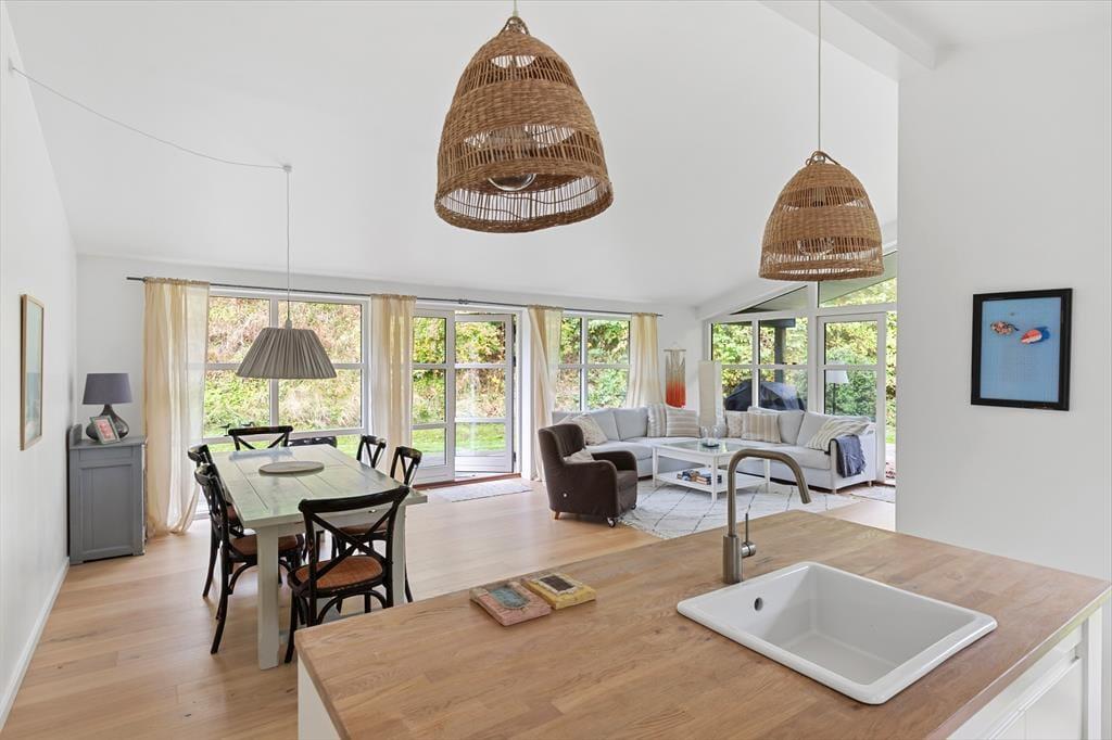 Indenfor mødes du af et moderne og gennemtænkt sommerhus, hvor der er lagt vægt på lys, luft og rummelighed. Huset er bygget i rene linjer med store vinduespartier, der lukker dagslyset ind og skaber en behagelig sammenhæng mellem inde- og udeliv. Det åbne køkken ligger i direkte forbindelse med stuen, så ferielivet kan leves i fællesskab – her kan der kokkereres, mens samtalerne flyder og børnene leger i sofaen.