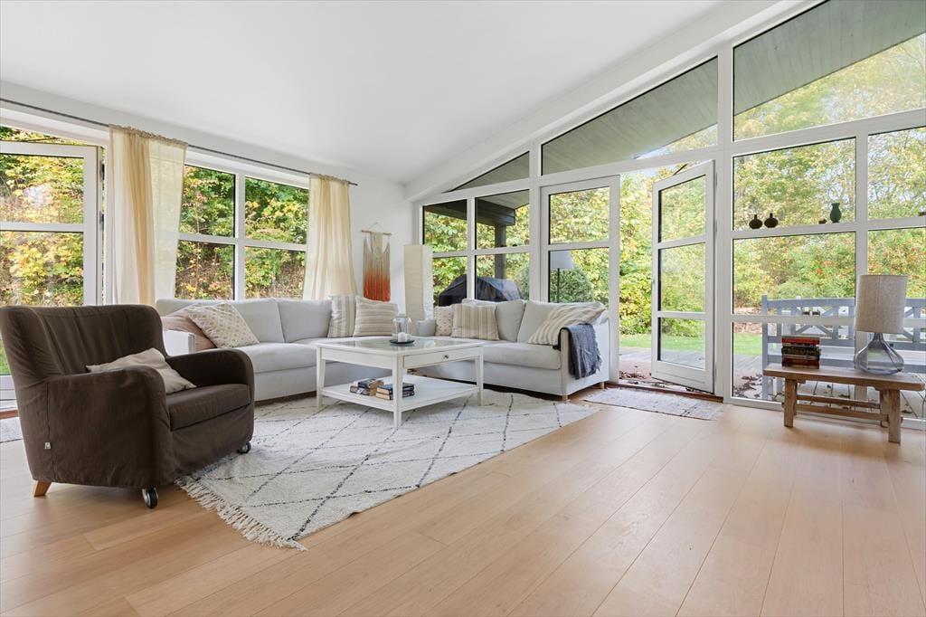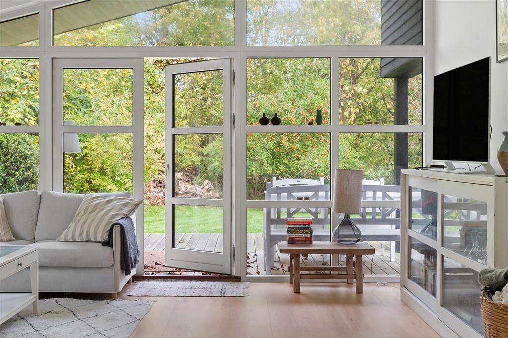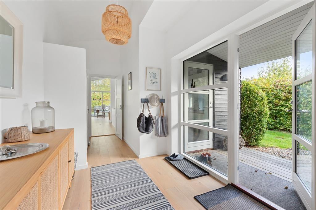 Indretningen er enkel og elegant med lyse materialer og små farveaccenter, der giver varme og personlighed. Stuen er indrettet med komfortable møbler, som indbyder til afslapning efter en dag ved vandet, og de tre soveværelser giver god plads til seks personer. Overalt mærkes en følelse af kvalitet og velvære, og den lyse atmosfære gør det let at finde ro – uanset årstiden.
