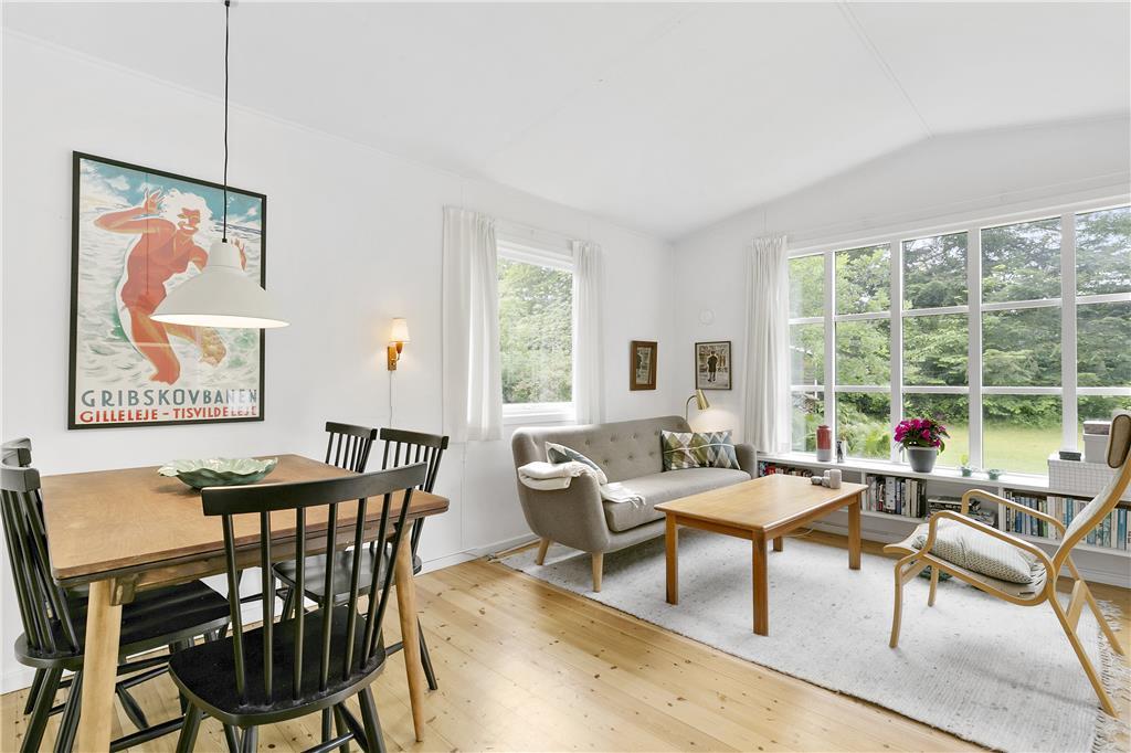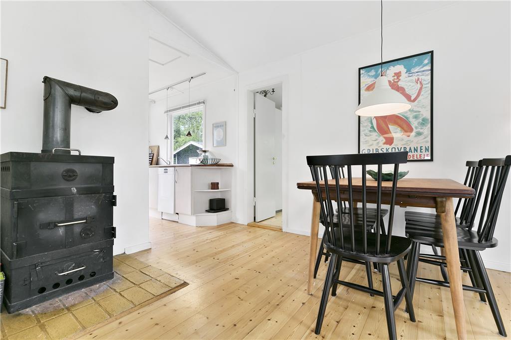 Når du træder ind i huset, mødes du af en lys og venlig opholdsstue, der emmer af charme og komfort. Her kan du slappe af foran brændeovnen på kølige aftener eller nyde udsigten over haven gennem de store vinduer, der lukker masser af lys ind og skaber en hyggelig atmosfære.