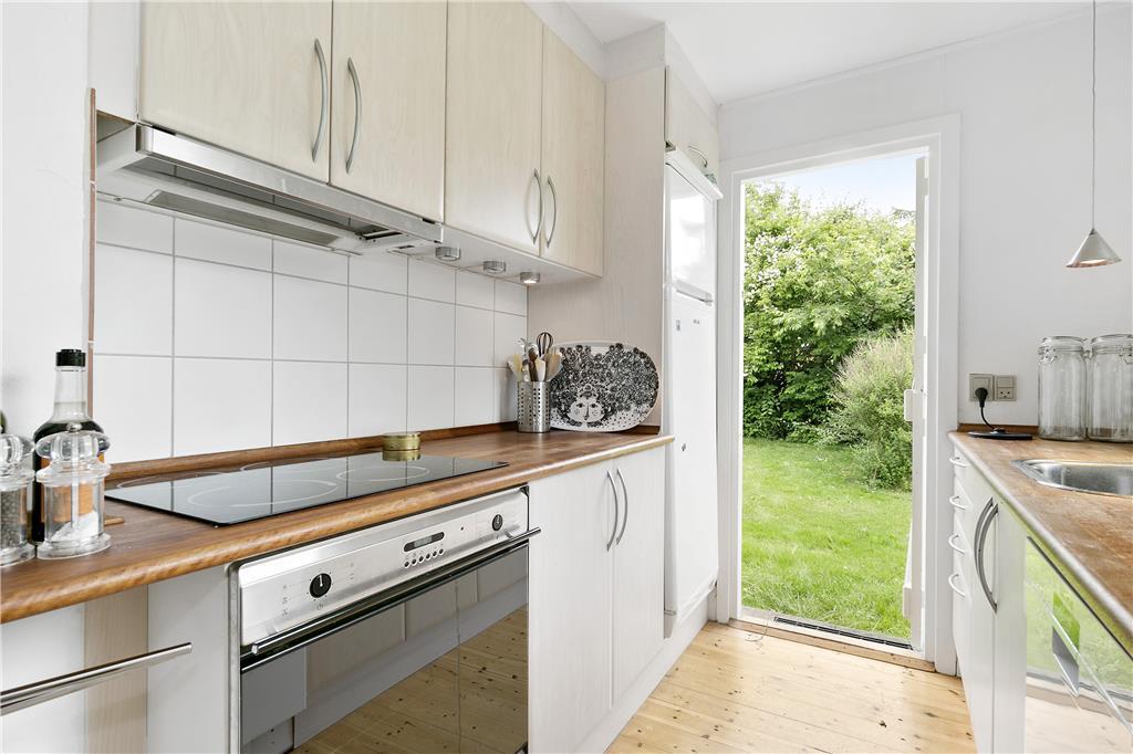 Det delvist åbne køkken er veludstyret med alt det nødvendige til at tilberede lækre måltider, og du har også direkte udgang til grunden, så du nemt kan nyde din morgenkaffe i det fri.