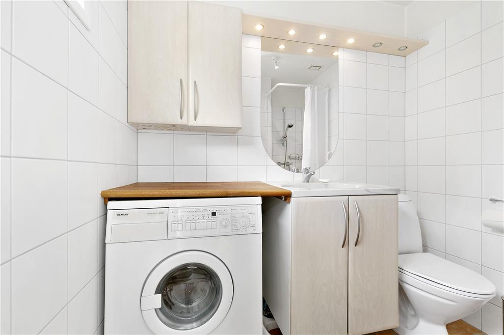 Badeværelset er nyrenoveret og byder på moderne faciliteter som gulvvarme, brusekabine og vaskemaskine – alt hvad du behøver for en komfortabel ferie.