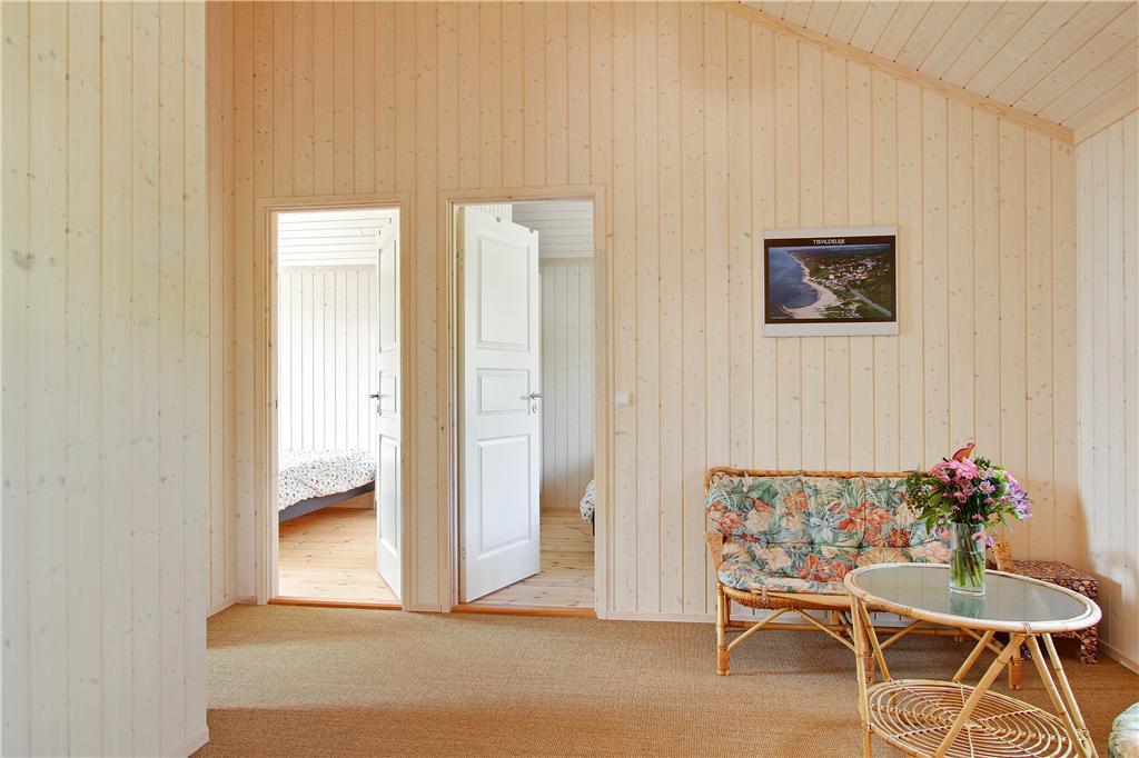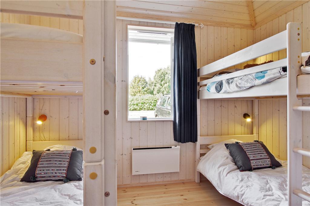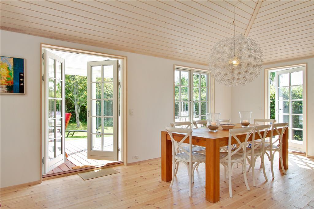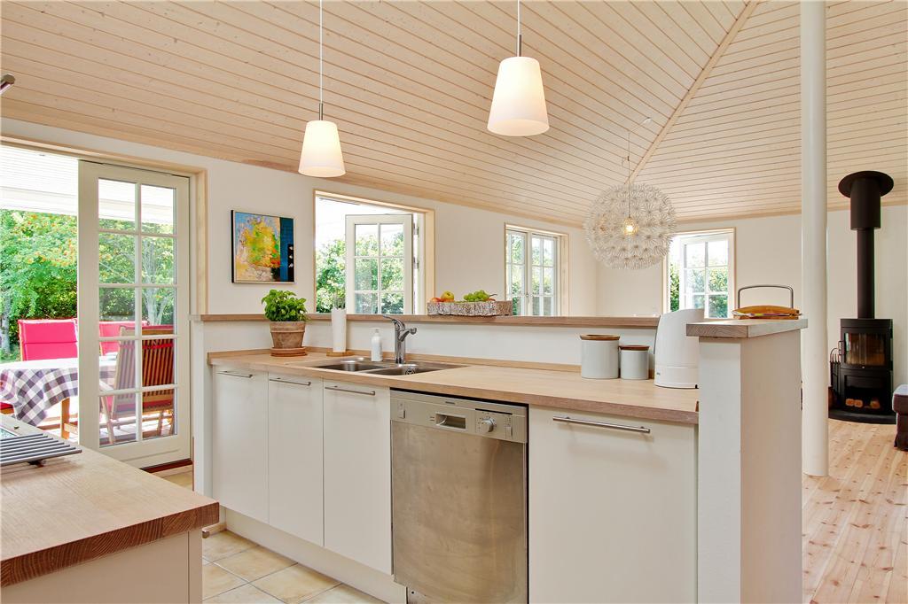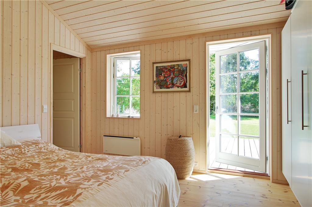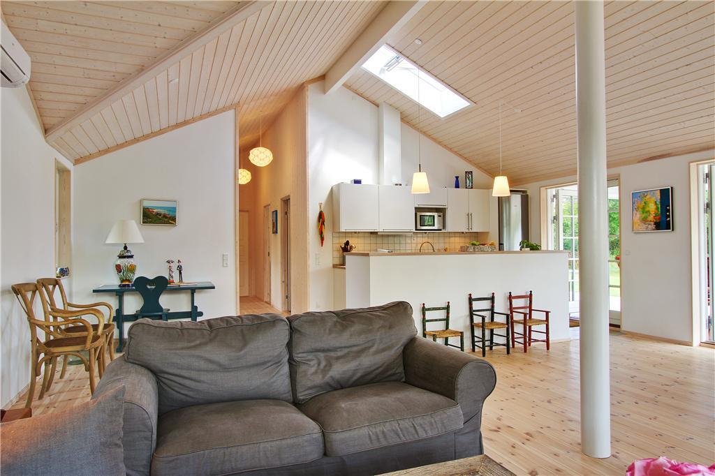 Dette smagfuldt indrettede sommerhus i moderne, nordisk stil byder dig velkommen med et stort og lyst opholdsrum, hvor køkken, spisestue og stue smelter sammen til ét. Her kan du nyde varmen fra brændeovnen på kølige aftener eller lade dagslyset strømme ind gennem de store vinduespartier, der giver direkte adgang til terrassen. Huset har fire rummelige soveværelser, der giver god plads til hele familien. Badeværelset er indrettet med både spa og sauna, hvor du kan slappe af efter en aktiv dag i naturen, og derudover findes et ekstra gæstetoilet, som gør det praktisk for større selskaber.