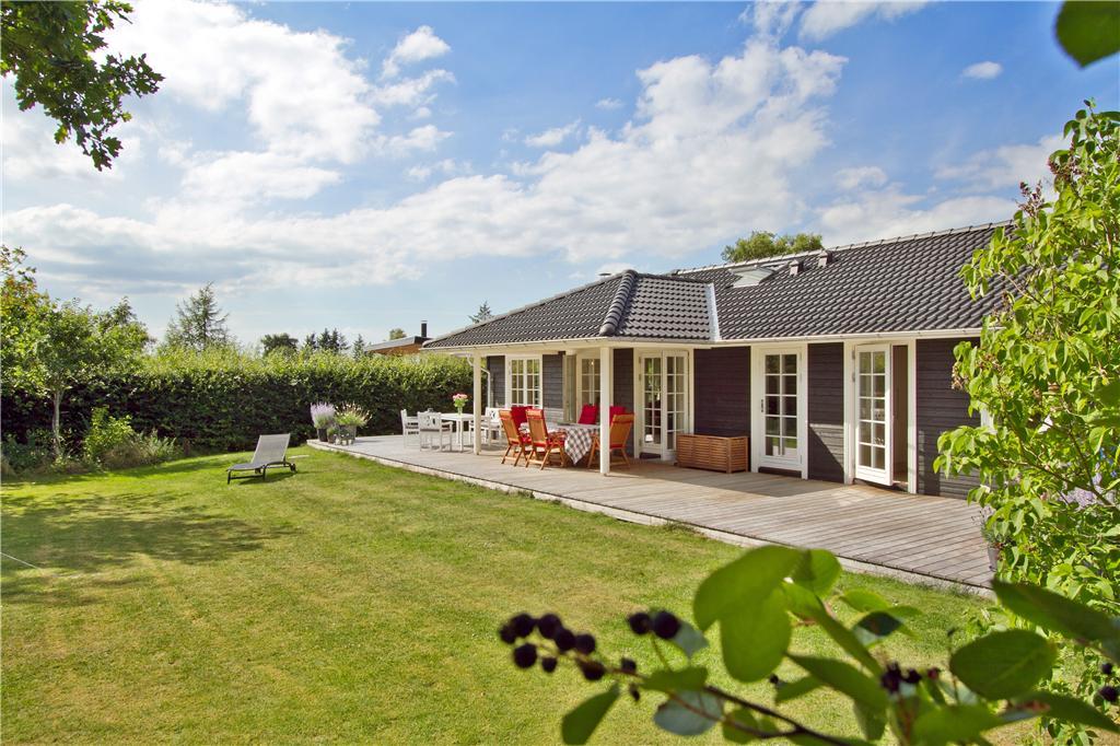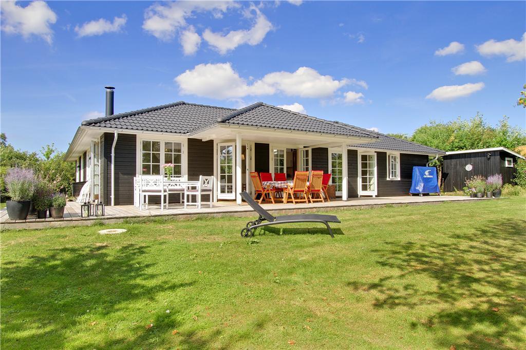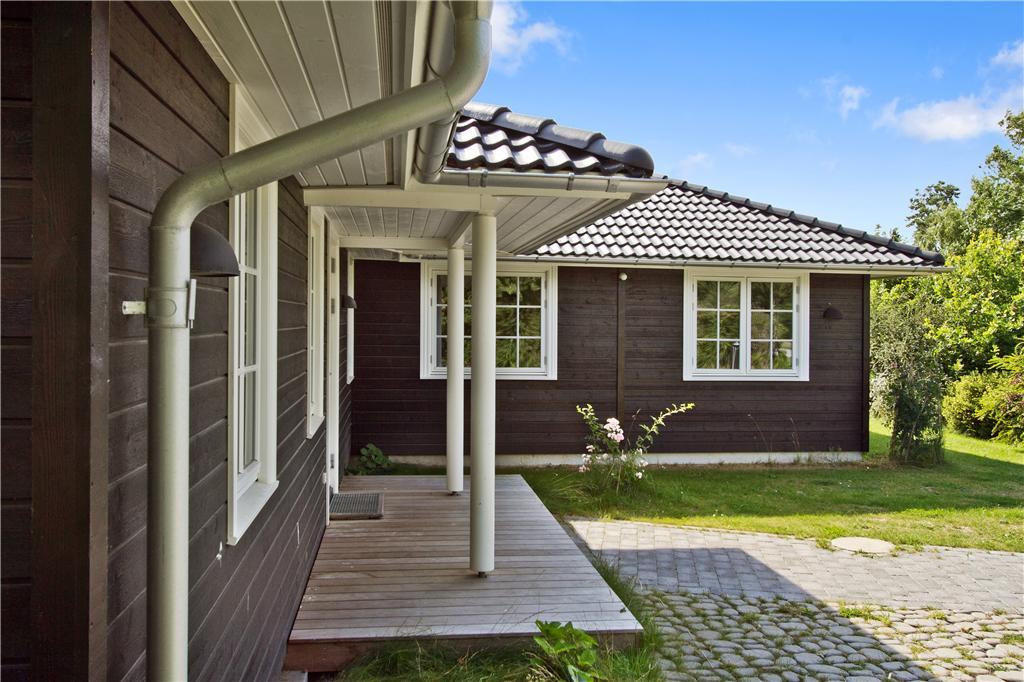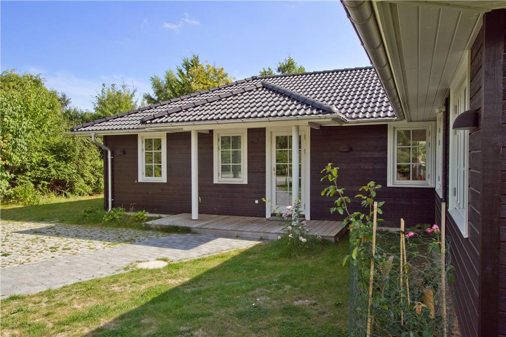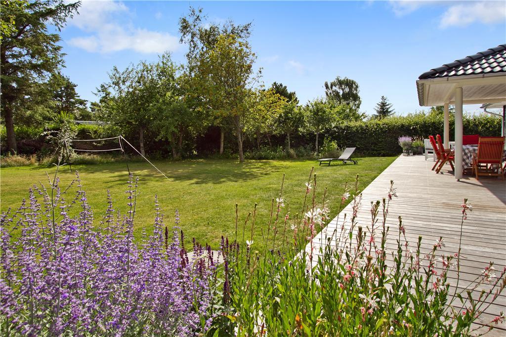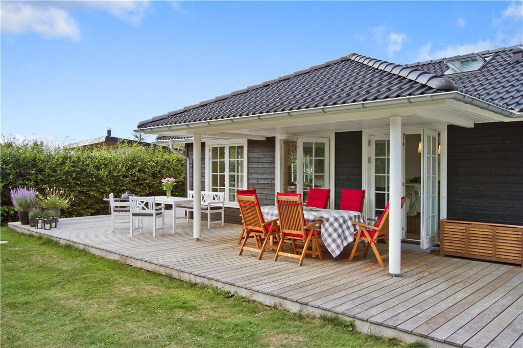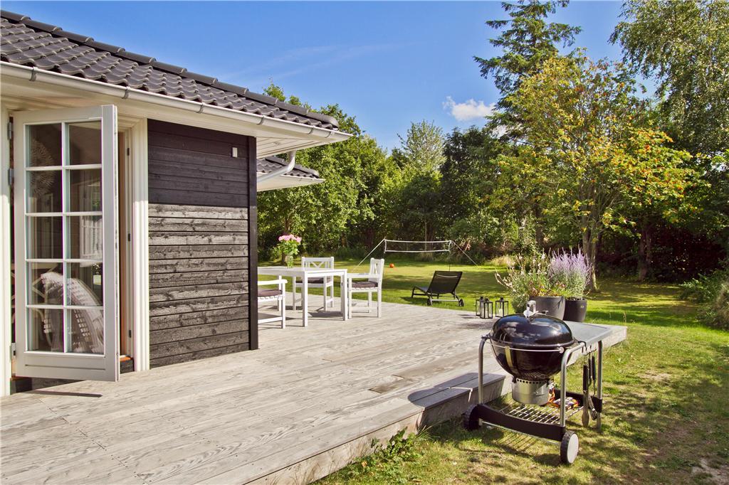 Udenfor venter en stor, delvist overdækket træterrasse på husets bagside, hvor du kan nyde solen fra en komfortabel liggestol eller slappe af i skyggen under træerne. Den velholdte græsplæne er omkranset af en tæt hæk, hvilket skaber en uforstyrret oase for både leg og afslapning. Terrassen er perfekt til hyggelige grillmiddage, lange sommeraftener under åben himmel eller blot en stille stund med en kop kaffe i hånden. Huset har desuden en bred indkørsel med plads til to biler, så du nemt kan parkere ved ankomst.
