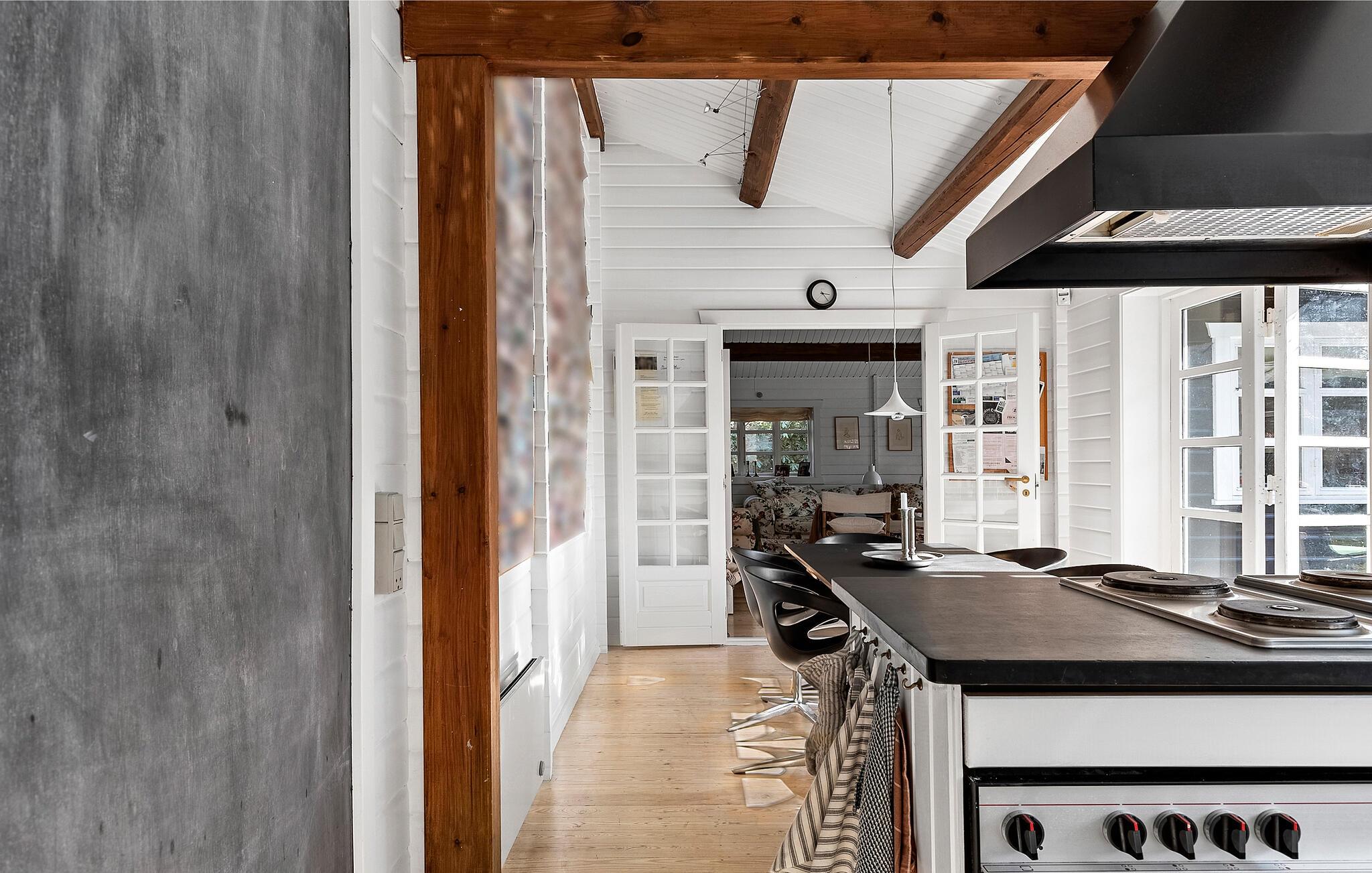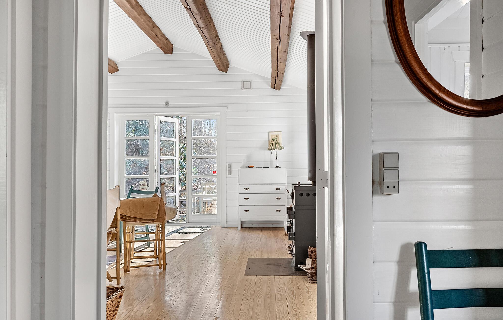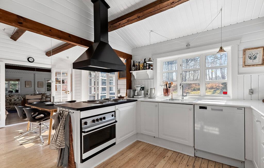 Dette charmerende hus kombinerer skandinavisk klarhed med stemning fra traditionelle danske sommerhuse. Den lyse opholdsstue med synlige træbjælker i loftet og udsigt til det grønne skaber et hyggeligt miljø til at have det godt. Lækre måltider kan tilberedes i det moderne køkken, som I så kan nyde i en afslappet atmosfære ved spisebordet. Om aftenen giver brændeovnen hyggelig varme, ideel til hyggelige timers læsning eller et glas vin i sofaen. I kan slappe helt af i saunaen.