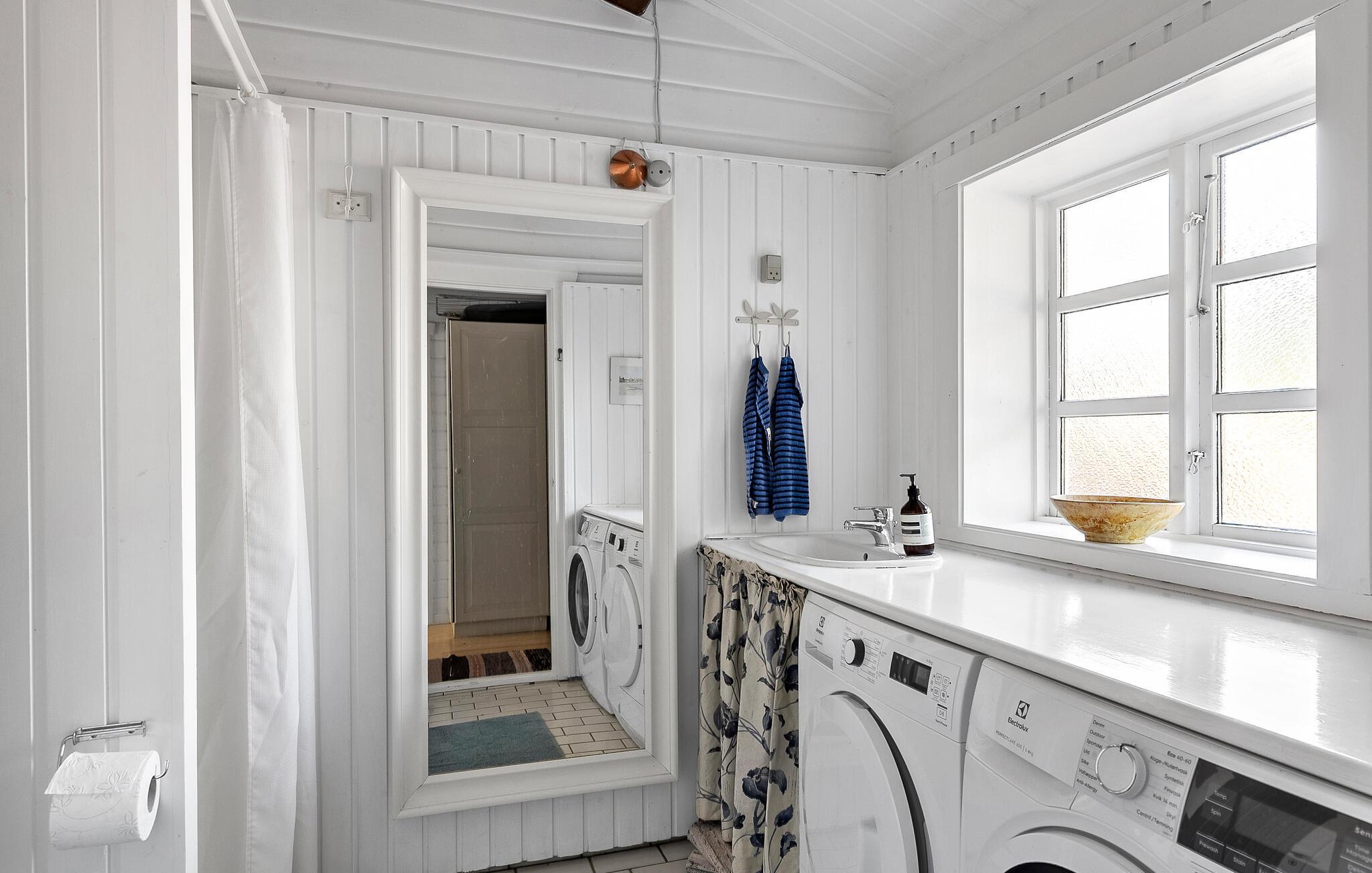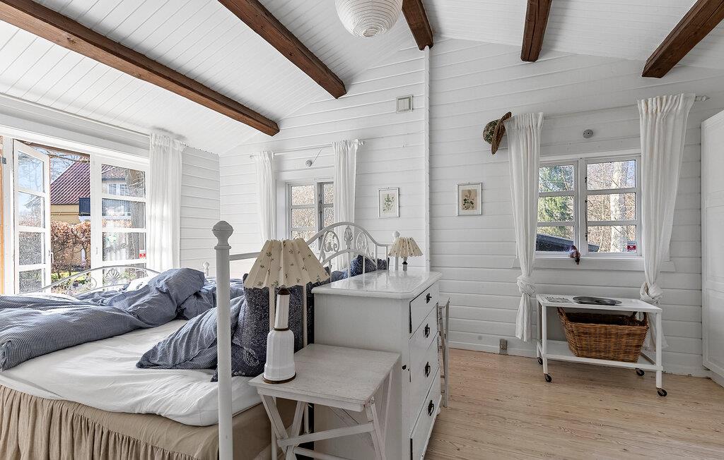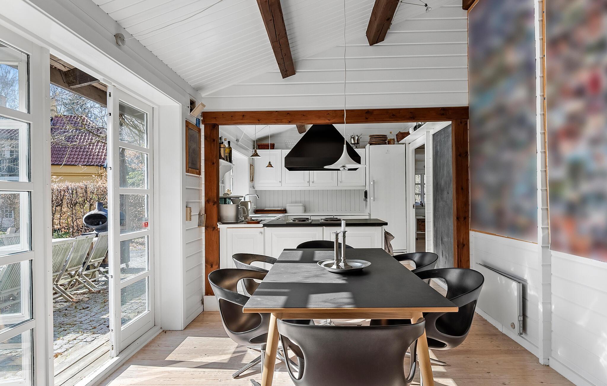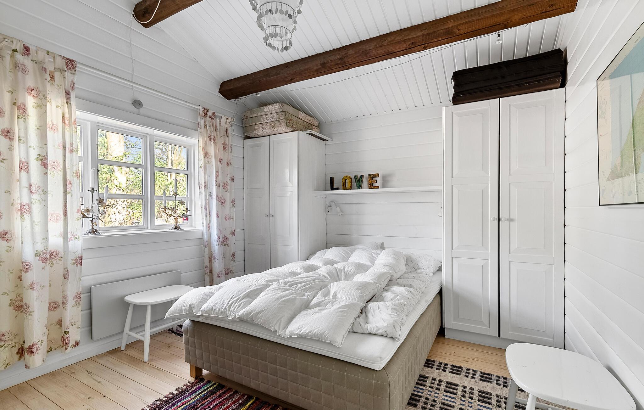 Dette charmerende hus kombinerer skandinavisk klarhed med stemning fra traditionelle danske sommerhuse. Den lyse opholdsstue med synlige træbjælker i loftet og udsigt til det grønne skaber et hyggeligt miljø til at have det godt. Lækre måltider kan tilberedes i det moderne køkken, som I så kan nyde i en afslappet atmosfære ved spisebordet. Om aftenen giver brændeovnen hyggelig varme, ideel til hyggelige timers læsning eller et glas vin i sofaen. I kan slappe helt af i saunaen.