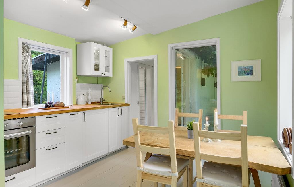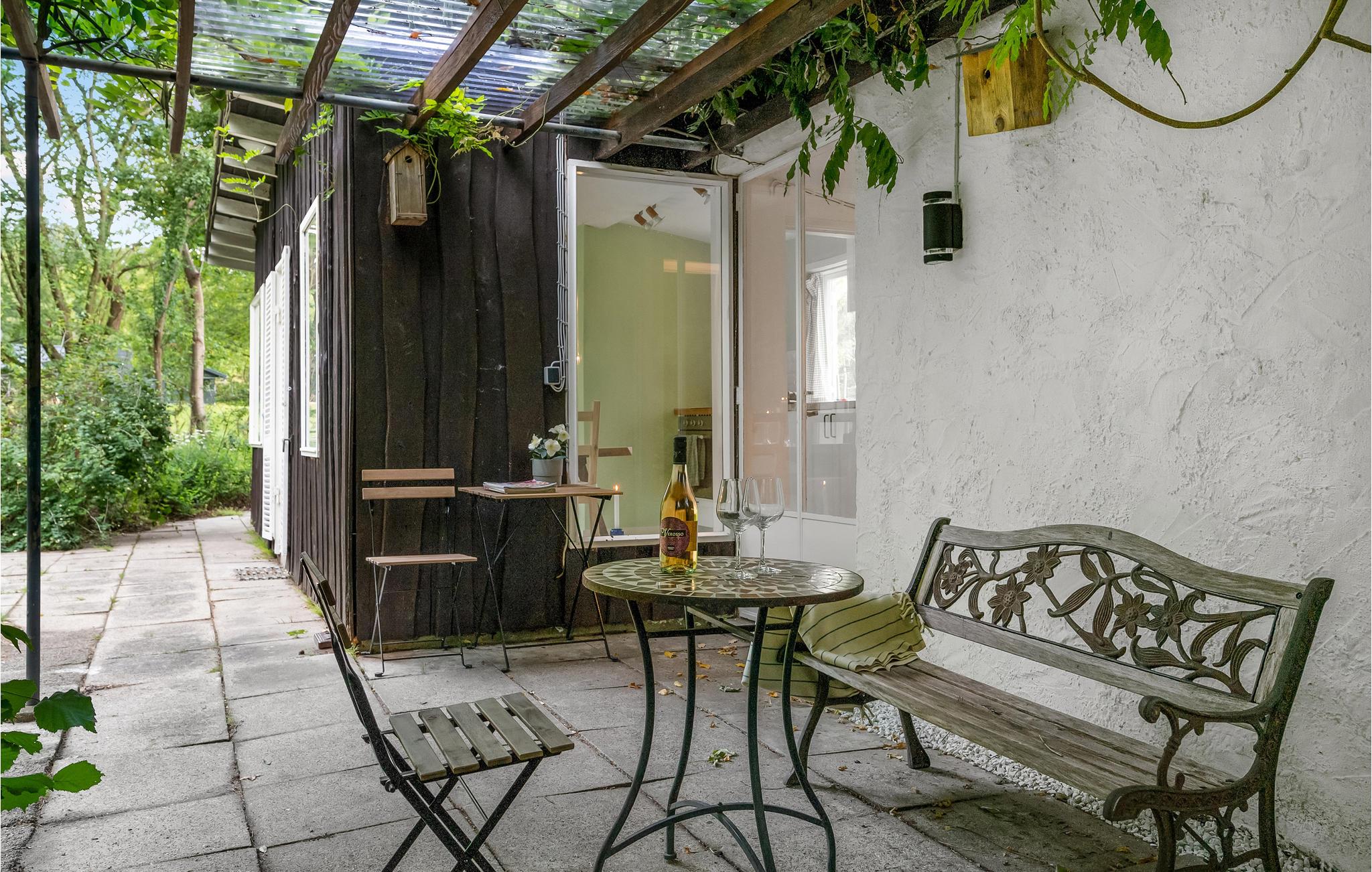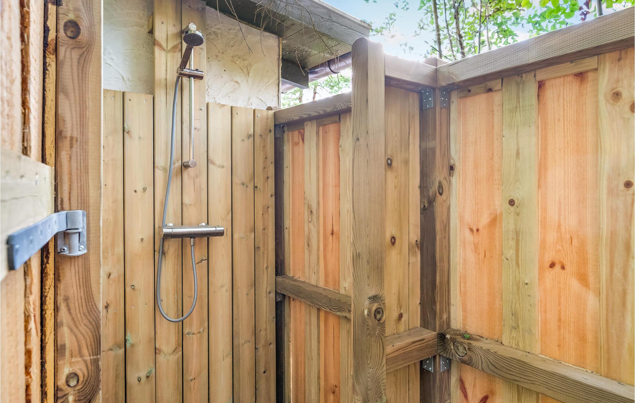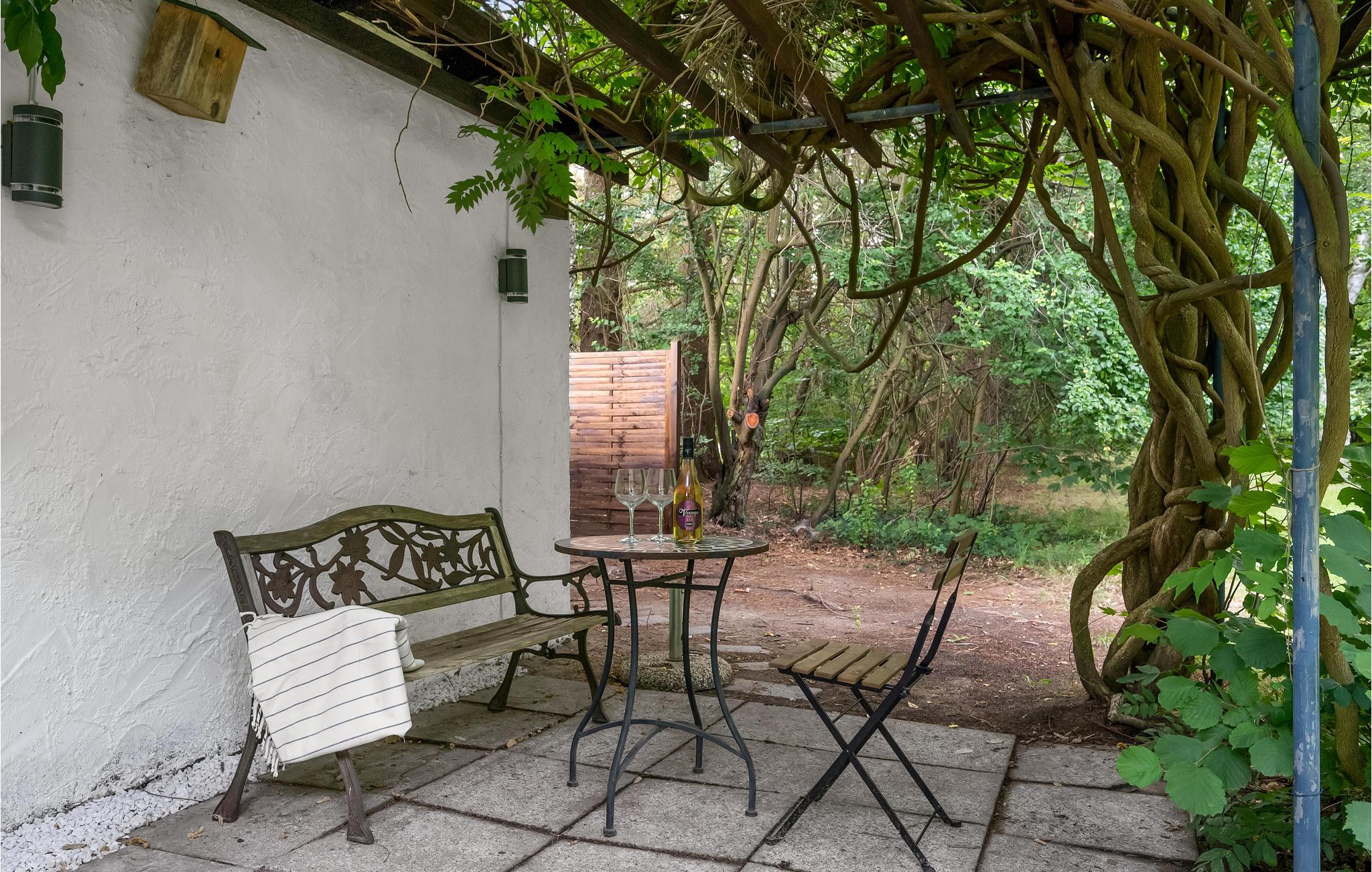 Udenfor er der en terrasse med havemøbler, så I kan se frem til lange sommeraftener i det fri. Udendørsbruseren tilbyder nedkøling på varme sommerdage.