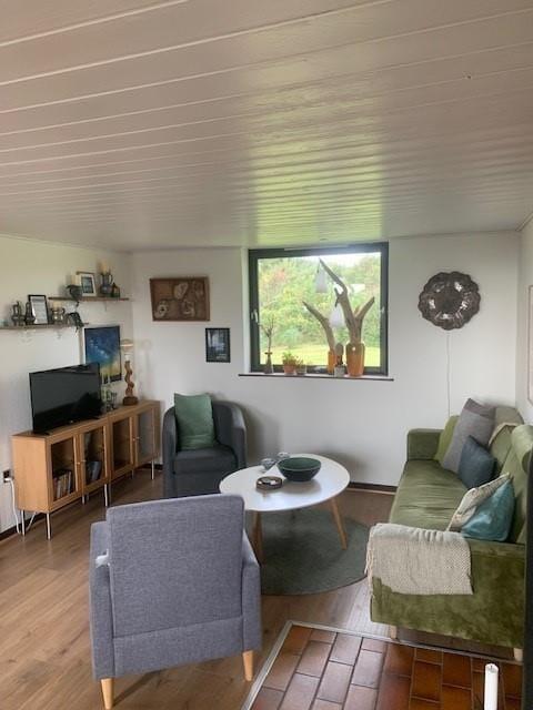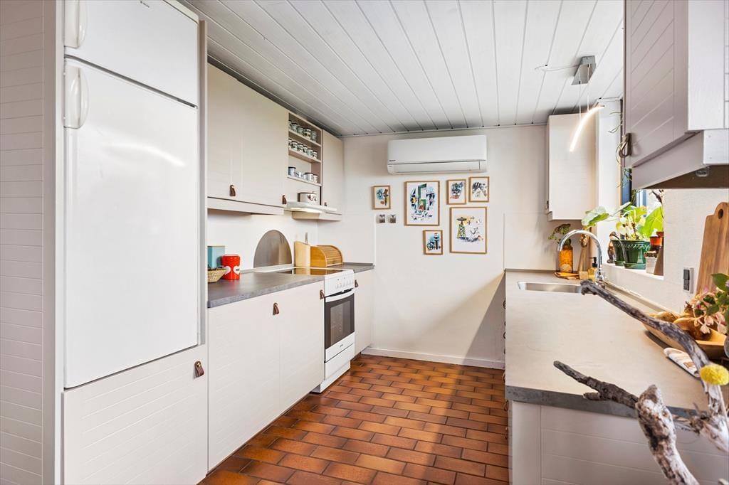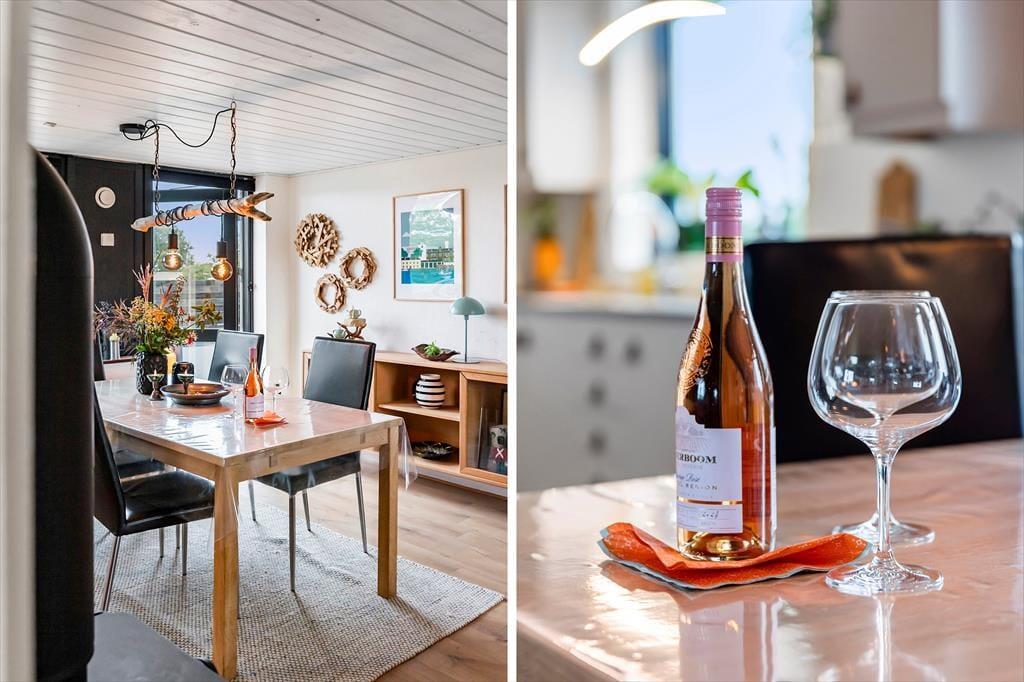 Når du træder indenfor i sommerhuset, vil du straks mærke den hyggelige atmosfære. Her er lys og luft, og i stuen står brændeovnen klar til at sprede varme og stemning på de kølige aftener. Efter en lang dag med oplevelser ved fjorden eller i Toftum Bjerge kan du sætte dig godt til rette i sofaen, mens flammerne knitrer og danner den helt rette feriehygge. Sommerhuset har et dejligt opholdsrum, hvor køkkenet ligger i åben forbindelse med stuen, så du kan holde kontakten med dine nærmeste, selv når maden er i gang. Stemningen i huset emmer af ro, og de charmerende detaljer og varme toner gør, at du hurtigt føler dig hjemme.
