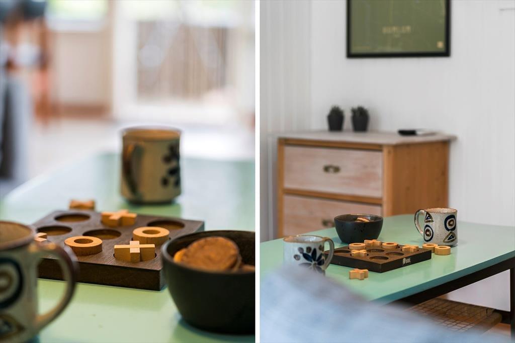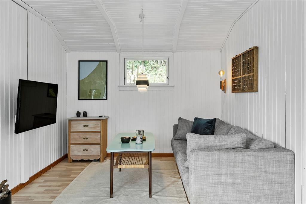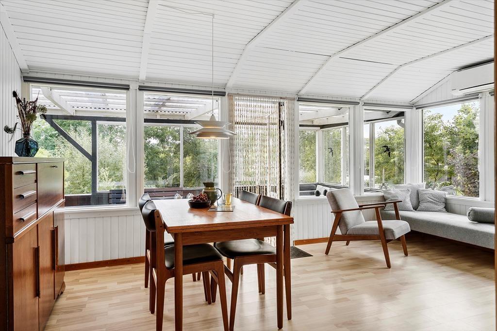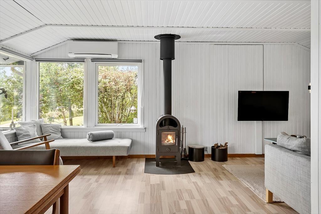 Sommerhuset er et klassisk træhus fra 1967, og det er indrettet, så den gode, autentiske feriestemning er intakt, mens moderne faciliteter som wi-fi-forbindelse, fladskærms-tv og opvaskemaskine gør livet bekvemt inden døre. Møblementet passer godt ind i de hyggelige rum, og du og dine kære kan straks sænke skuldrene og slappe af – uanset om I gør det bedst ved at drikke te og spille spil, løse krydsogtværser nær brændeovnen eller tage en middagslur på stuens daybed efter frokosten. Det tosidede køkken er et dejligt sted at stå og kokkerere, og og det er rart både at falde i søvn og vågne op på husets to gode værelser.
