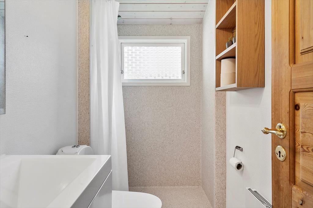 Stuens brændeovn, den overdækkede terrasse og den grønne beplantning på den kuperede grund – alt det og meget mere er med til at give dig en hyggelig og stemningsfuld ramme om ferielivet i dette sommerhus i Toftum Bjerge.