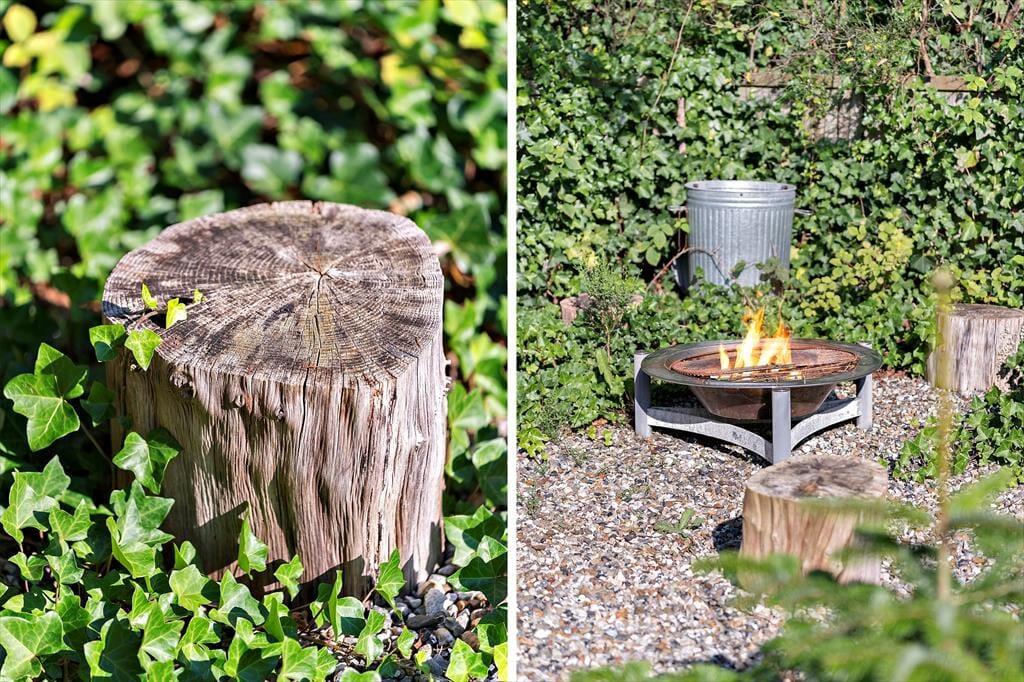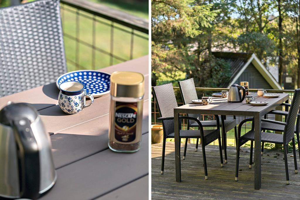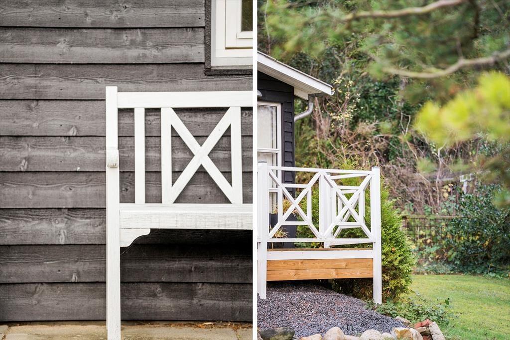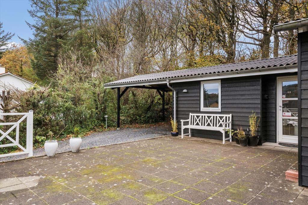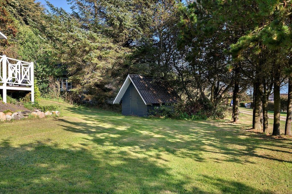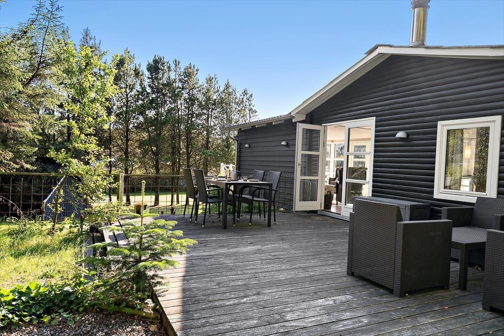 Sommerhusgrunden grænser op til et skovklædt areal, og fornemmelsen af at være omgivet af høje træer bidrager til den fredfyldte atmosfære. Både på østsiden af huset og mod sydvest er der dejlige terrasser at opholde sig på– hvis ikke I er mere i humør til at få en lur i hængekøjen eller samles ved bålfadet.