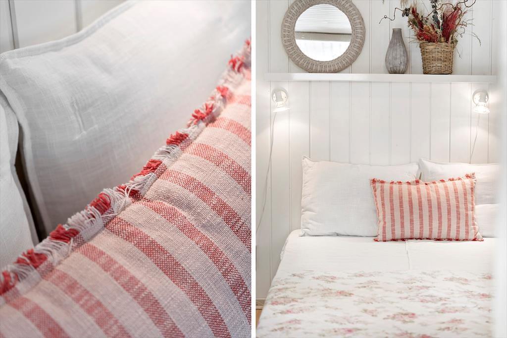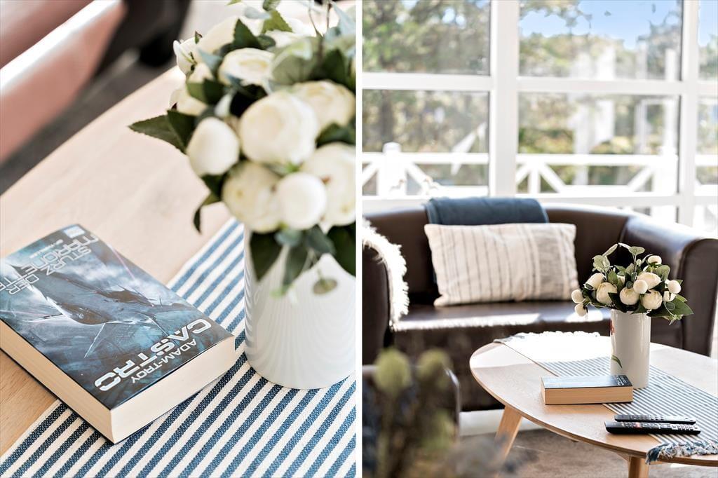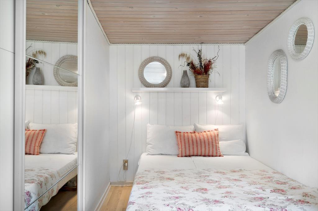 Træhuset, der måler 72 m2 og har plads til fire personer, er senest blevet renoveret i 2021. Indretningsstilen er lys og romantisk med brændeovn og komfortabelt møblement, så det er lige, som et sommerhus skal være. Stue og køkken ligger i åben forbindelse, og begge rum er udstyret med store vinduer, så I kan nyde sollyset og udsigten til den grønne grund, selv når I slapper af i sofaen, spiller yatzy ved spisebordet eller hygger jer med madlavningen. To soveværelser er udstyret med dobbeltseng og et tredje med køjeseng, mens badeværelset har bruseniche, gulvvarme og vaskemaskine.