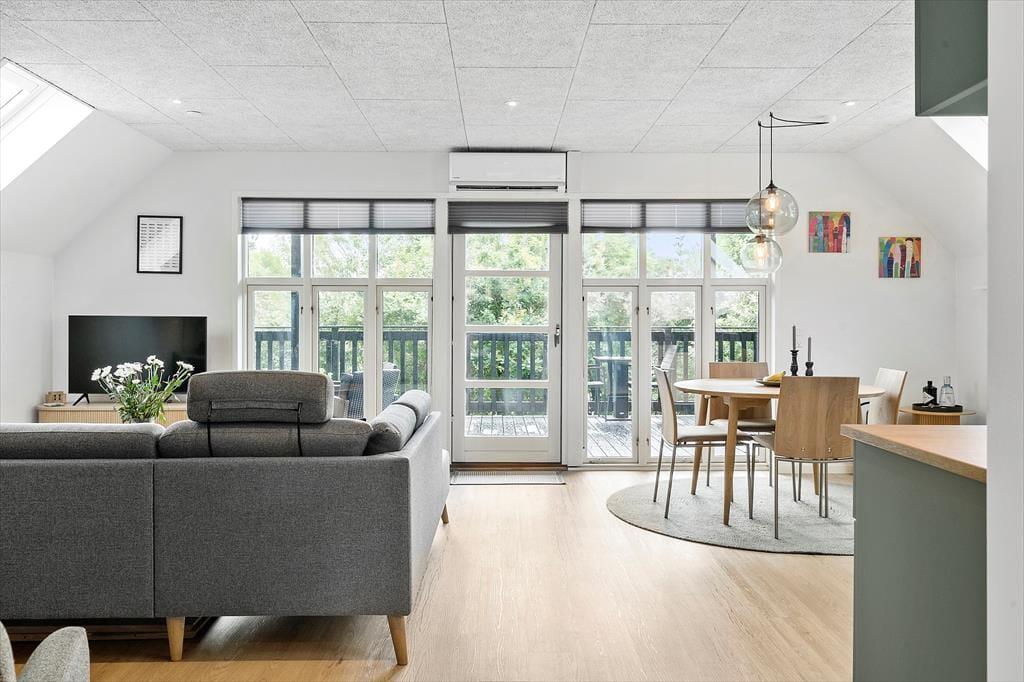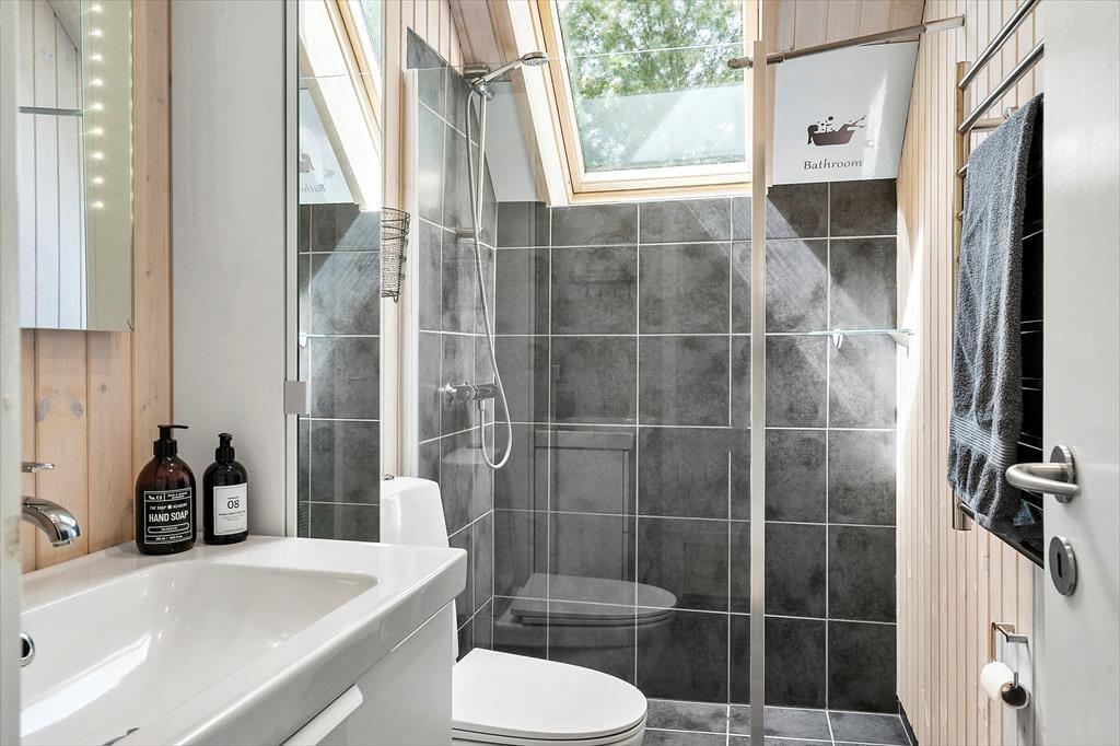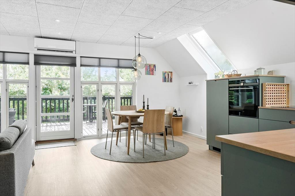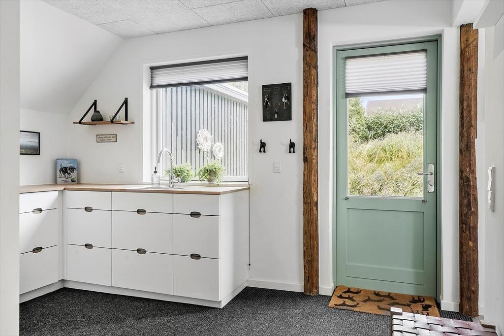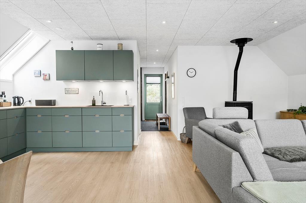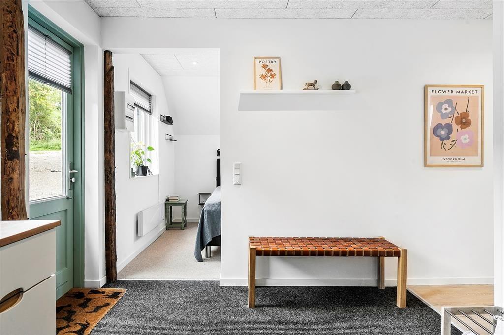 Sommerhuset er blevet renoveret i 2021, og her gik man grundigt til værks, hvilket alle rum tydeligt viser – selv den rummelige entré med vaskemaskine og tørretumbler fremstår lys og indbydende. På badeværelset kan I gå i brusebad, mens solen skinner ned gennem ovenlysvindue, og i opholdsrummet sørger flere ovenlysvinduer og et stort vinduesparti i gavlen for et dejligt indfaldslys. Det åbne køkken er ikke bare smukt at se på, men også lækkert at lave mad i, og med fladskærmstv, brændeovn og komfortable møbler har I alt, hvad I skal bruge i stuen. Sidst, men ikke mindst, har I adgang til tre soveværelser, hvoraf to af dem ligger i annekset.
