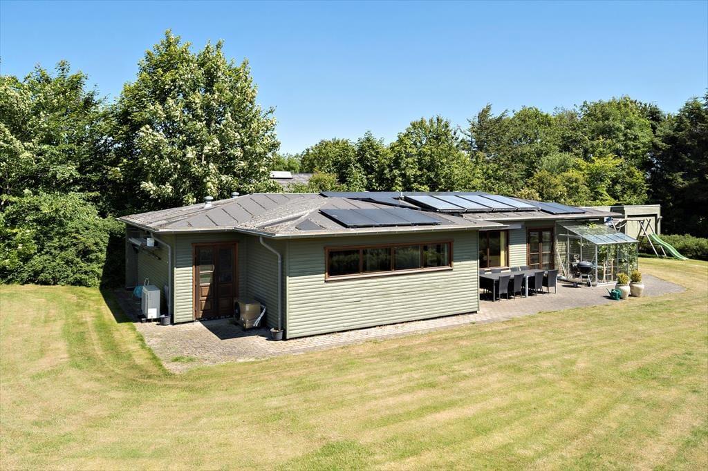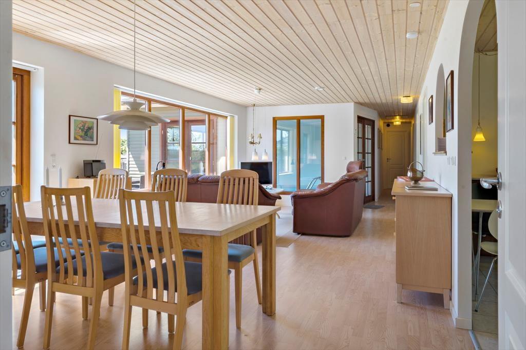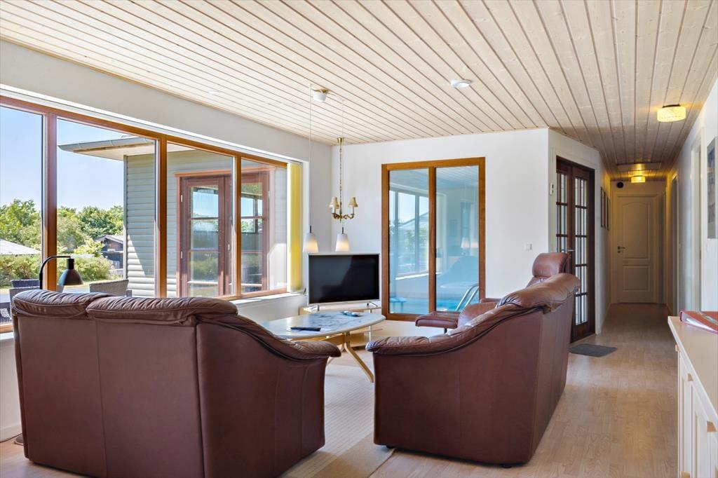 Huset er opført i 2009 og fremstår lyst og meget indbydende. Med 144 m2 har I god plads inden døre, og I får blandt andet fire soveværelser, to badeværelser og et praktisk bryggers at gøre godt med. Opholdsafdelingen består af en kombineret spise- og opholdsstue med udgang til terrassen og direkte forbindelse til et veludstyret køkken. De sydvendte vinduespartier sørger for et godt lysindfald og fint kig til den grønne have. Den indendørs swimmingpool på 16 m2 er placeret i en fin poolafdeling, hvor I også finder det ene af husets to badeværelser. Endelig er det også værd at bemærke sommerhusets anneks, der er indrettet som aktivitetsrum, så her kan I hygge jer med at spille pool og dart.