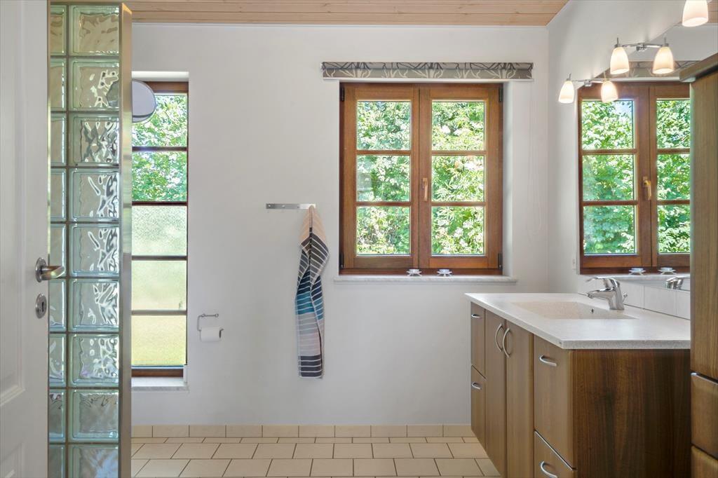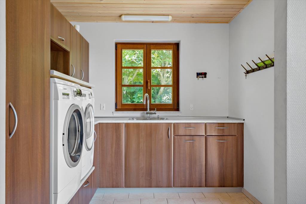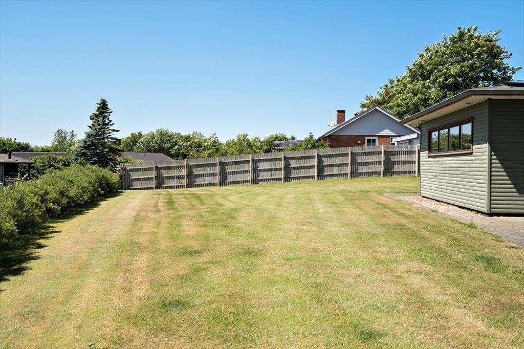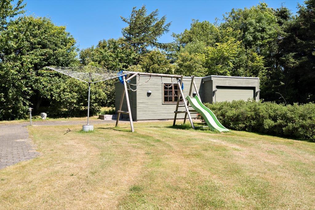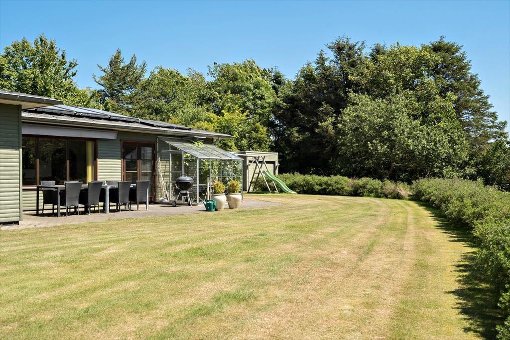 Fra stuen har I adgang til en hyggelig terrasse med udsigt over det smukt kuperede landskab. Terrassen er sydvendt, så her får I det optimale udbytte af solens stråler. Der er fin plads til at dække op til en frokost i det grønne, og når aftenen falder på, kan I tænde op i grillen. Haven byder også på en stor græsplæne, som familiens yngste med sikkerhed vil sætte pris på – og som ekstra bonus er der et legestativ med rutsjebane.