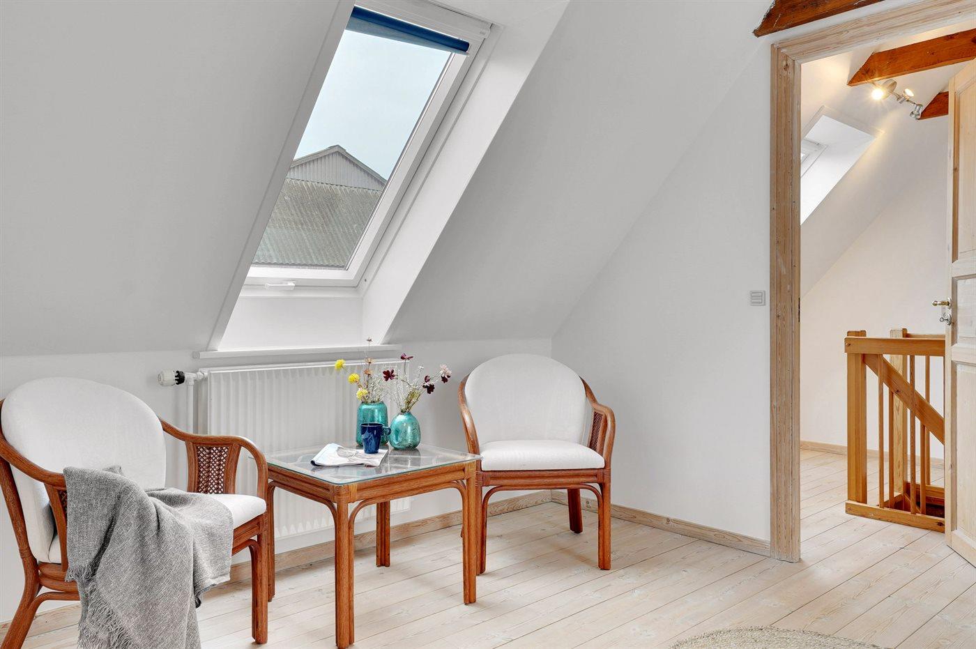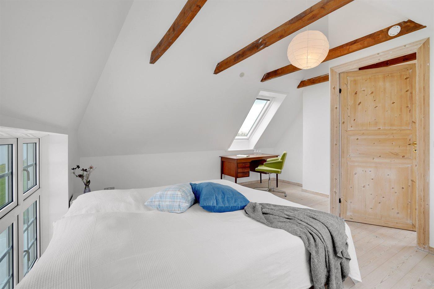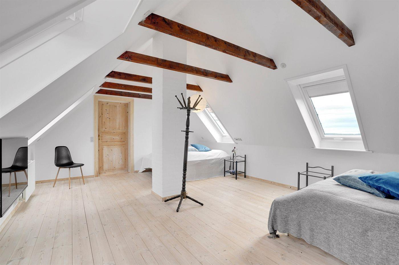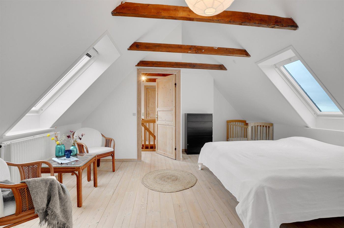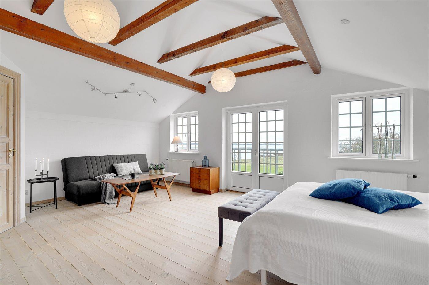 Der er i alt 7 soveværelser. Sovepladserne fordeler sig på: 12 sovepladser i dobbeltsenge. 4 sovepladser i enkeltsenge. 2 sovepladser i sovesofa (dobbelt). Derudover er der 1 stk. barneseng.