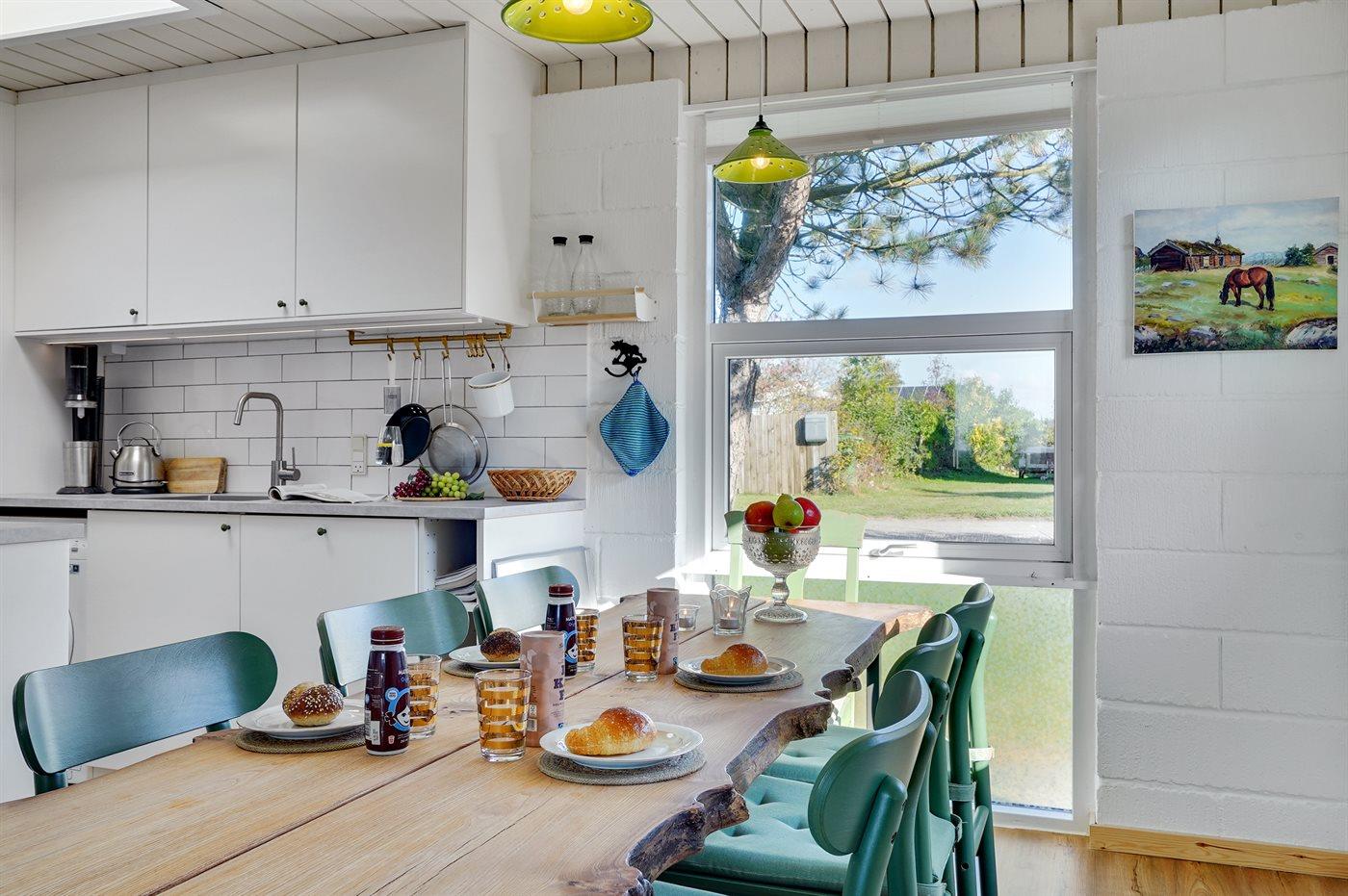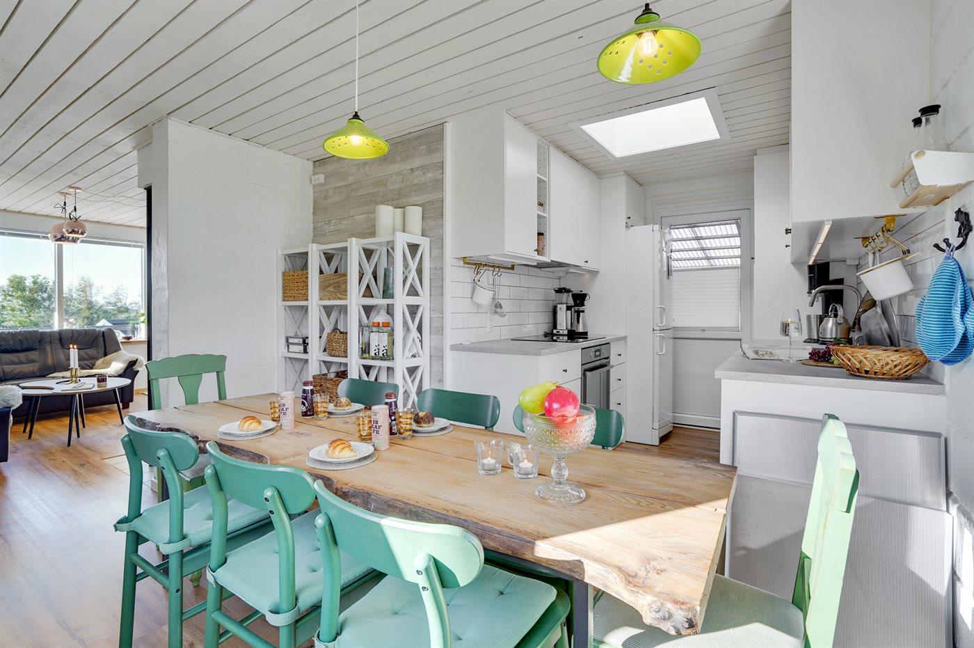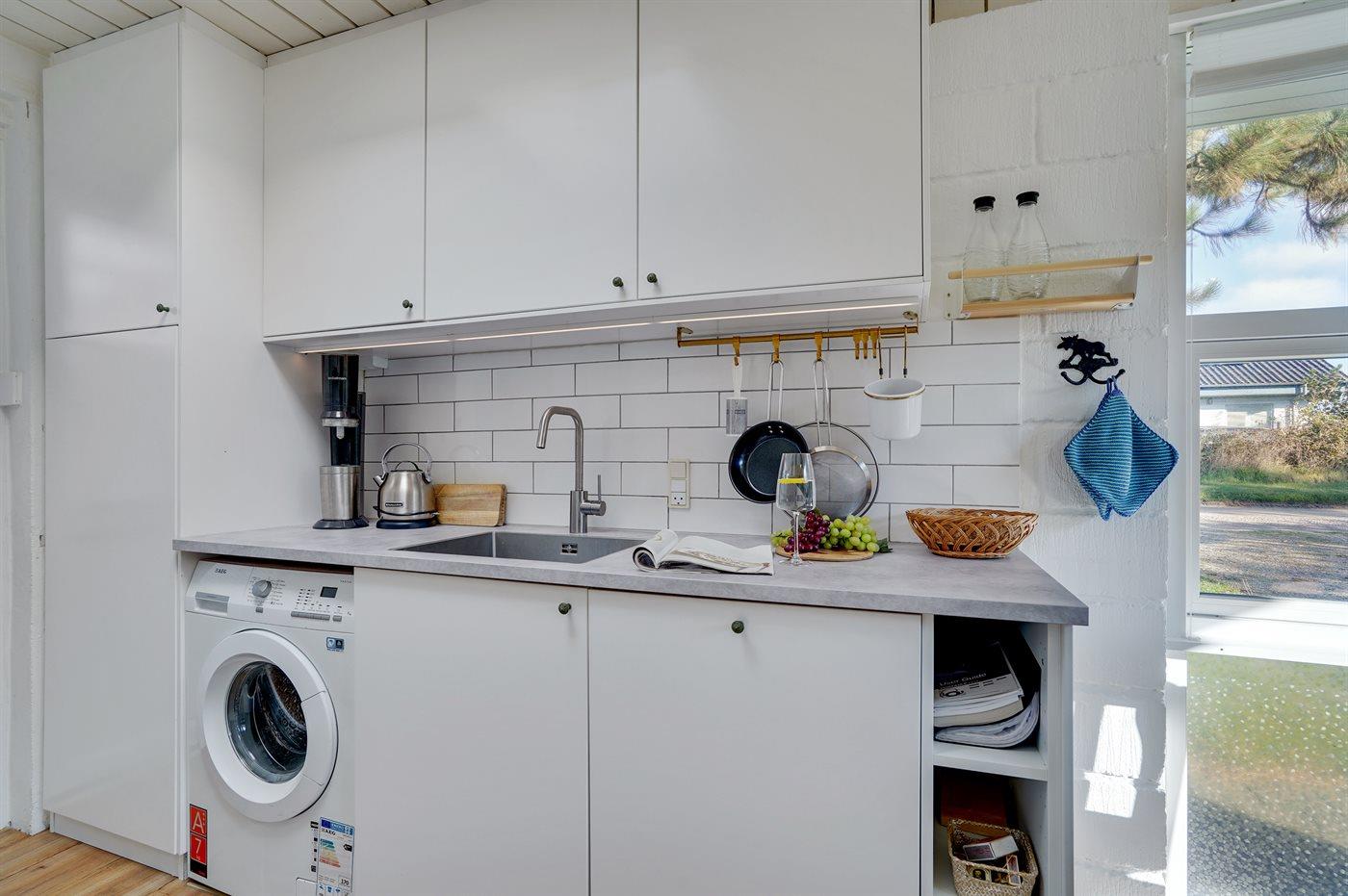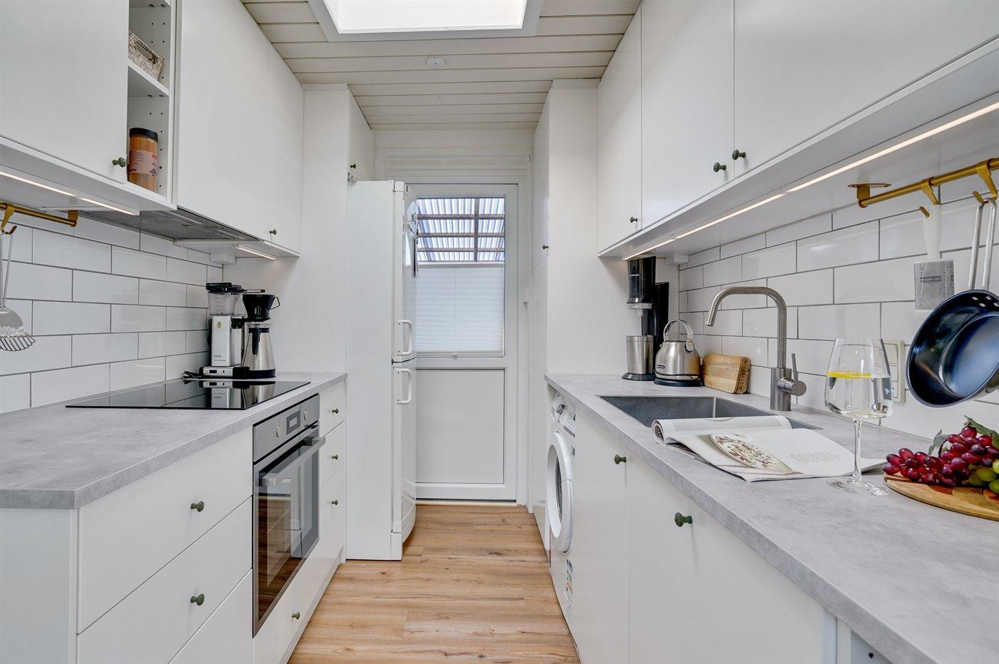 Køkkenet er udstyret med 1 køleskab. Der er 4 induktionskogeplader, varmluftovn samt opvaskemaskine.