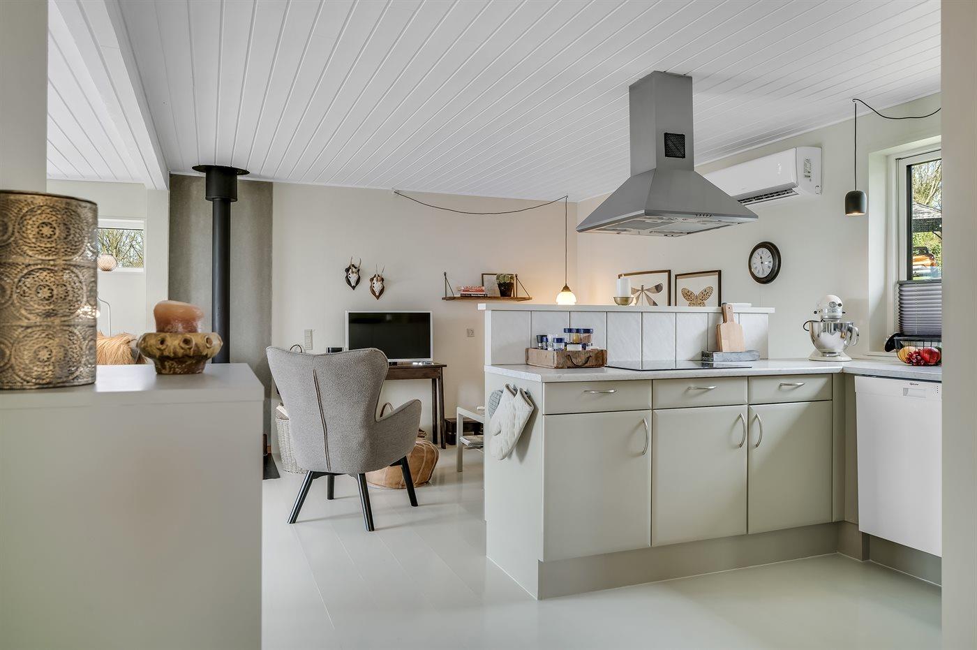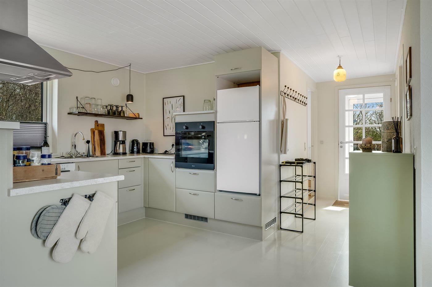 Køkkenet er udstyret med 1 køleskab. Frysekapacitet på 40 liter. Der er 4 induktionskogeplader, varmluftovn samt opvaskemaskine.