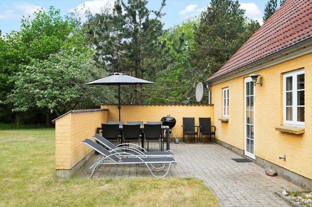 Ferieforholdene er også fine ude i det fri på den 2500 m2 store grund, der breder sig rundt om huset. Fyrretræer og anden randbeplantning skærmer græsplænen af, og ved terrassen er der også en halvmur, som er med til at give læ, når I soler jer i liggestolene eller nyder et lækkert måltid med friske råvarer tilberedt på grillen.