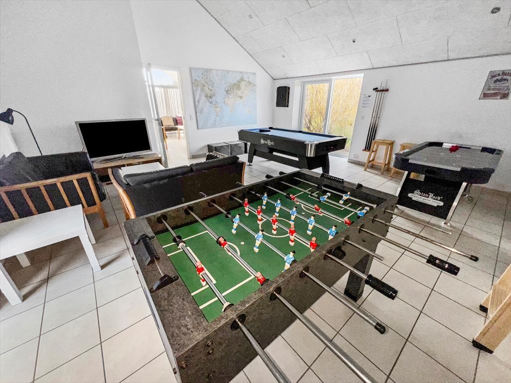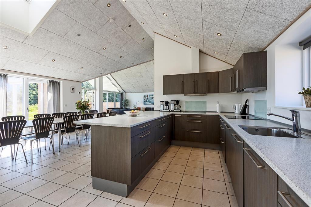 Sommerhusets gennemtænkte planløsning og mange kvadratmeter gør det til den ideelle feriedestination, hvis du gerne vil samle hele familien eller nyde driverlivet med gode venner. De seks soveværelser er fordelt i to afsnit med hver sit badeværelse – og der er for øvrigt også et badeværelse i wellnessafdelingen, der byder på sauna, spabad og en dejlig swimmingpool. Både leg og afslapning kan med andre ord foregå her, og det samme gør sig gældende i aktivitetsrummet, hvor du kan dyste med de andre i blandt andet pool og bordfodbold, hvis ikke du hellere vil hygge dig i baren eller sofahjørnet. Endelig er det også rart at hænge ud i stuen og det integrerede køkken-alrum, hvor langbordet kan danne rammen om hyggestunder og morgenmad såvel som overdådige middage med flere retter.