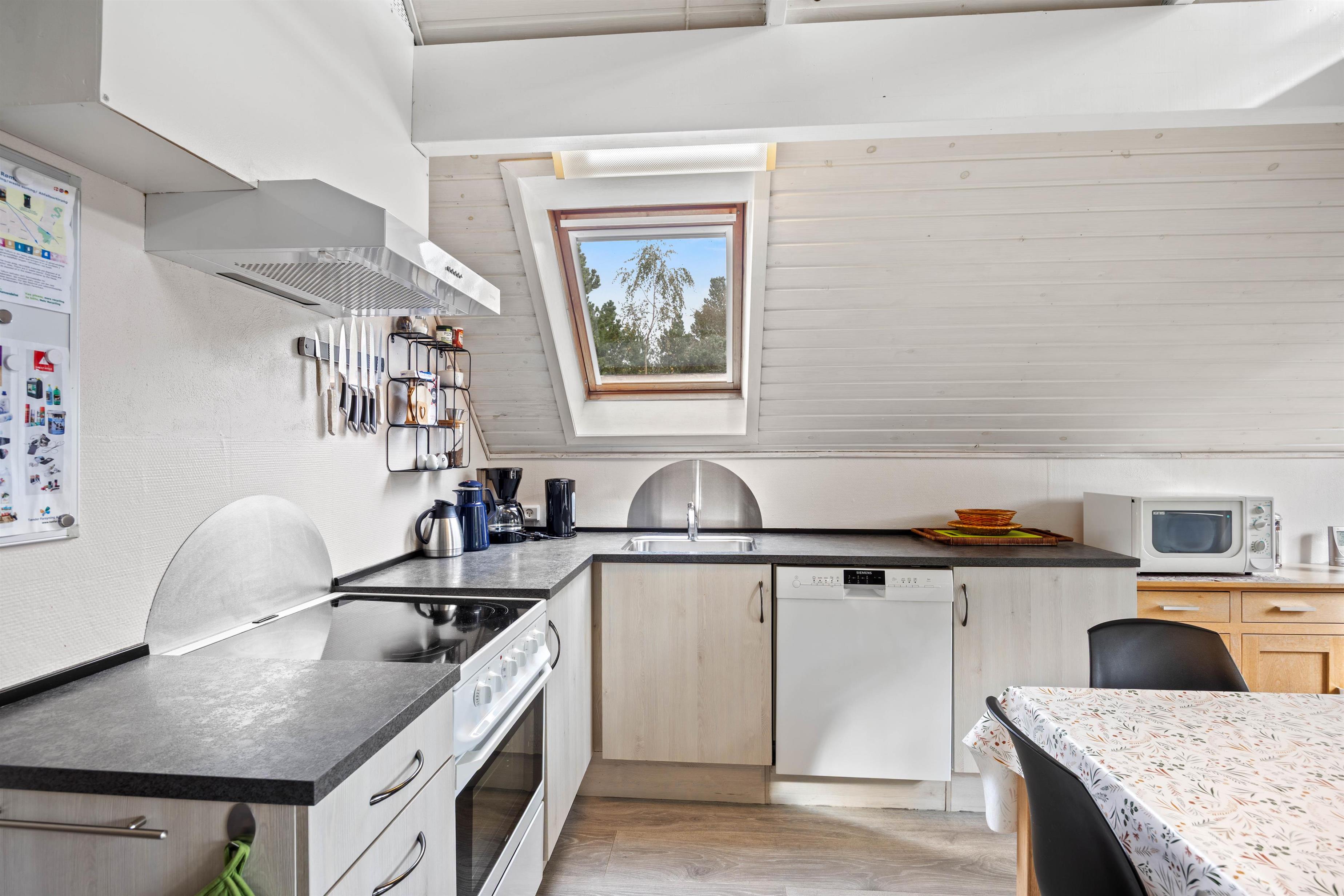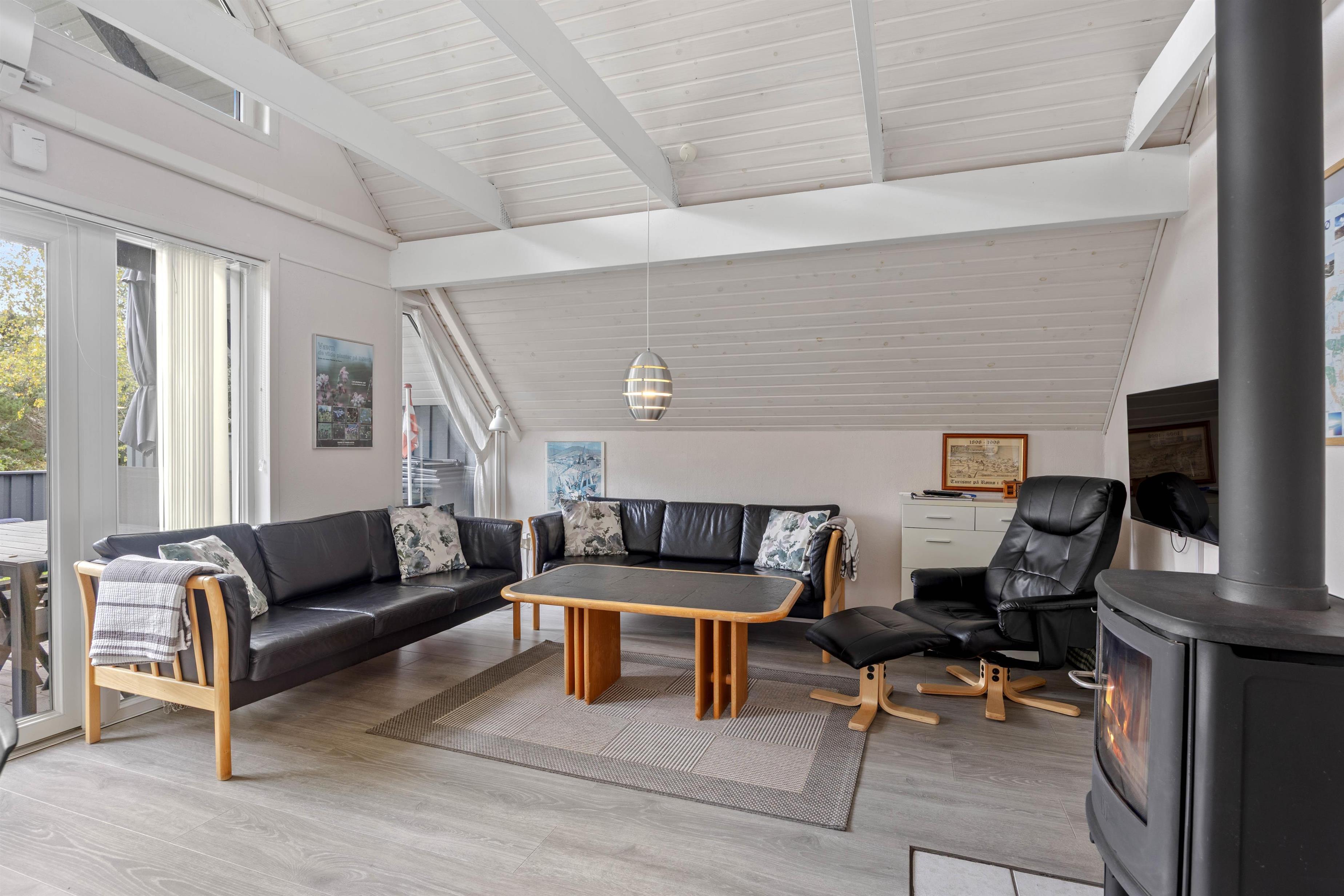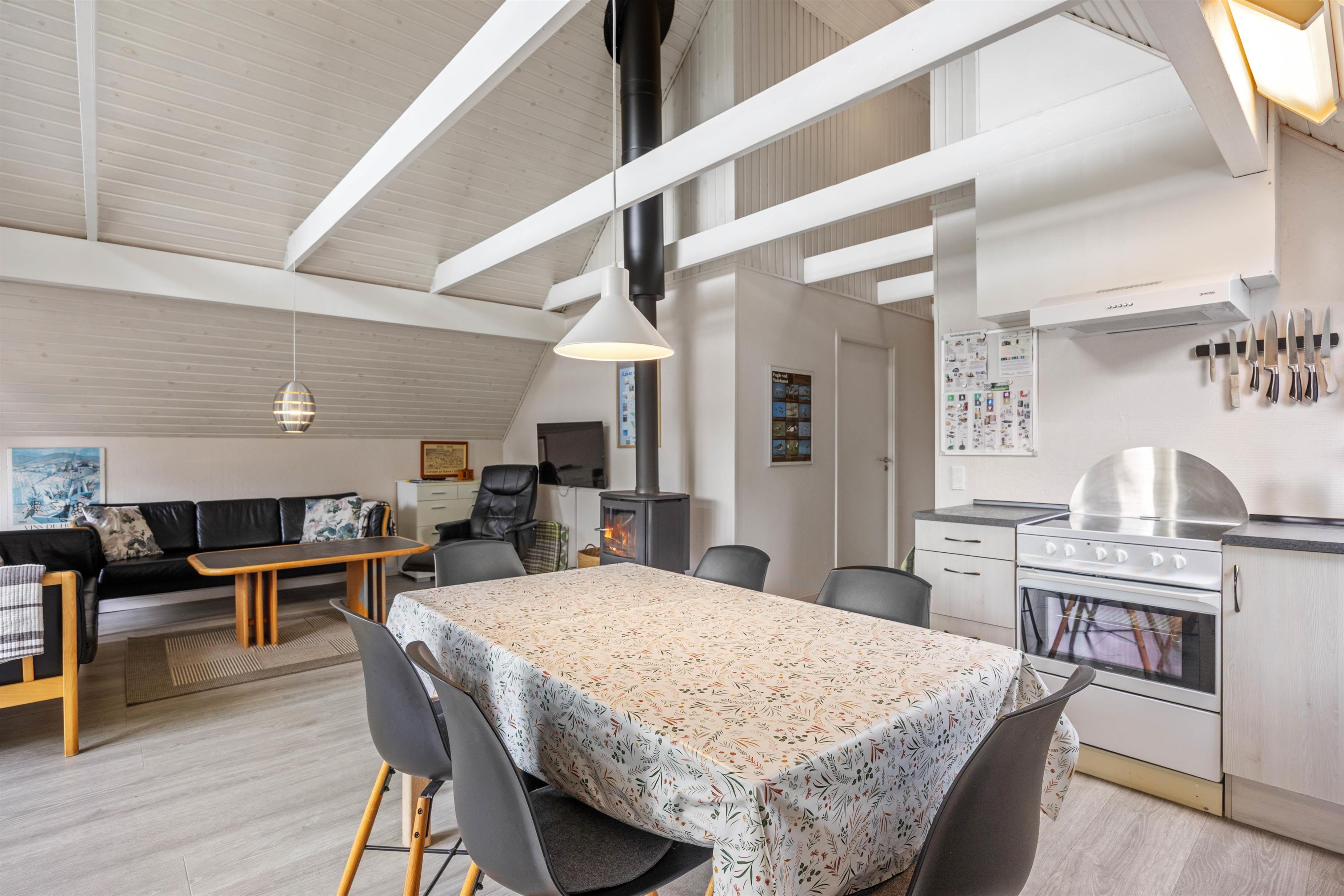 Når I træder ind i sommerhuset, bydes I velkommen af et lyst og indbydende interiør med en velafstemt indretning, der skaber en følelse af ro og hjemlighed. Den åbne stue, komplet med fladskærms-TV og en charmerende brændeovn, danner rammen om hyggelige aftener og samvær. Her mærkes en omhyggelig opmærksomhed for detaljerne, som forstærker den trygge atmosfære og gør det nemt at slappe af. Den rolige stemning i rummet indbyder til stille stunder, hvor man kan lade tankerne flyve, mens den hjemlige indretning giver en følelse af sikkerhed og velvære. Køkkenet, der fungerer som husets hjerte, er udstyret med moderne faciliteter såsom opvaskemaskine, mikroovn, et køleskab med integreret frostboks samt et el-komfur med ovn – alle nøje udvalgt for at gøre madlavningen til en fornøjelse. Det gennemtænkte design af køkkenet skaber en indbydende plads, der både støtter praktisk tilberedning af måltider og bidrager til fællesskabet om spisebordet. De komfortable soveværelser, indrettet med bløde tæpper og et velovervejet valg af belysning, bidrager til en beroligende atmosfære, der sikrer en fredfyldt nattesøvn for både børn og voksne. Desuden bidrager gratis fibernet til en underholdende hverdag, så I altid føler jer opdaterede og forbundet. Et særligt højdepunkt er saunaen, der tilbyder en luksuriøs mulighed for afslapning og velvære – perfekt til at genoplade batterierne efter en aktiv dag i naturen. Samlet set skaber indretningen og de moderne løsninger i huset en behagelig balance, der forener funktionalitet med en smuk indbydende atmosfære – Et sandt tilflugtssted af ro og komfort hvor I straks føler jer hjemme.