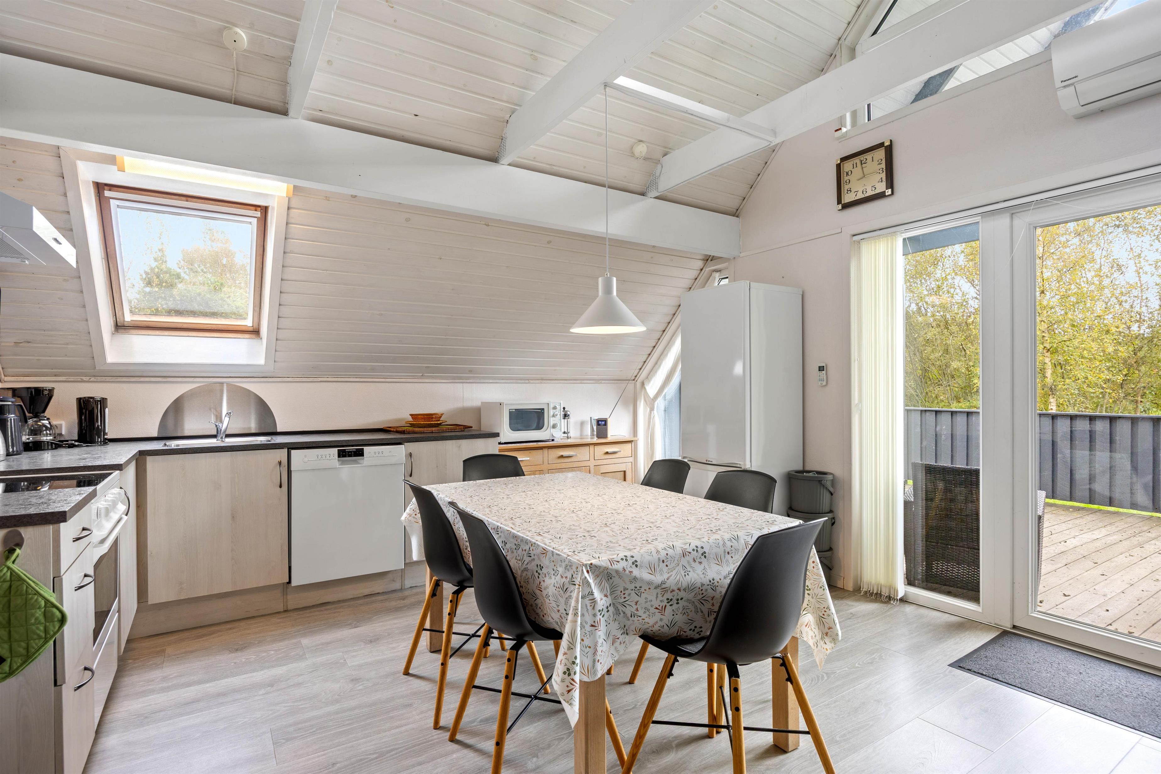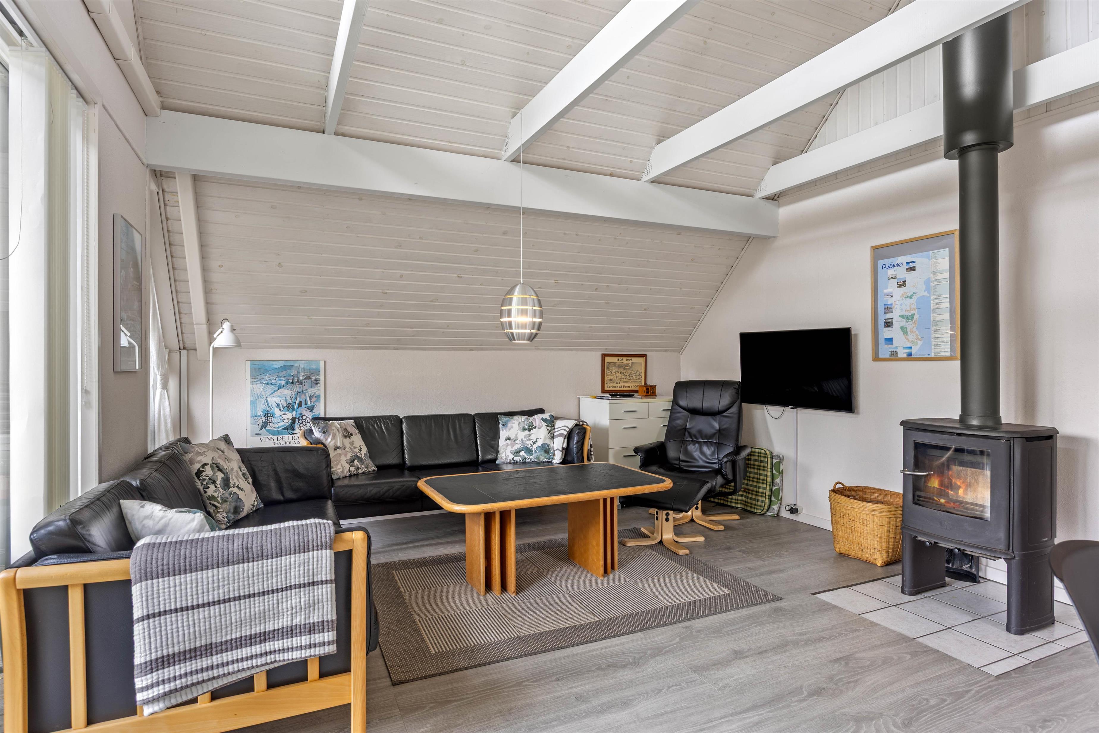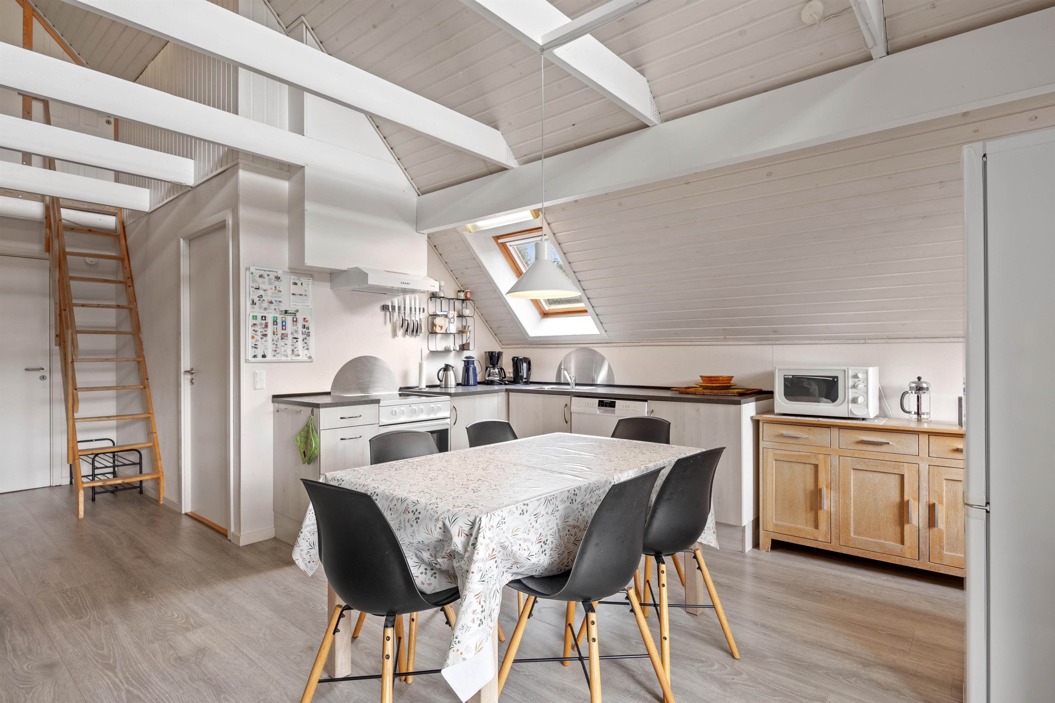 Når I træder ind i sommerhuset, bydes I velkommen af et lyst og indbydende interiør med en velafstemt indretning, der skaber en følelse af ro og hjemlighed. Den åbne stue, komplet med fladskærms-TV og en charmerende brændeovn, danner rammen om hyggelige aftener og samvær. Her mærkes en omhyggelig opmærksomhed for detaljerne, som forstærker den trygge atmosfære og gør det nemt at slappe af. Den rolige stemning i rummet indbyder til stille stunder, hvor man kan lade tankerne flyve, mens den hjemlige indretning giver en følelse af sikkerhed og velvære. Køkkenet, der fungerer som husets hjerte, er udstyret med moderne faciliteter såsom opvaskemaskine, mikroovn, et køleskab med integreret frostboks samt et el-komfur med ovn – alle nøje udvalgt for at gøre madlavningen til en fornøjelse. Det gennemtænkte design af køkkenet skaber en indbydende plads, der både støtter praktisk tilberedning af måltider og bidrager til fællesskabet om spisebordet. De komfortable soveværelser, indrettet med bløde tæpper og et velovervejet valg af belysning, bidrager til en beroligende atmosfære, der sikrer en fredfyldt nattesøvn for både børn og voksne. Desuden bidrager gratis fibernet til en underholdende hverdag, så I altid føler jer opdaterede og forbundet. Et særligt højdepunkt er saunaen, der tilbyder en luksuriøs mulighed for afslapning og velvære – perfekt til at genoplade batterierne efter en aktiv dag i naturen. Samlet set skaber indretningen og de moderne løsninger i huset en behagelig balance, der forener funktionalitet med en smuk indbydende atmosfære – Et sandt tilflugtssted af ro og komfort hvor I straks føler jer hjemme.