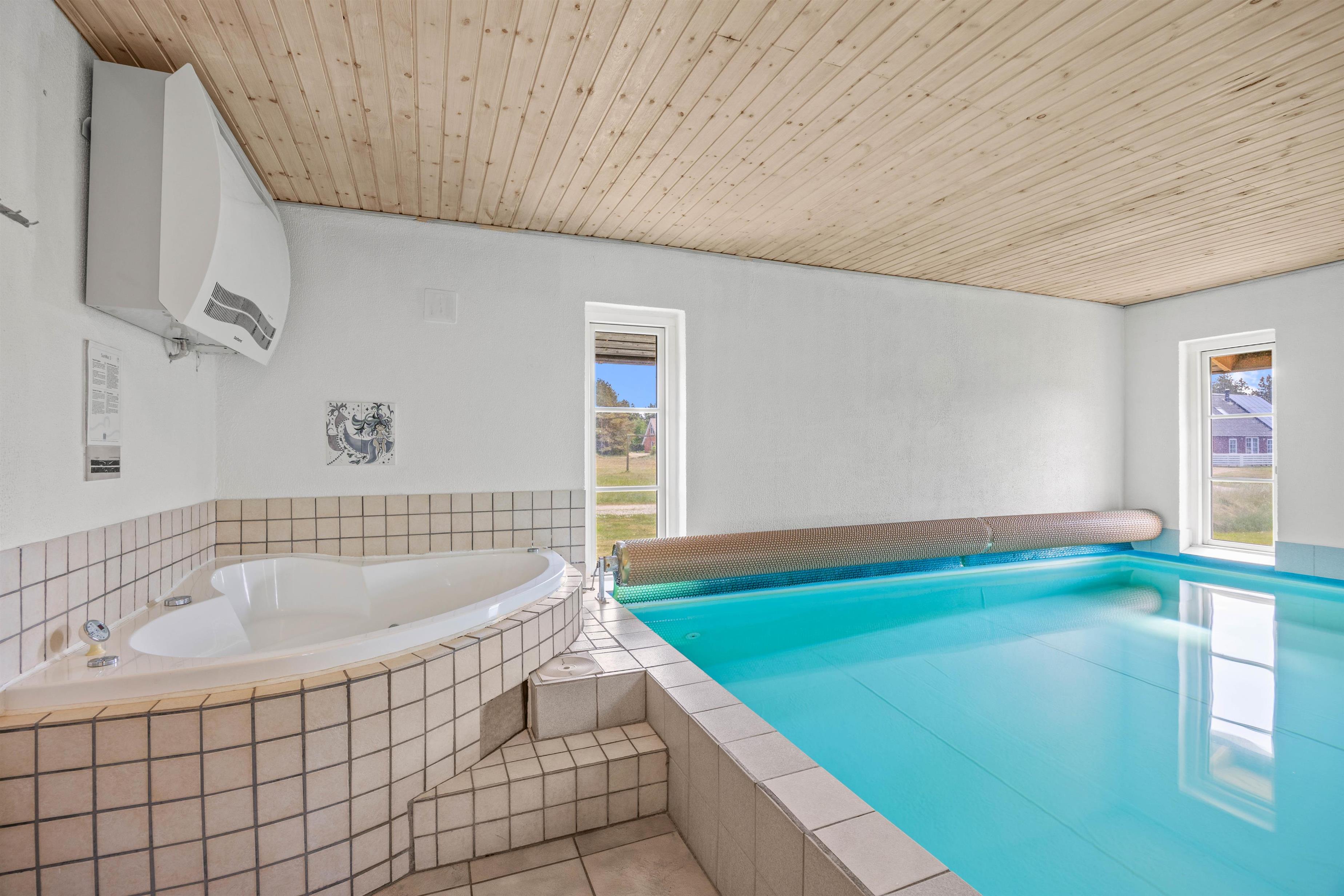 Sommerhusets 28 m² store swimmingpool er et absolut højdepunkt, der giver mulighed for badning året rundt. Derudover kan du lade hverdagens stress forsvinde i saunaen eller spabadet. Udenfor venter et paradis for børn med gynger, sandkasse og trampolin, mens du kan nyde en stille stund på den lukkede terrasse. Når aftenen falder på, indbyder grillen til hyggelige stunder med familie og venner under den åbne himmel.