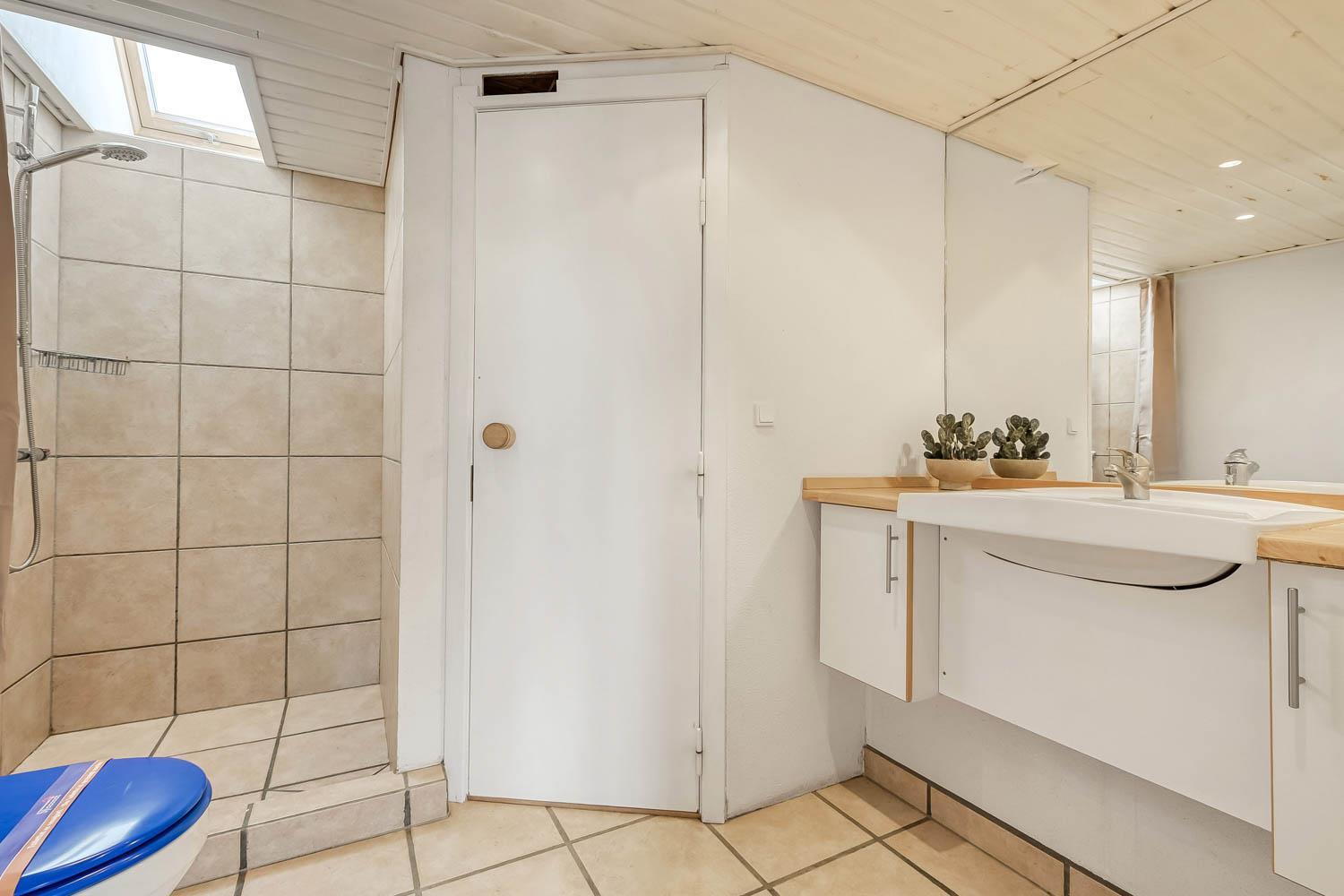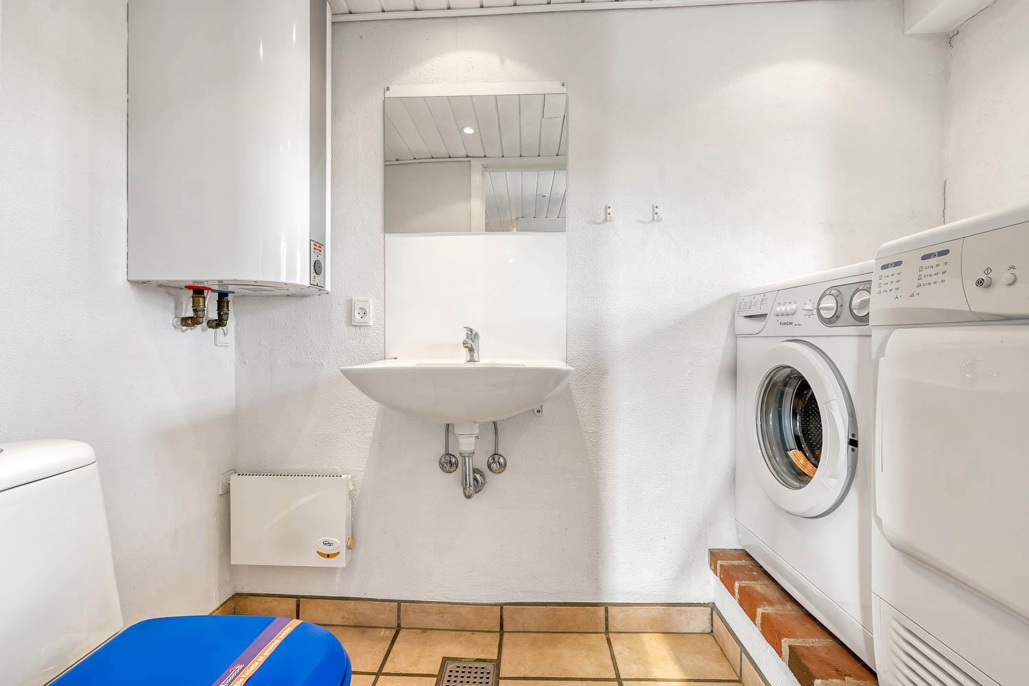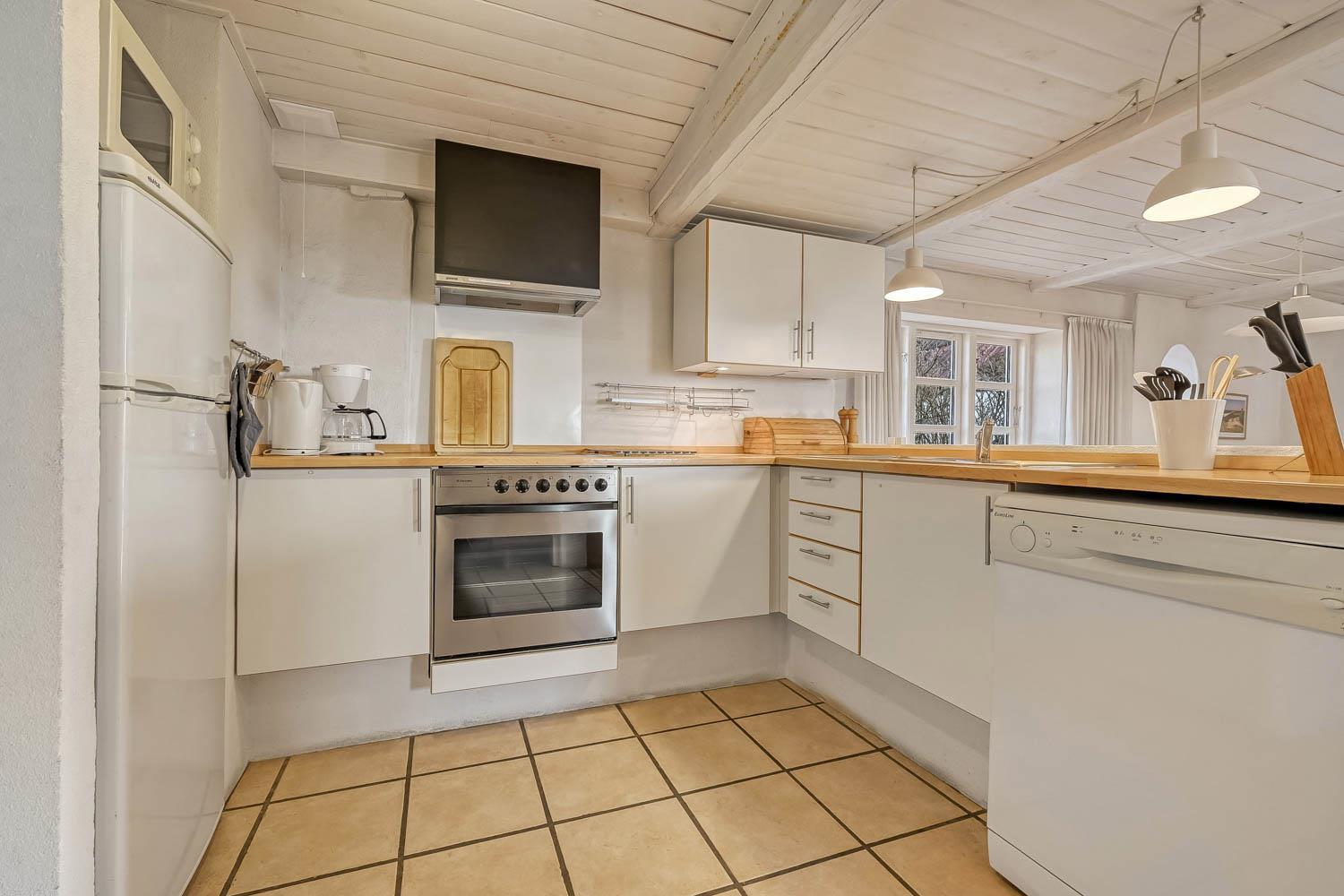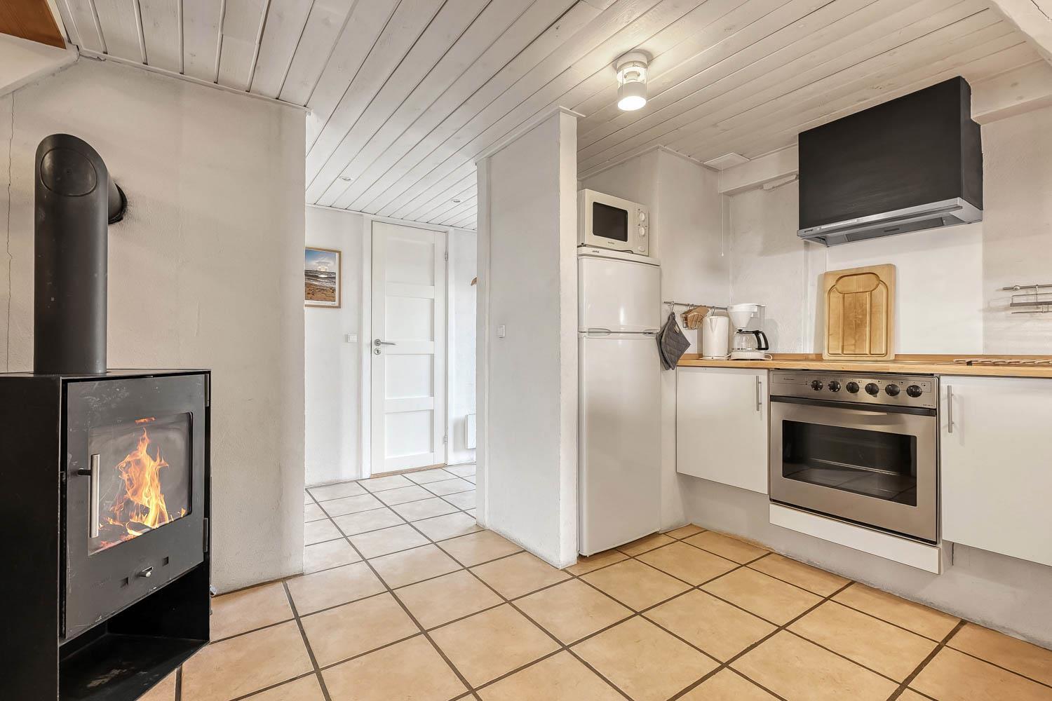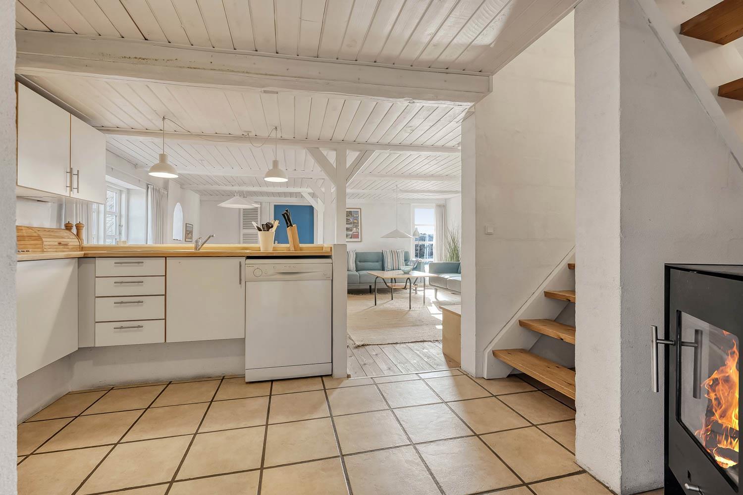 I stueetagen byder boligen på en indbydende entré med adgang til badeværelse med gulvvarme, sauna og bruseniche – perfekt efter en frisk tur langs stranden. Derudover er der gæstetoilet med vaskemaskine og tørretumbler. Det fuldt udstyrede køkken med keramisk kogeplade, varmluftovn, mikroovn, opvaskemaskine, køleskab med frostboks og kaffemaskine har brændeovn og ligger i åben forbindelse med spise- og opholdsstuen. Her er der god plads til hyggelige måltider og afslapning foran tv’et, som er udstyret med DVD, parabol og stereoanlæg med CD. Overalt i lejligheden er der flotte træ- og klinkegulve.