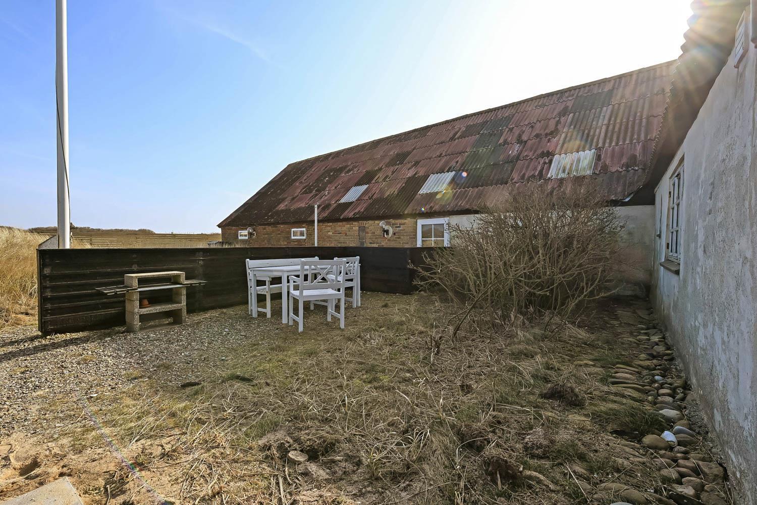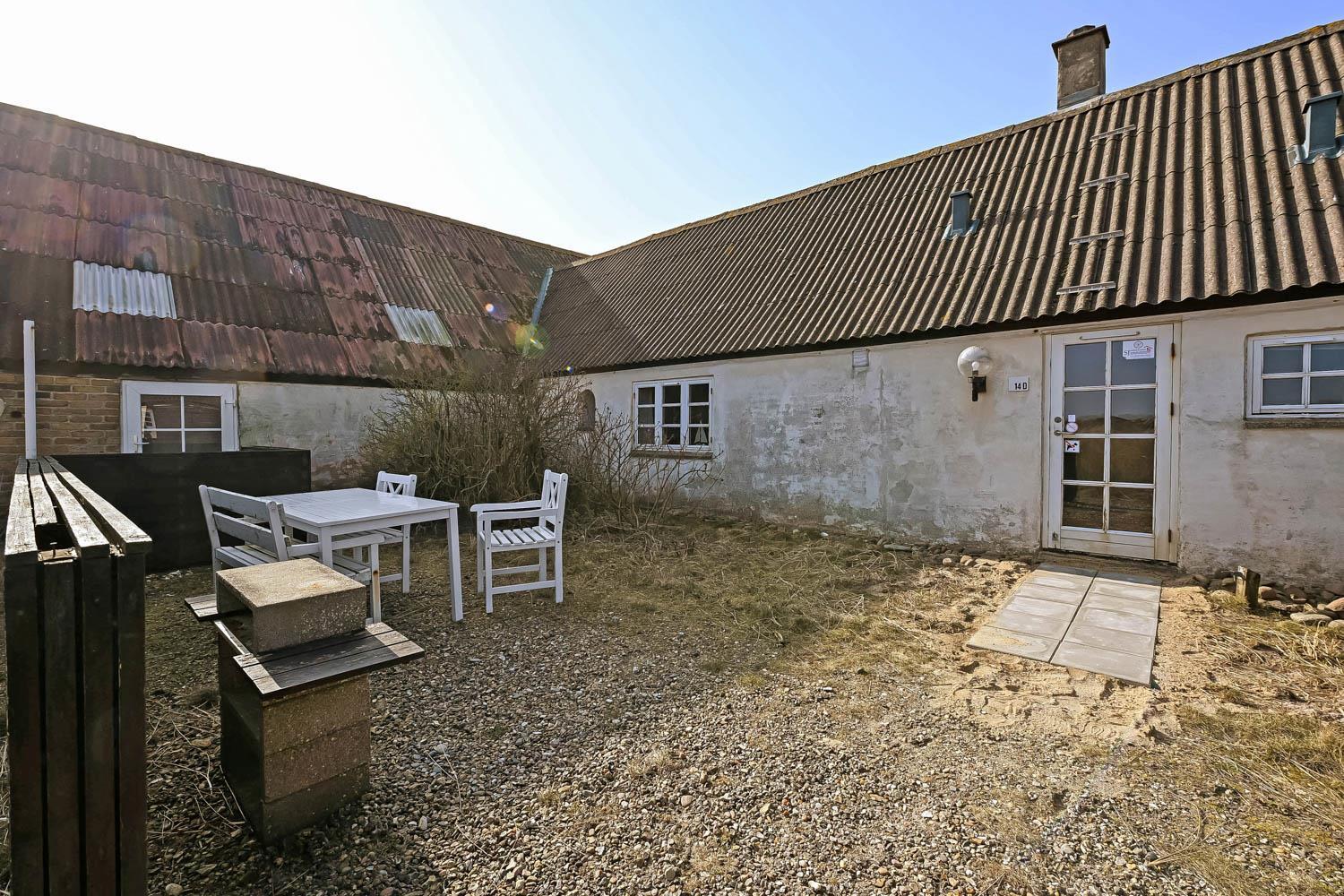 Udenfor finder I en charmerende gårdsplads anlagt med strandklitter beplantet med hjelm, som skaber læ og en hyggelig atmosfære omkring den ca. 50 m² store, delvist lukkede gårdhave. Her er havemøbler og grill, så feriens måltider kan nydes under åben himmel. Der hører carport til lejligheden.