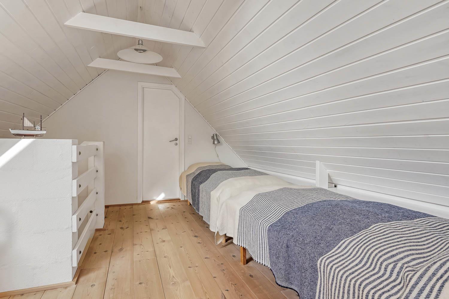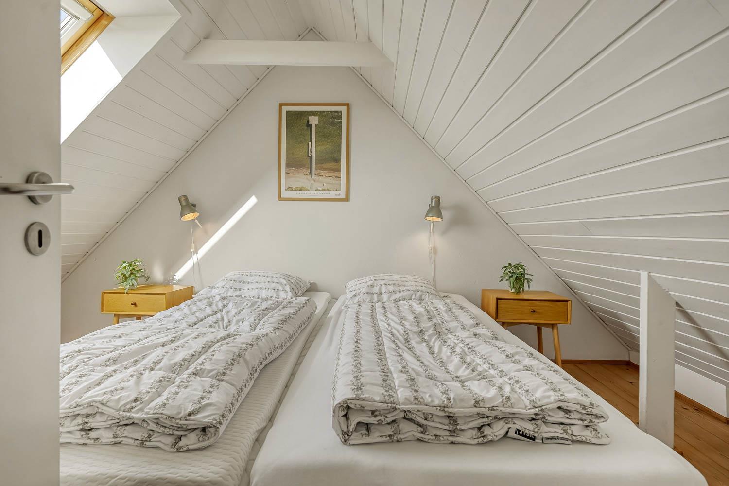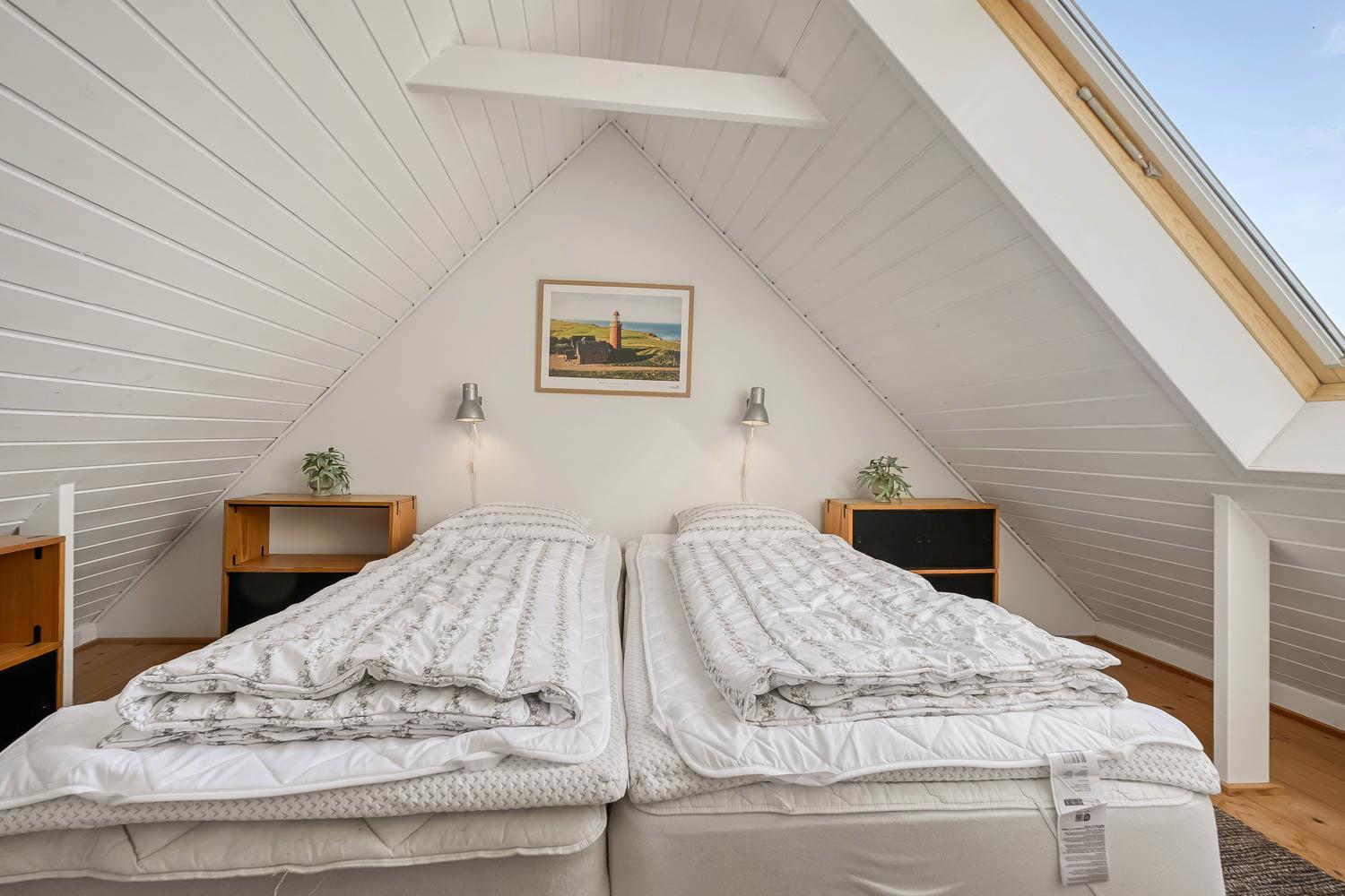 Lejligheden er lyst og charmerende indrettet. På 1. sal findes tre soveværelser: ét med dobbeltseng og to værelser med hver to enkeltsenge. Alle værelser har smuk havudsigt, så I kan vågne op til lyden af bølgerne og udsigten over Vesterhavet.