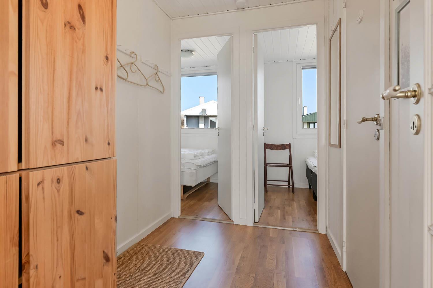 Der er trægulve i alle opholdsrum og soverum, hvilket giver en varm og behagelig atmosfære.