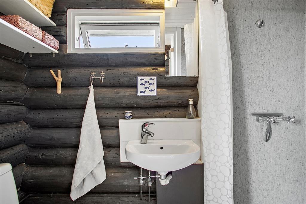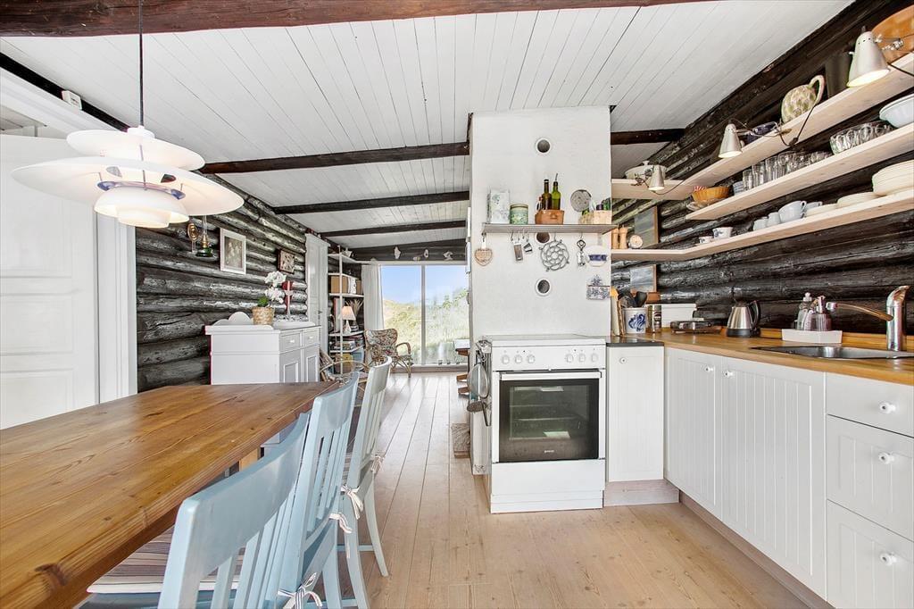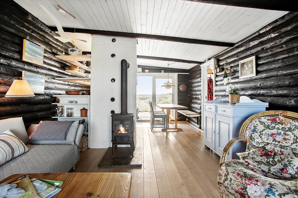 Huset passer perfekt til den ugenerede og naturskønne adresse, for med sit grønne tag smelter det næsten sammen med omgivelserne. Huset er bygget af 100 år gamle telefonmaster fra 1920´erne og kigger man godt efter, kan der stadig findes gamle fodspor i træet. Planløsningen byder kort fortalt på et badeværelse, to soveværelser med mindre dobbeltsenge samt en køje, og et opholdsrum med integreret køkken og stue. Her er intet tv, men til gengæld den flotteste udsigt, som opholdsrummets store vinduespartier åbenbarer. Med andre ord kan I fuldt ud nyde samværet, de gode samtaler og muligheden for at fordybe sig i en spændende bog nær brændeovnen – og som en sidebemærkning er der internet, så I stadig kan følge med i nyhederne.