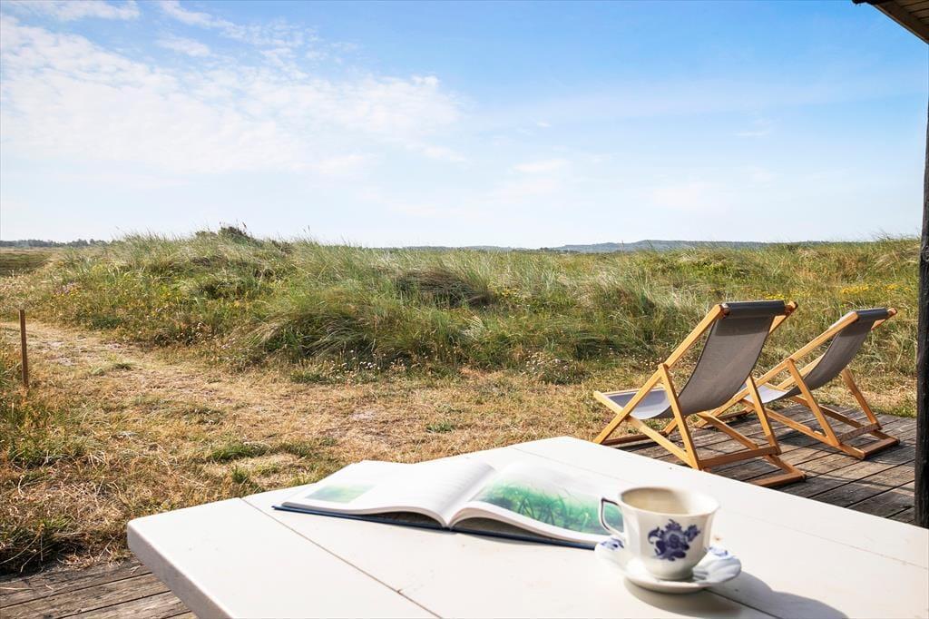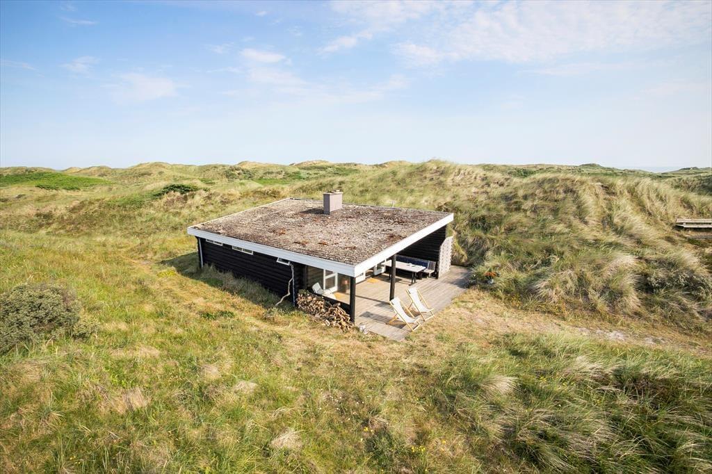 Grunden er en kuperet klitgrund på hele 4160 m2, og der er kun naboer til to sider. De kan for øvrigt slet ikke ses fra huset, for det er placeret i en gryde mellem klitterne. Også udelivet på den delvist overdækkede terrasse kan I nyde helt uforstyrret. En grill er til rådighed, hvis I vil kokkerere under åben himmel, og efter morgendukkerten i Vesterhavet kan I skylle sand og saltvand af jer under den udendørs bruser. Der er gode parkeringsforhold nedenfor en lille bakke til huset.