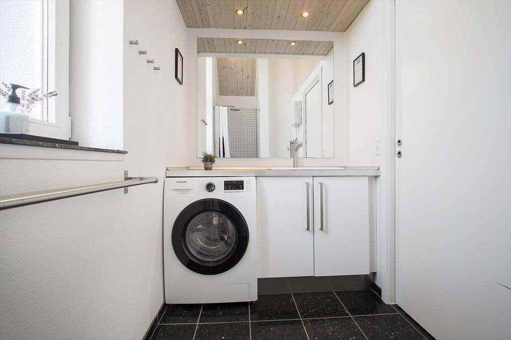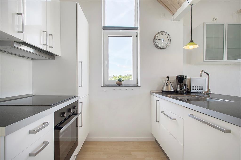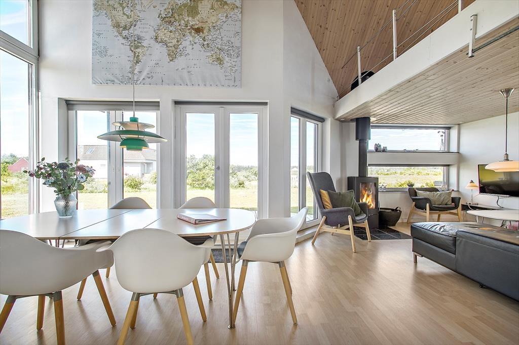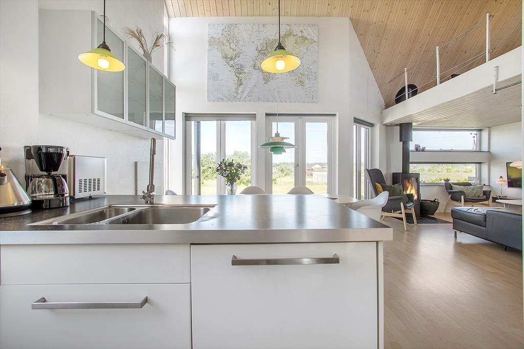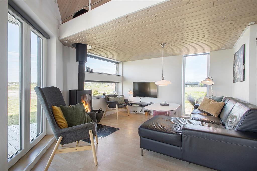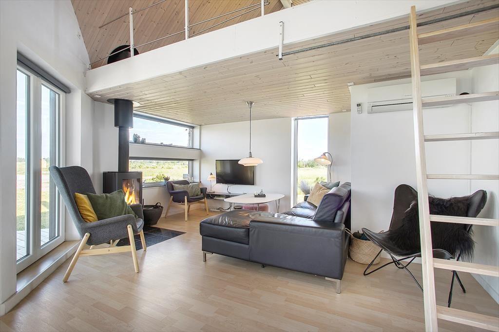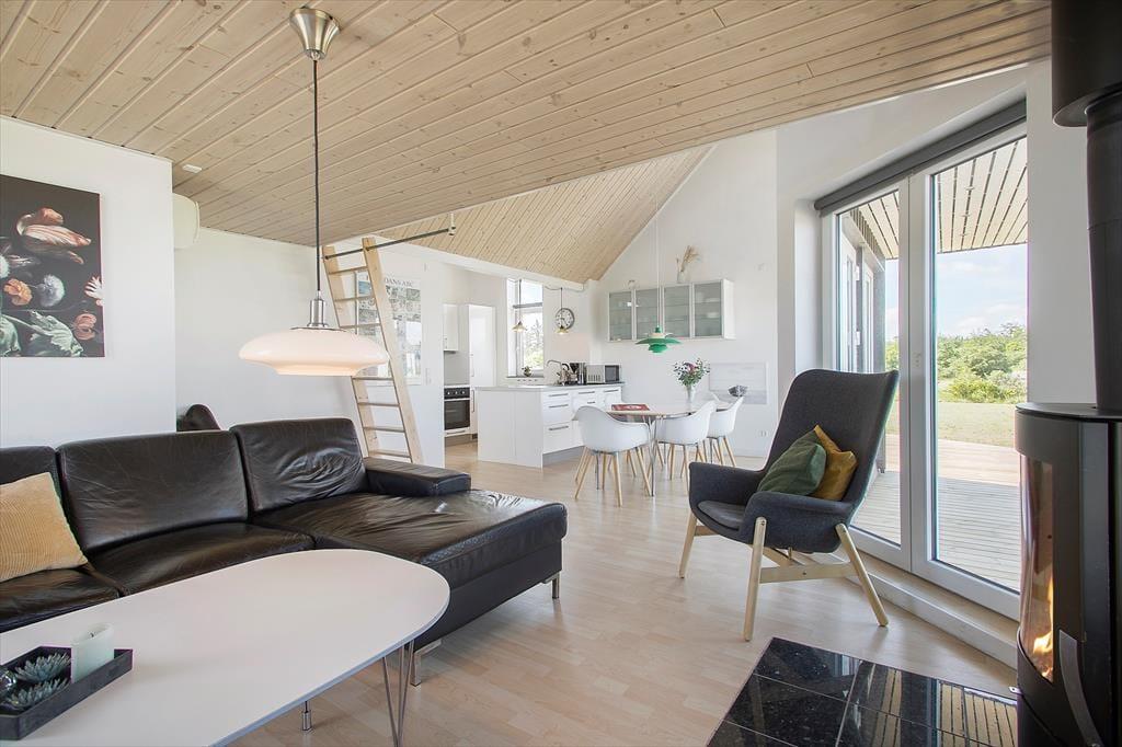 Ferieboligen, som er opført i 2009, er indrettet på flot og funktionel vis, og takket være den atypiske og meget charmerende arkitektur er der højt til loftet og et godt lysindfald inden døre. Det gælder på de to soveværelser. Stuen prydes af en brændeovn, som er placeret på hyggelig vis i sofakrogen, hvor et tv med Chromecast også er klar til at levere underholdningen. Spisebordet står nær det flotte åbne køkken, der er udstyret med opvaskemaskine og andre gode hvidevarer. Vaskemaskine og tørretumbler er begge at finde på badeværelset, der fremstår lige så pænt og indbydende som de øvrige rum.