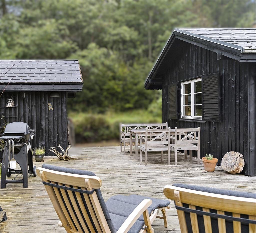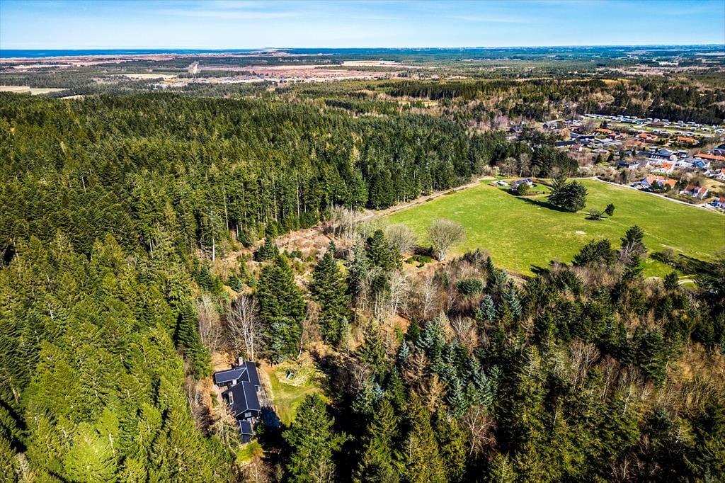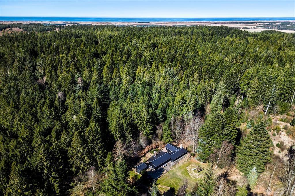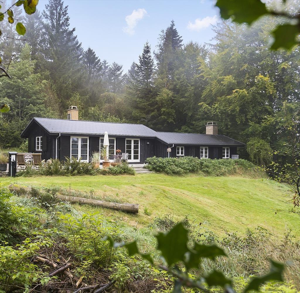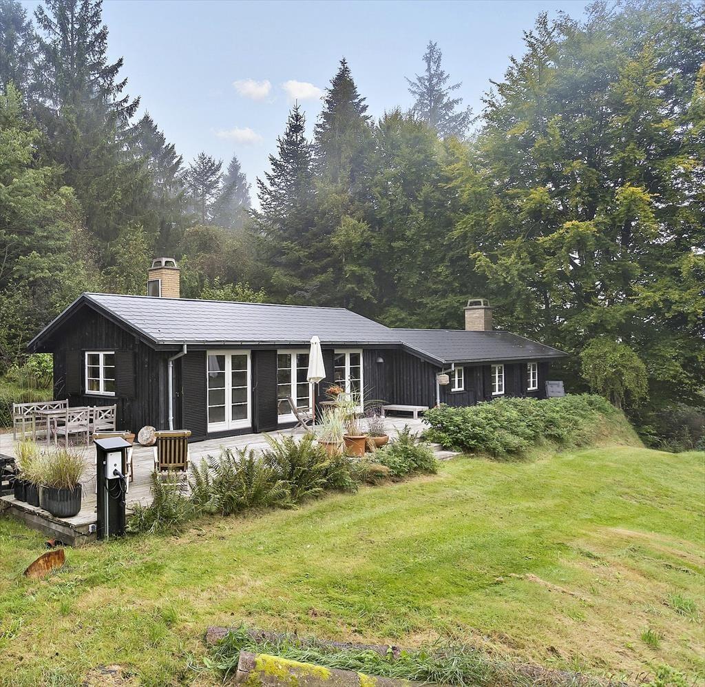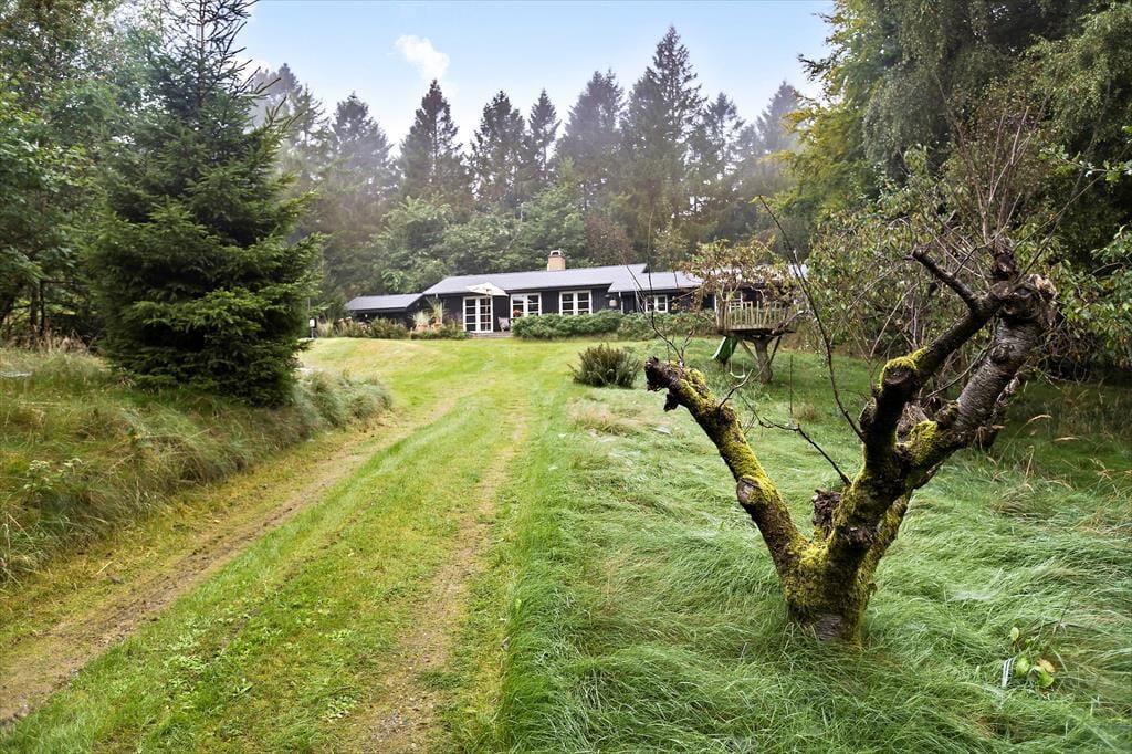 Sommerhuset ligger helt ugeneret i "skovens dybe stille ro" på kanten af Langdal Plantage. Grunden er kuperet og beliggende for enden af en forholdsvis stejl skovvej, hvilket giver en unik følelse af fred og privatliv. Fra terrassen kan du høre fuglene synge og måske spotte et rådyr, der bevæger sig gennem skoven – naturen er lige uden for døren.