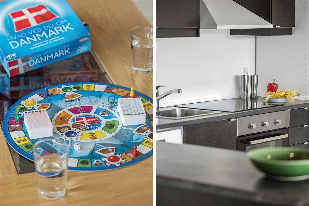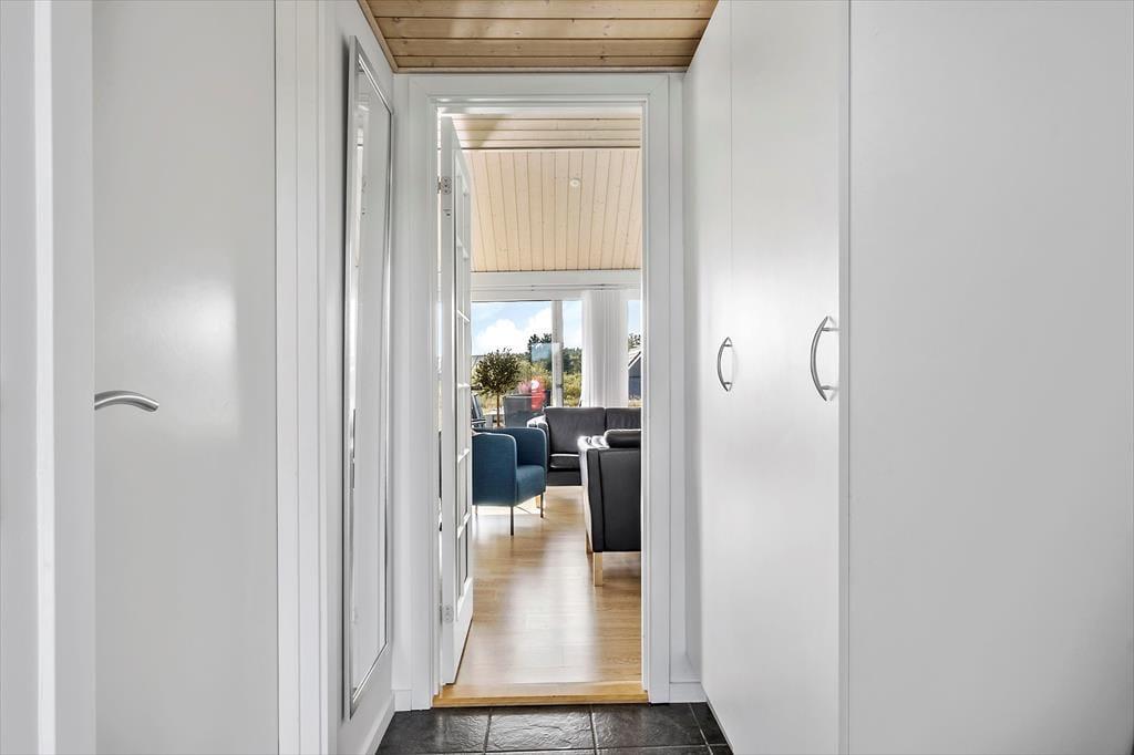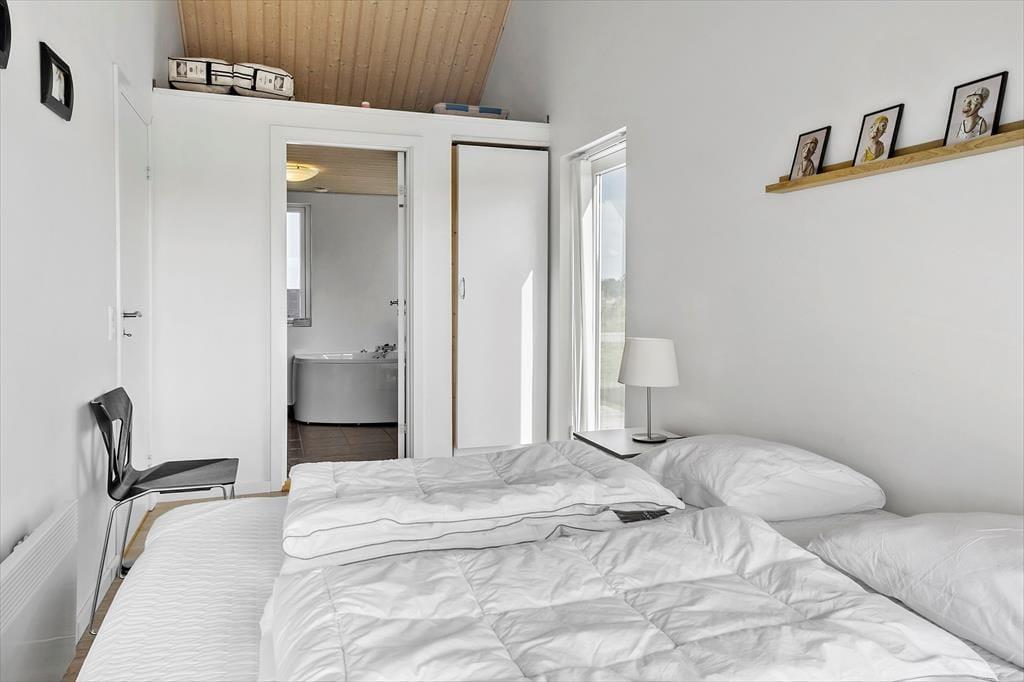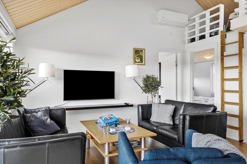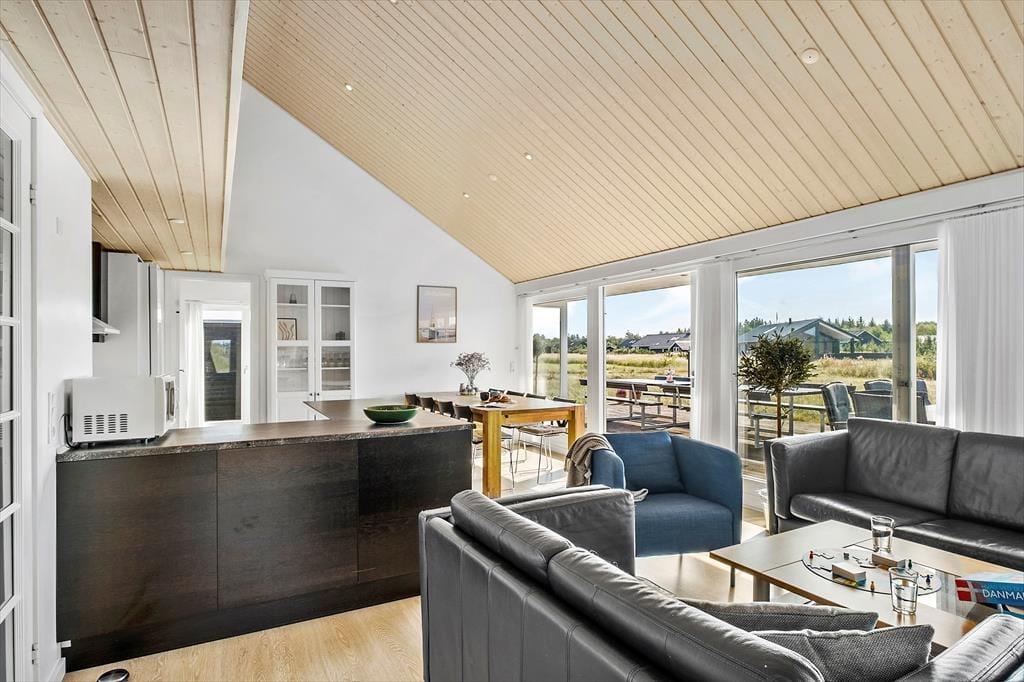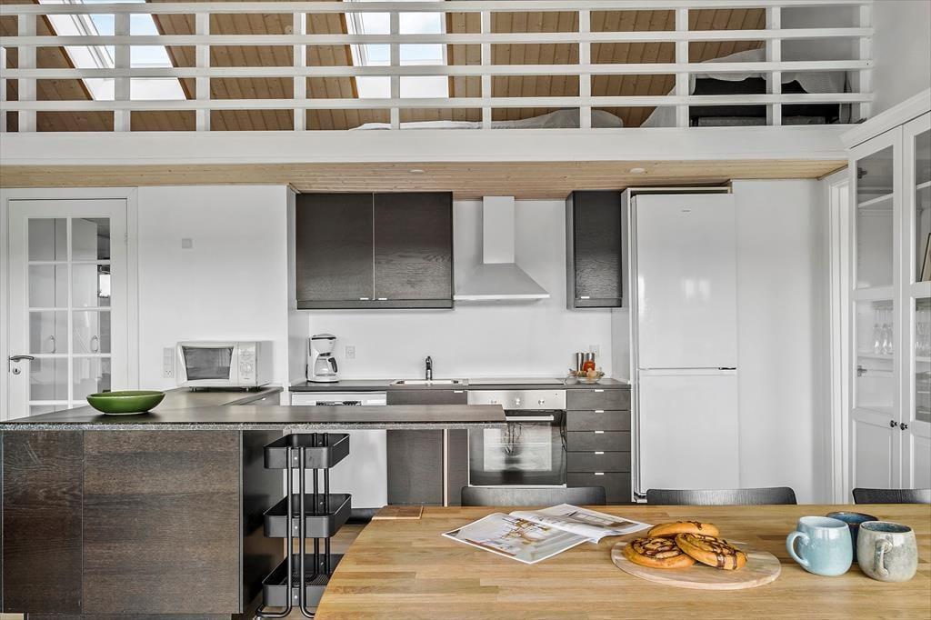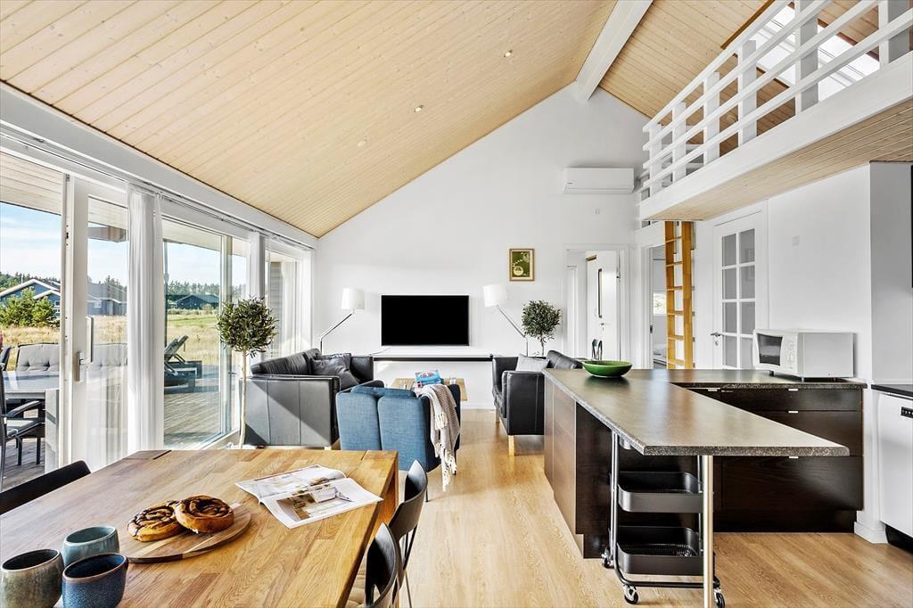 Indenfor venter en varm atmosfære, hvor du hurtigt mærker, at her kan skuldrene falde ned. Stuen er lyst indrettet og indbyder til både hyggelige måltider og afslapning efter en dag ude i naturen. Køkkenet ligger i åben forbindelse med opholdsrummet, så du kan snildt være en del af samtalen, mens du tilbereder feriens livretter. Når dagen lakker mod enden, kan du nyde at trække ind i wellness-afdelingen, hvor spabad og sauna skaber rammerne for ren afslapning. Når trætheden melder sig, venter hyggelige soveværelser og en hems, som gør det let at fordele jer, hvis I er flere familier eller vennepar afsted sammen.