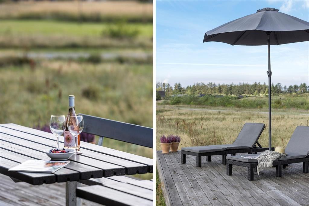 Sommerhuset ligger på en skøn grund, hvor terrassen næsten går hele vejen rundt om huset. Det betyder, at du kan følge solen i løbet af dagen – fra morgenkaffen i det første lys til aftensmaden på grillen under den lune sommeraftenhimmel. Der er rigeligt med havemøbler, så hele familien kan samles til hyggestunder ude i det fri, og børnene kan lege på græsset, mens de voksne finder ro i liggestolene. Terrassen skaber en naturlig ramme for feriens små øjeblikke: et glas vin i aftensolen, en god bog i skyggen eller fælles brætspil under åben himmel.