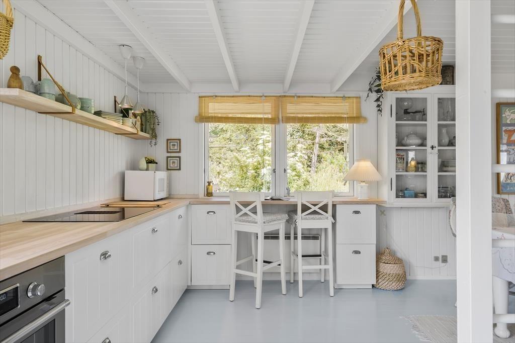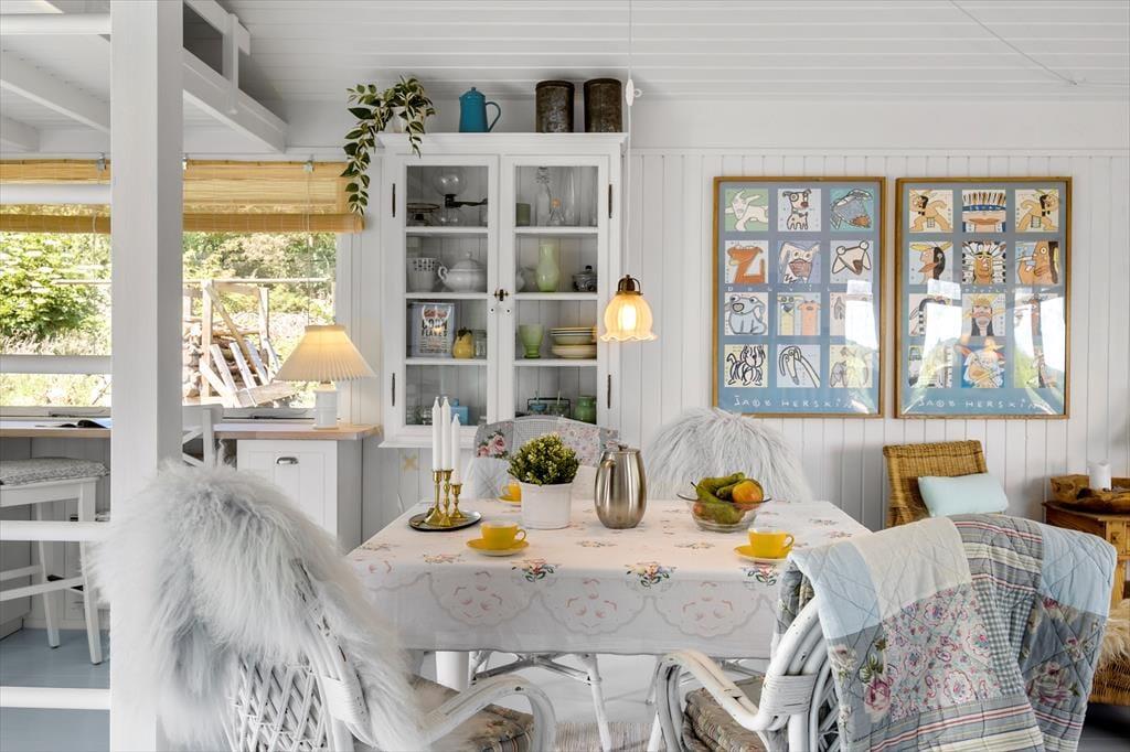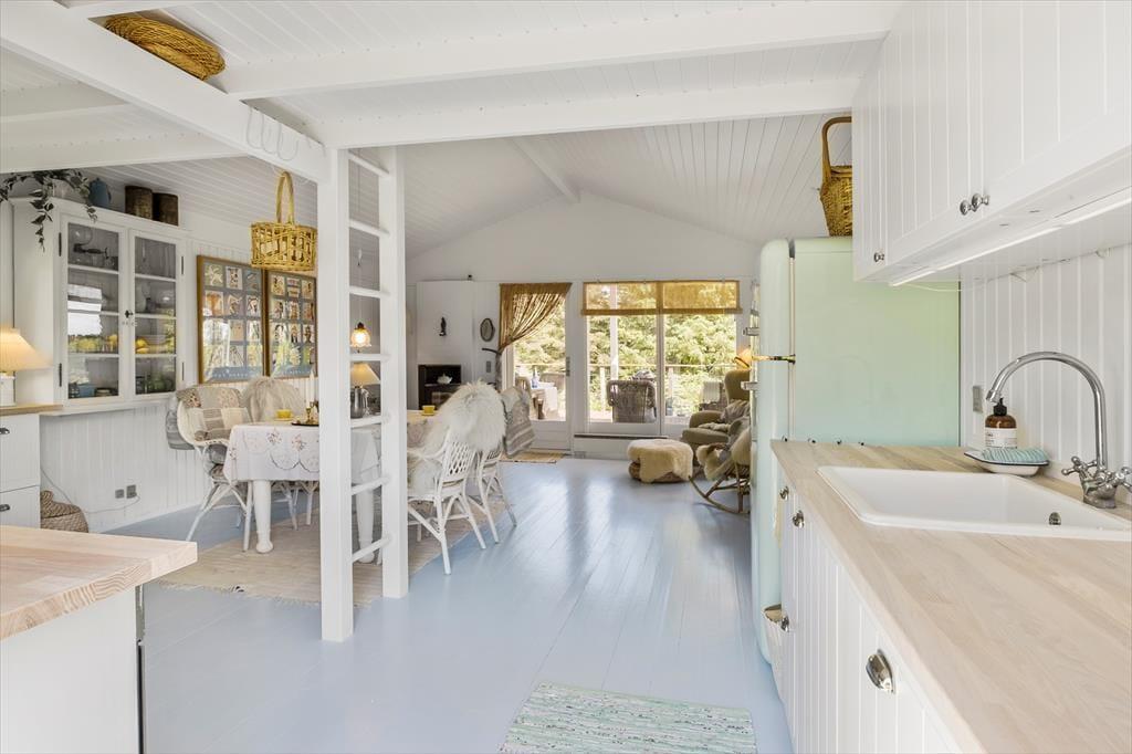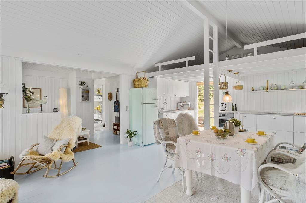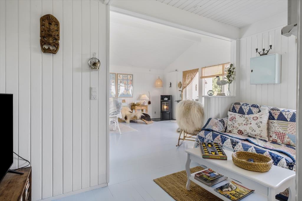 Træd ind i 66 m² ægte dansk sommerhusidyl, hvor hyggen er i højsædet. Indretningen er et stemningsfuldt mix af nye og gamle møbler, nøje udvalgte pyntegenstande og bløde tekstiler, som tilsammen skaber en varm og personlig atmosfære. Det charmerende landkøkken passer perfekt til husets stil og er samtidig praktisk indrettet med opvaskemaskine, så der er god tid til samvær og afslapning. Her er rigelig bordplads og alt det udstyr, I behøver for at trylle lækre måltider frem. I forlængelse af køkkenet ligger en lille, hyggelig tv-stue, der indbyder til afslapning med en god bog eller en film. Her spreder brændeovnen både varme og ægte sommerhushygge, mens varmepumpen sikrer et behageligt indeklima året rundt – også på køligere dage. Sommerhuset rummer to soveværelser: ét med dobbeltseng og ét med to enkeltsenge. Her får du et lille, men særdeles stemningsfuldt fristed, hvor nærvær, natur og privatliv danner rammen om en uforglemmelig ferie.