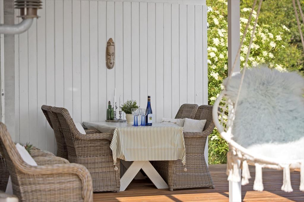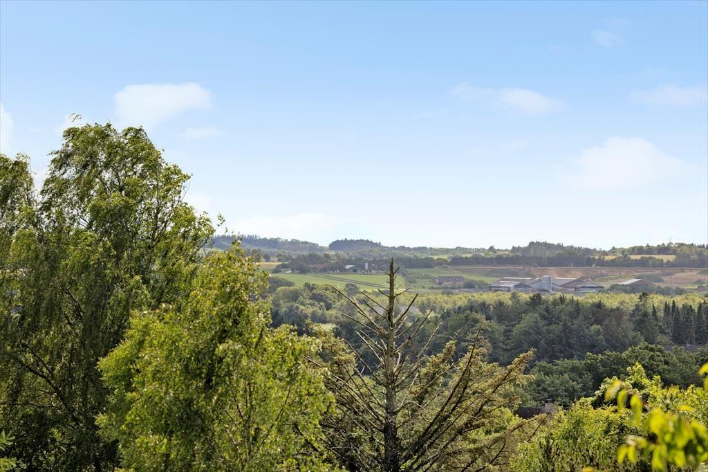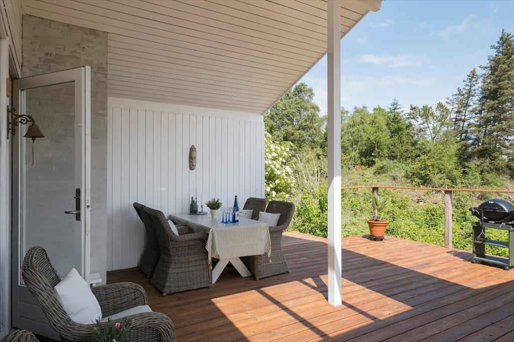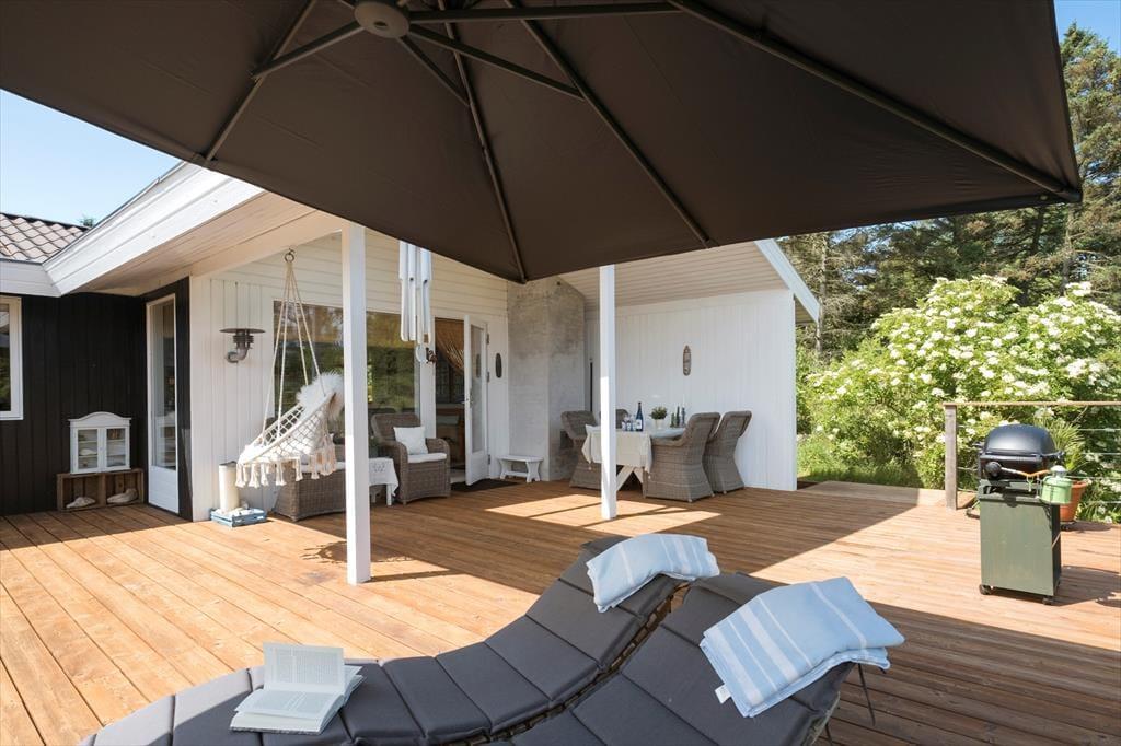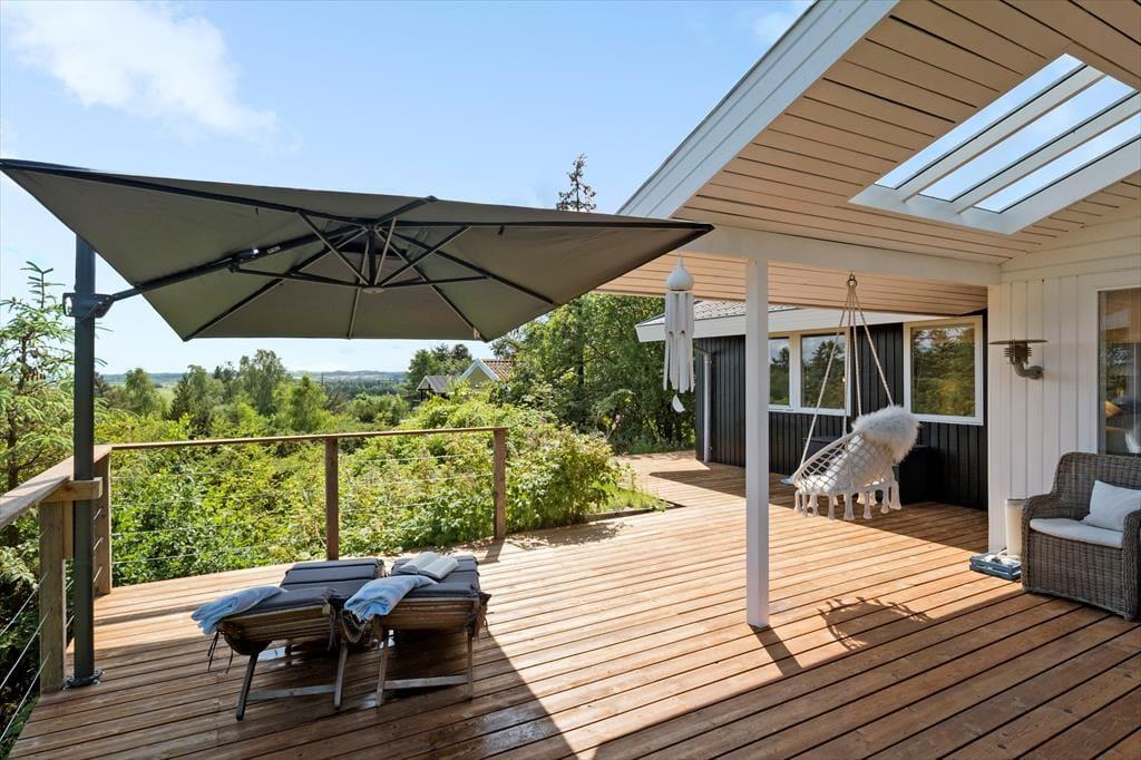 Udearealerne er husets uomtvistelige hjerte. Den store træterrasse omkranser flere sider af huset og byder på både åbne og overdækkede zoner, så du kan følge solen eller søge skygge som det passer dig. Terrassen er møbleret med komfortable loungemøbler, spisebord, parasol og grill – alt sammen placeret helt ugeneret, omkranset af lyng og høje træer, hvor blot fuglesangen bryder stilheden. Herfra har du en betagende udsigt til det kuperede, naturskønne terræn, som gør hver morgenkaffe og sommeraften til en lille oplevelse i sig selv.