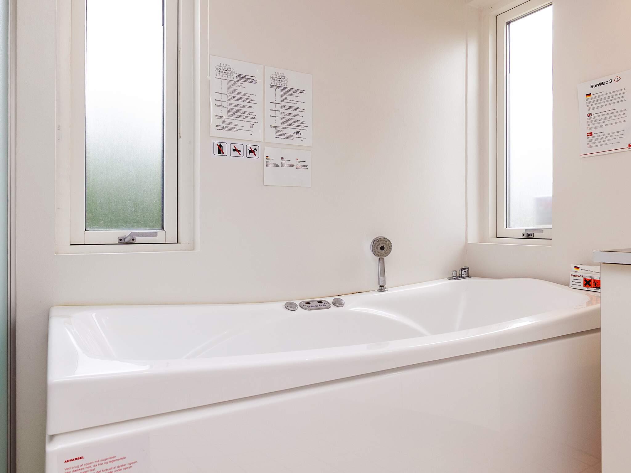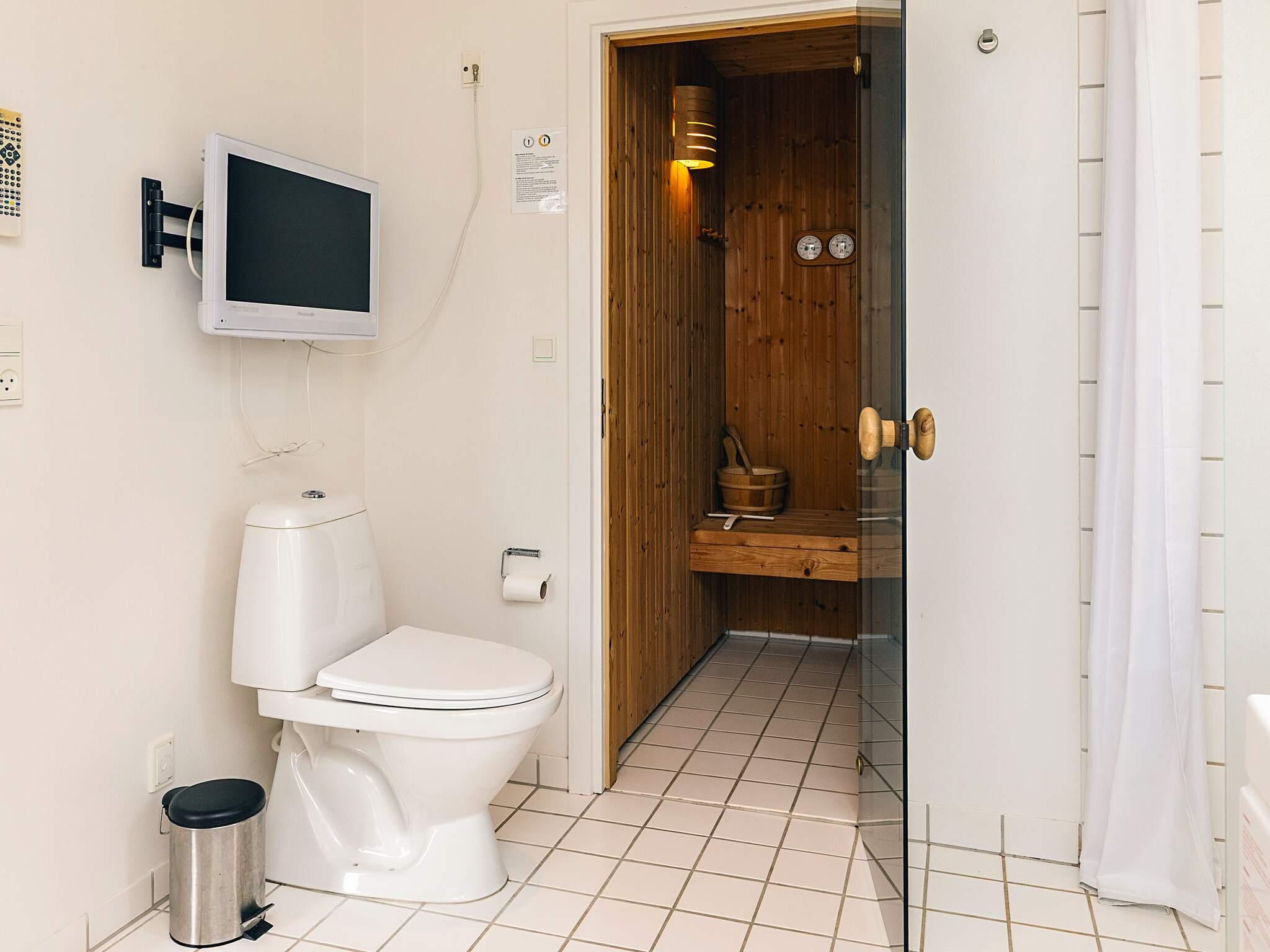 Lyst og flot badeværelse med 2-personers spabad, TV, sauna til 4 personer, badeplads, bruser og toilet.