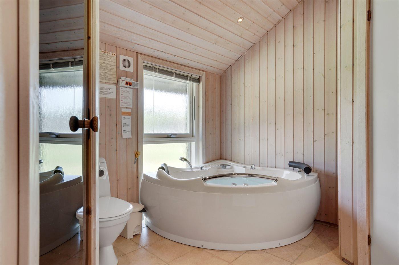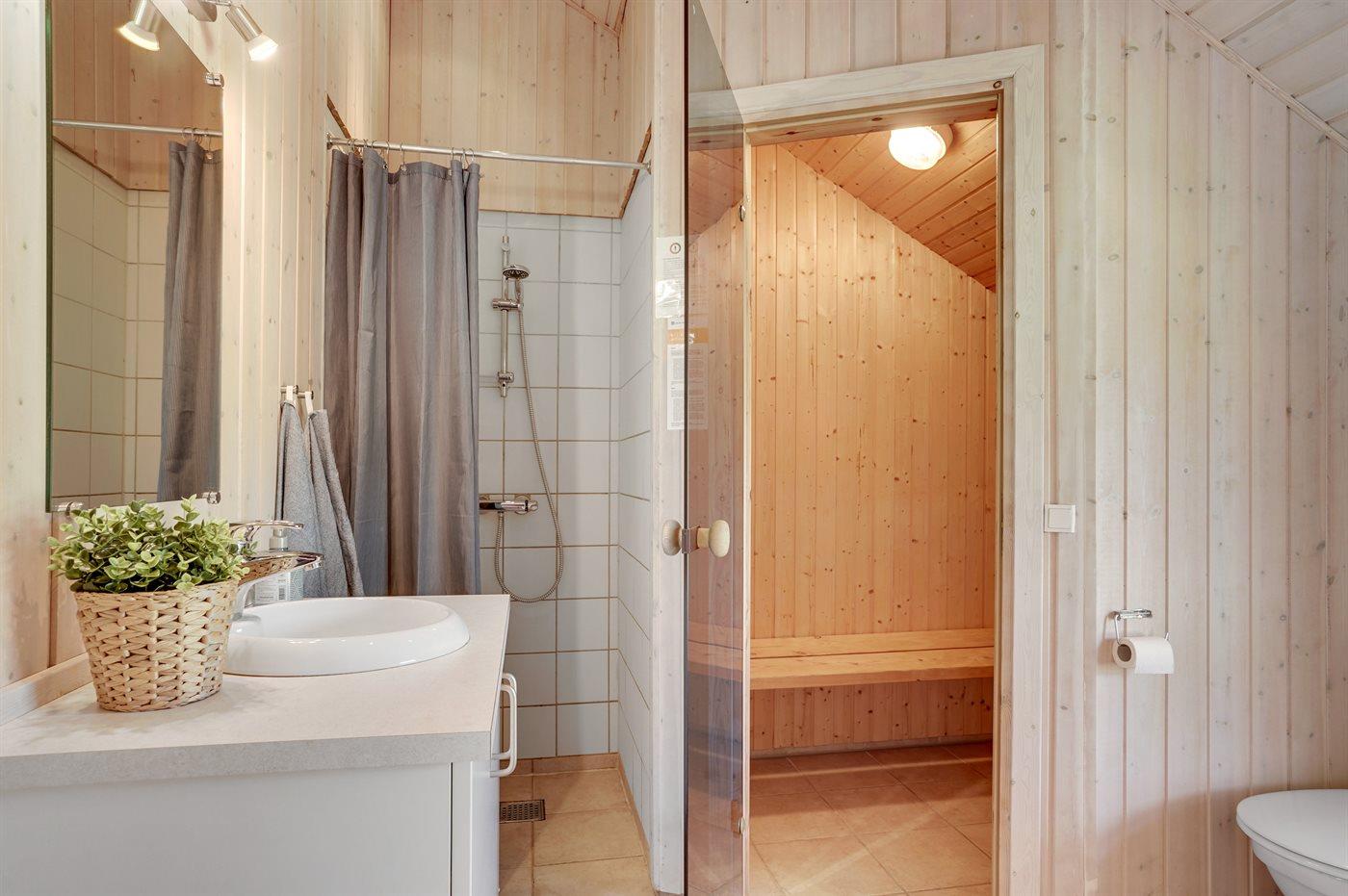 Der er 2 badeværelser med bruseniche og 2 toiletter. Der er gulvvarme på 2 badeværelser. I saunaen er der mulighed for afslapning.