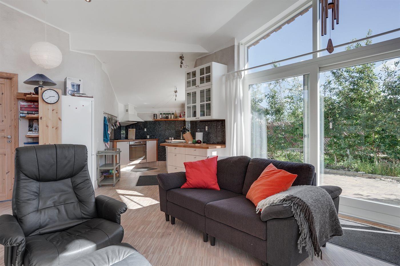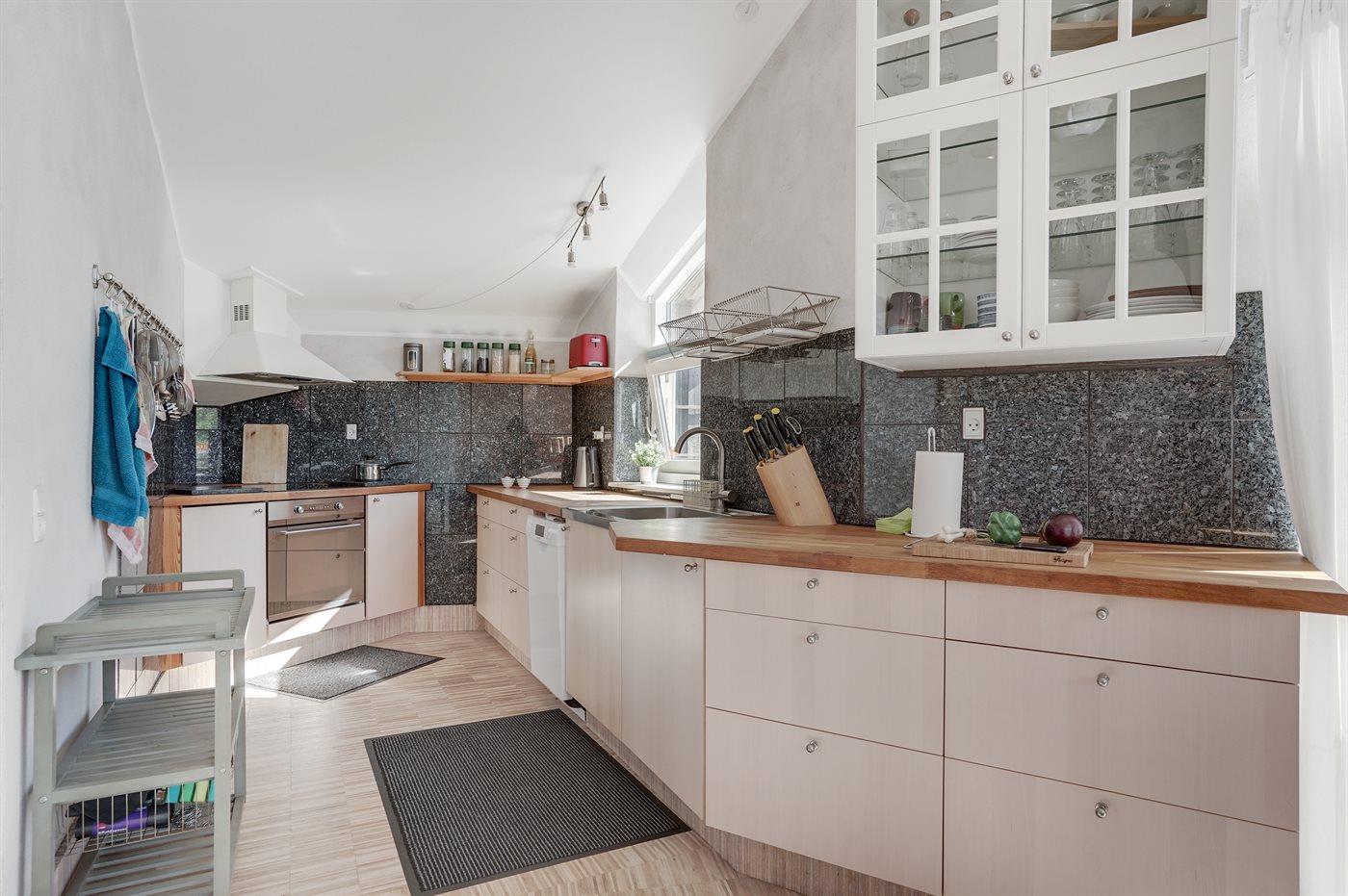 Køkkenet er udstyret med 1 køleskab. Der er 4 induktionskogeplader, varmluftovn samt opvaskemaskine.