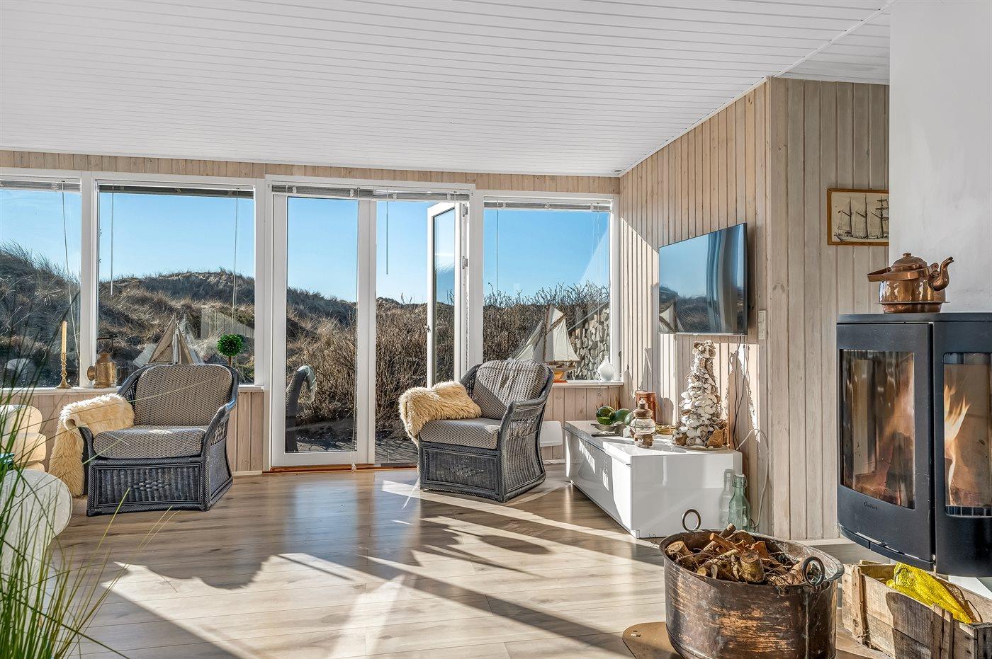 Charmerende sommerhus i første klitrække med udsigt over klitterne og havet i naturskønne Tranum.