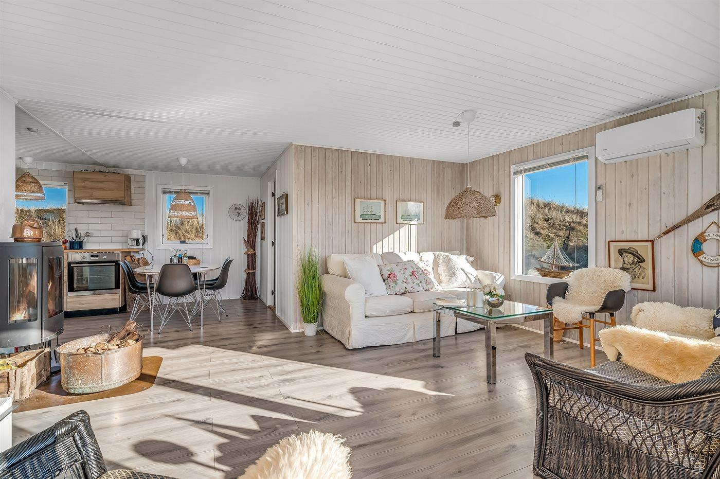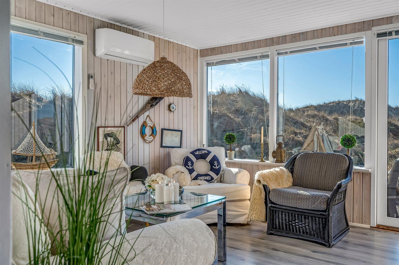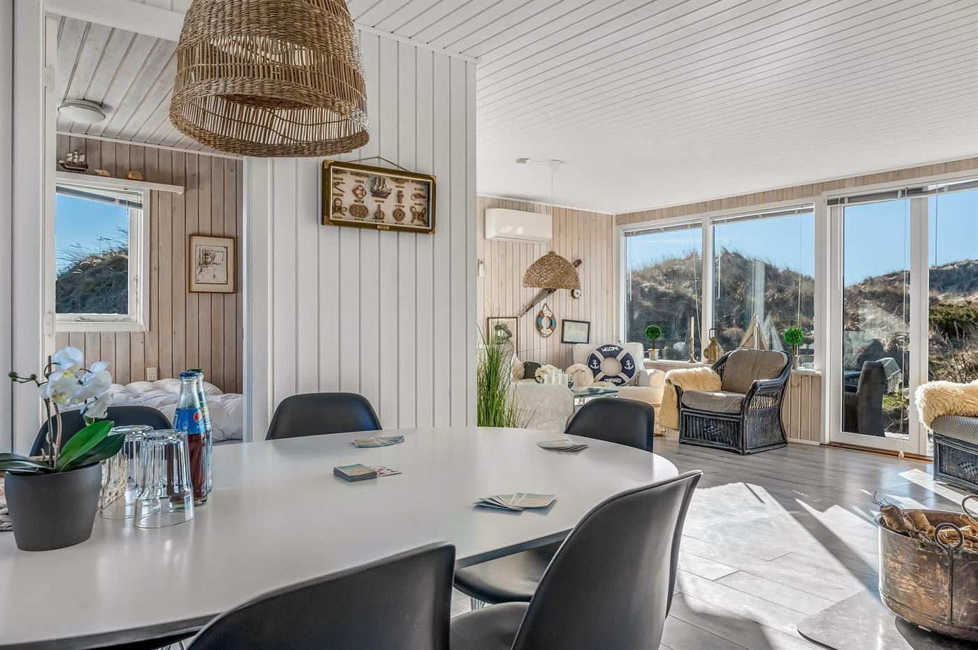 Huset er hyggeligt indrettet med lyse farver, klassiske detaljer og en varm atmosfære, der indbyder til afslapning. Her kan du nyde morgenkaffen på terrassen med udsigt over klitterne eller trække dig tilbage i de hyggelige opholdsrum efter en dag fyldt med naturoplevelser.