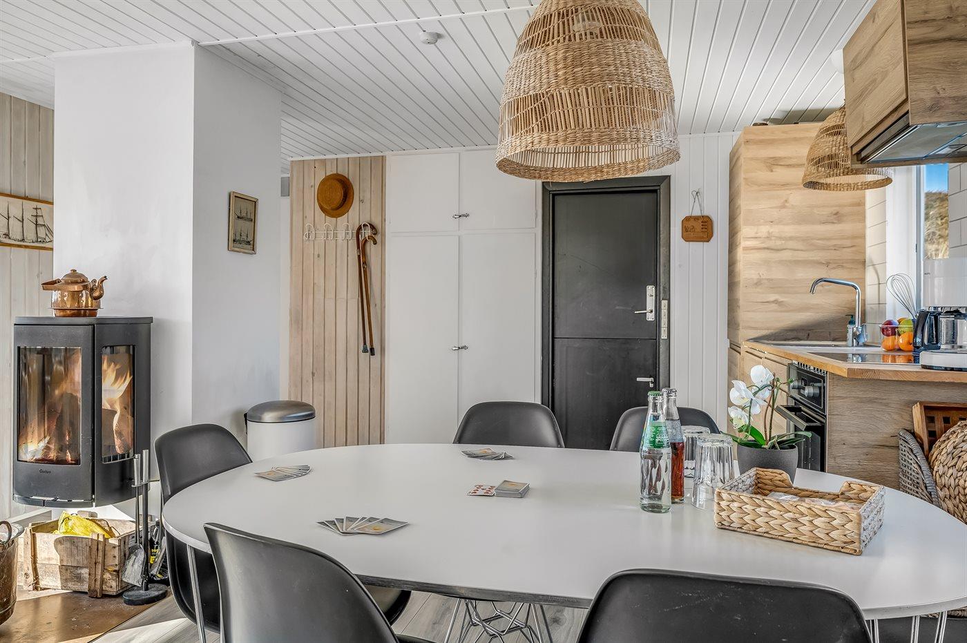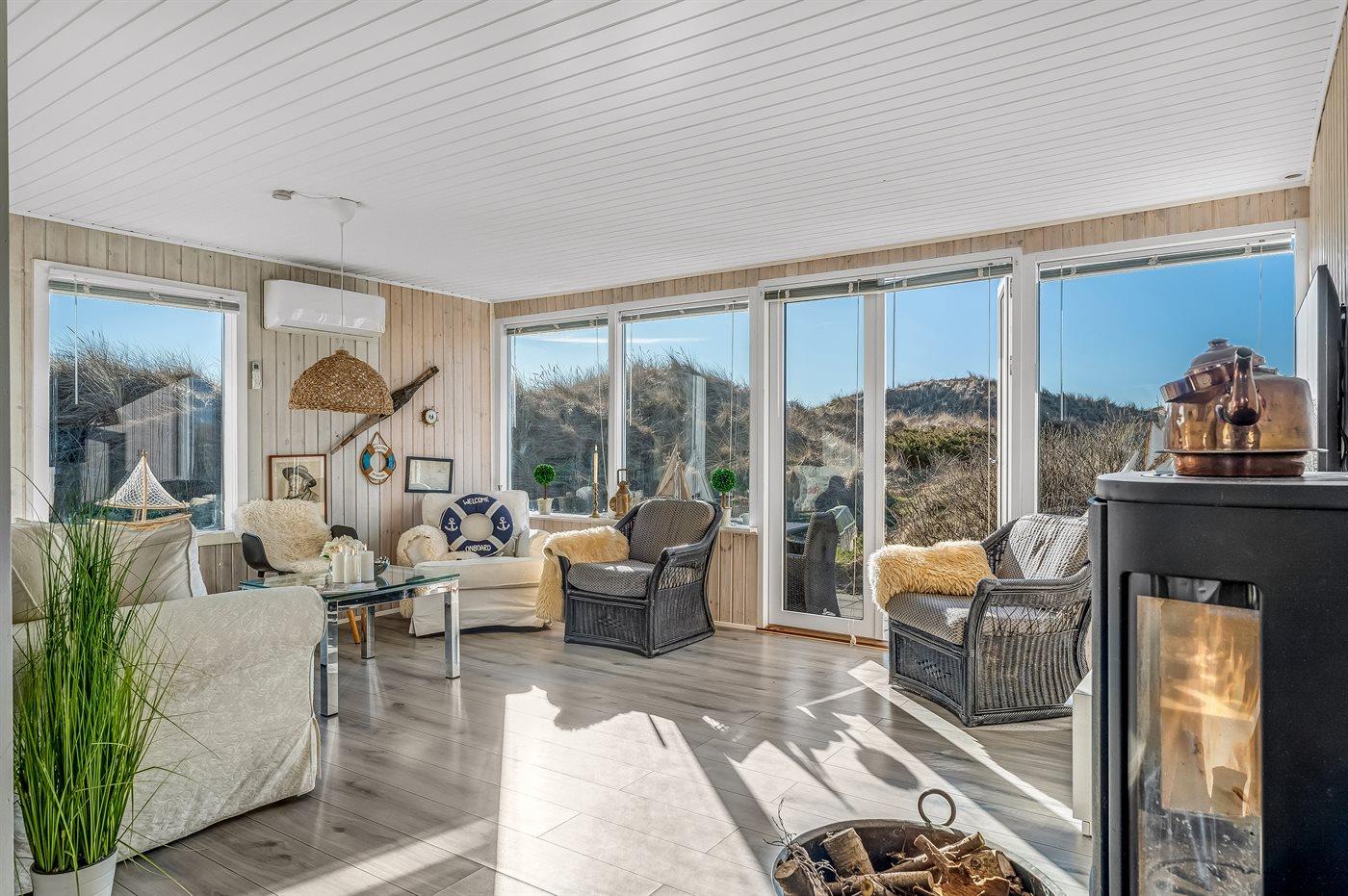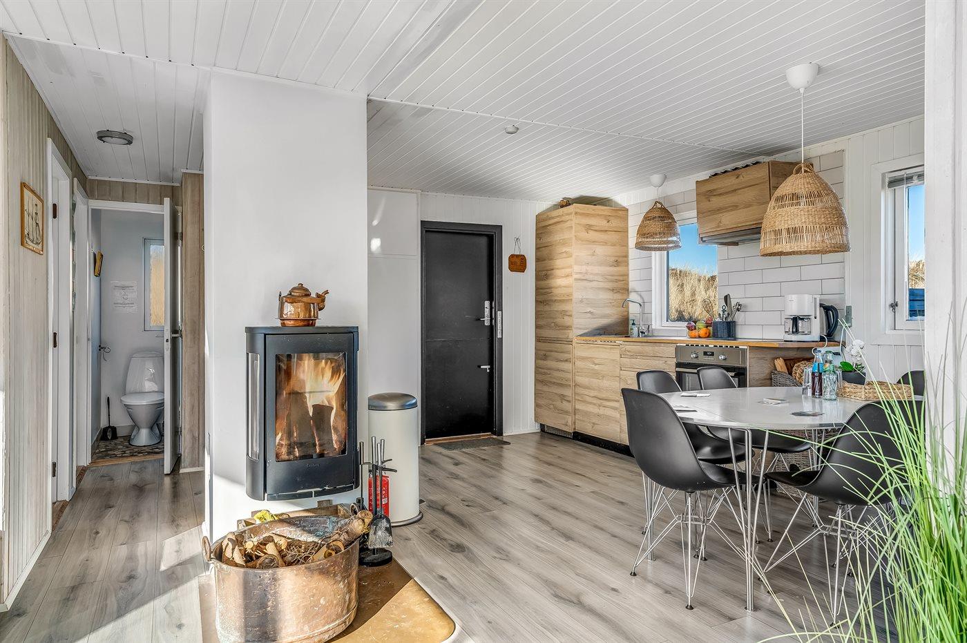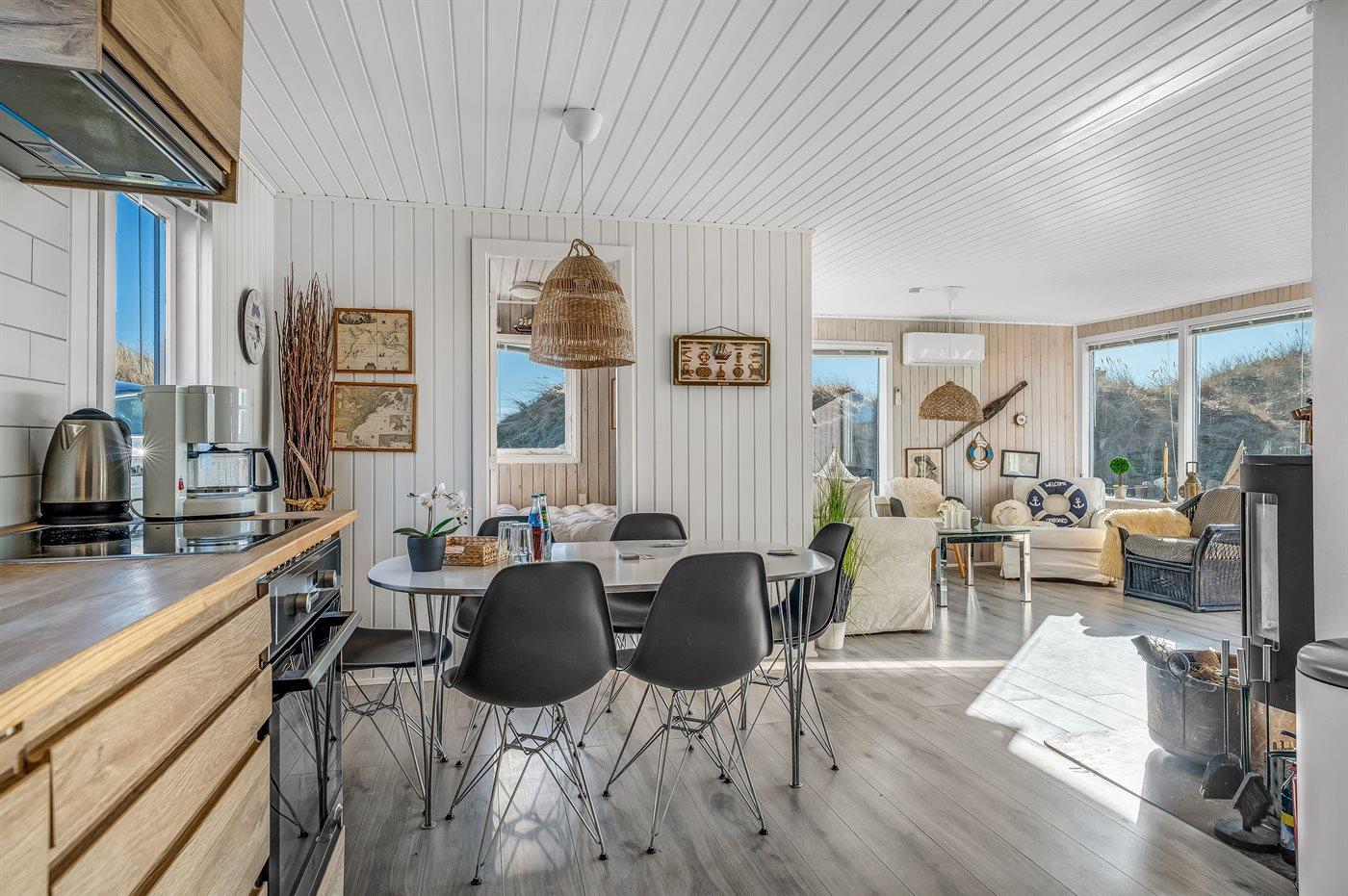 Huset er hyggeligt indrettet med lyse farver, klassiske detaljer og en varm atmosfære, der indbyder til afslapning. Her kan du nyde morgenkaffen på terrassen med udsigt over klitterne eller trække dig tilbage i de hyggelige opholdsrum efter en dag fyldt med naturoplevelser.