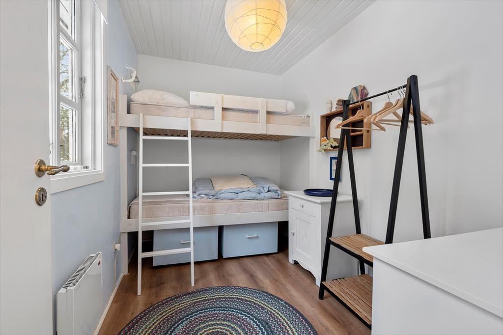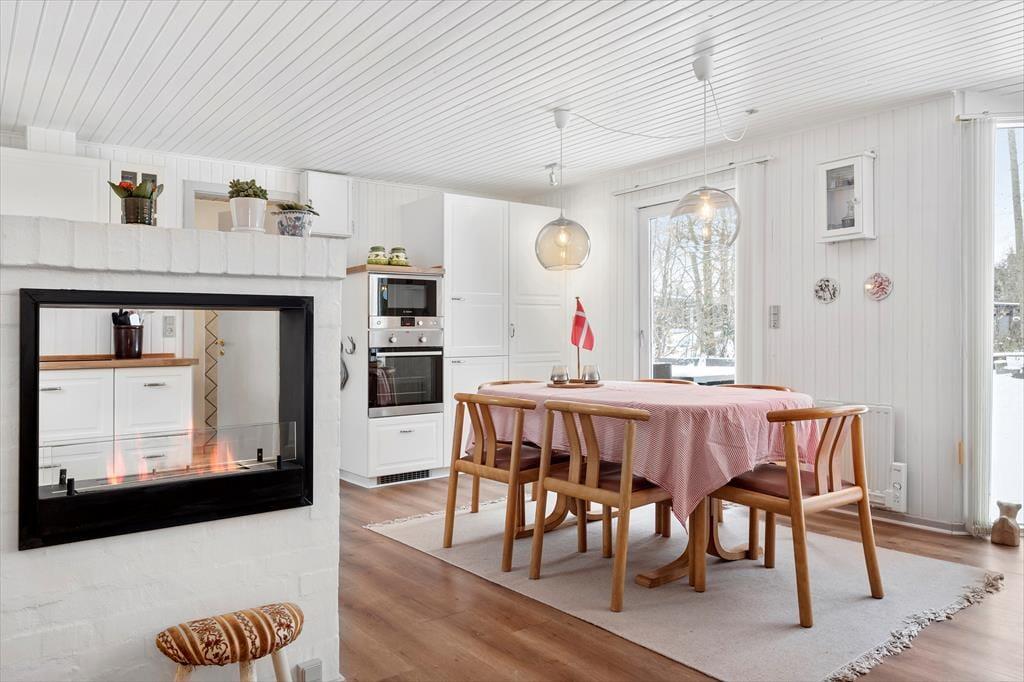 Indretningen i sommerhuset er både hyggelig og praktisk og du kan hurtigt føle dig hjemme i de behagelige rum. Farvetonerne er lette og lyse, og atmosfæren er charmerende. Ikke mindst i opholdsrummet, hvor en glaskarnap inviterer solen indenfor og giver udsigt til den grønne have. I den lille halvmur, der fungerer som rumdeler mellem køkkenet og stuen, er der installeret en biopejs, så du kan nyde synet af flammerne fra begge sider. Underholdning er der også i rummet i form af et fladskærms-tv med Chromecast, så du og familien kan hygge jer med film og serier om aftenen. Et rummeligt badeværelse og tre gode soveværelser hører med til planløsningen, så alt i alt passer huset godt til seks feriegæster.